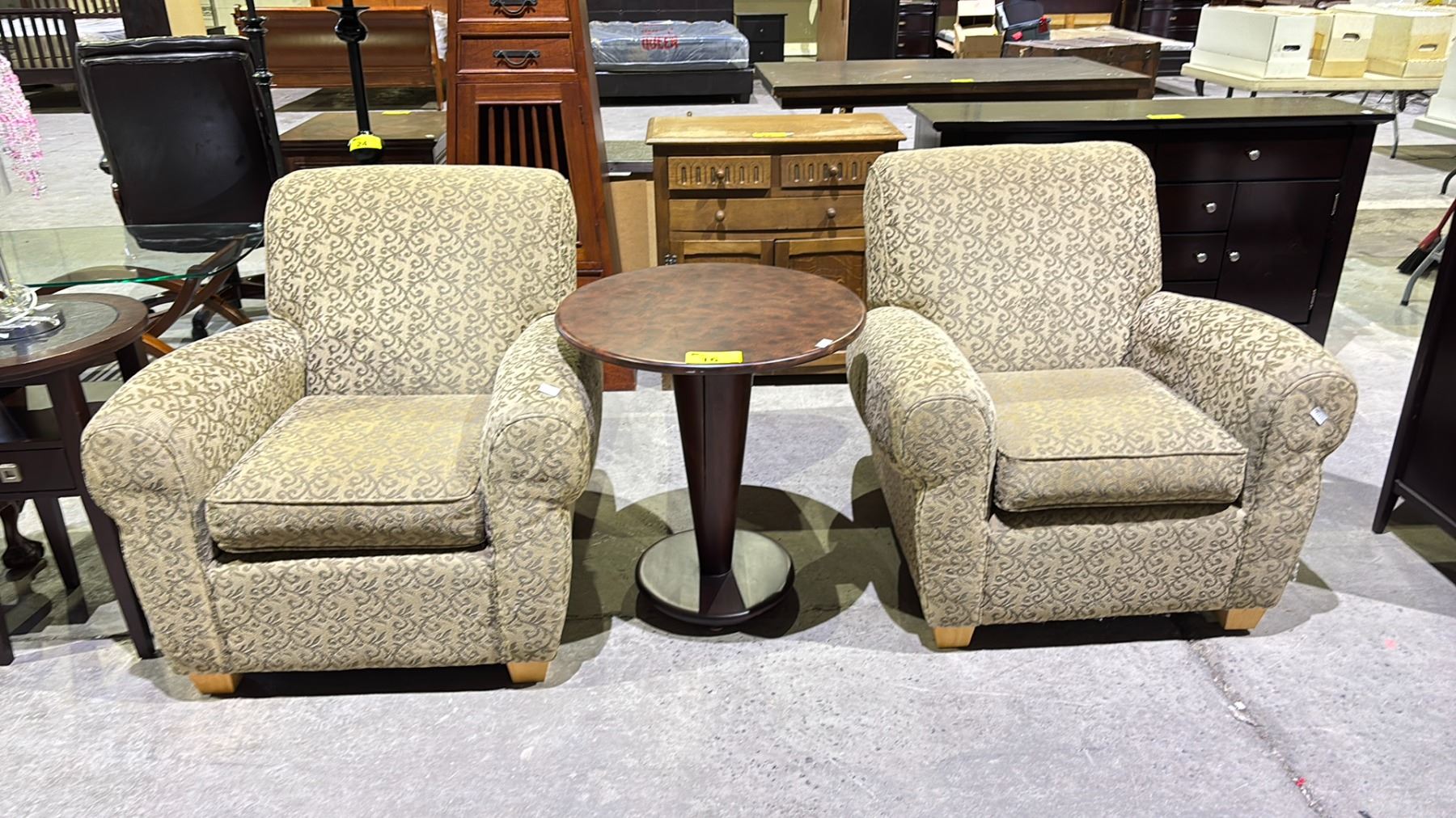 2 PATTERNED FABRIC LOUNGE CHAIRS & ROUND END TABLE 25" X 27" (CRACK IN BASE OF TABLE)