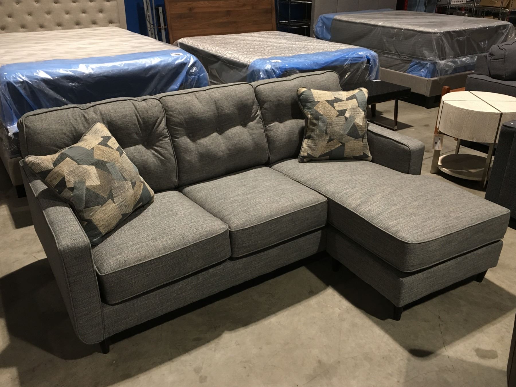 2 PCE GREY UPHOLSTERED SOFA CHAISE LOUNGER WITH 2 THROW CUSHIONS