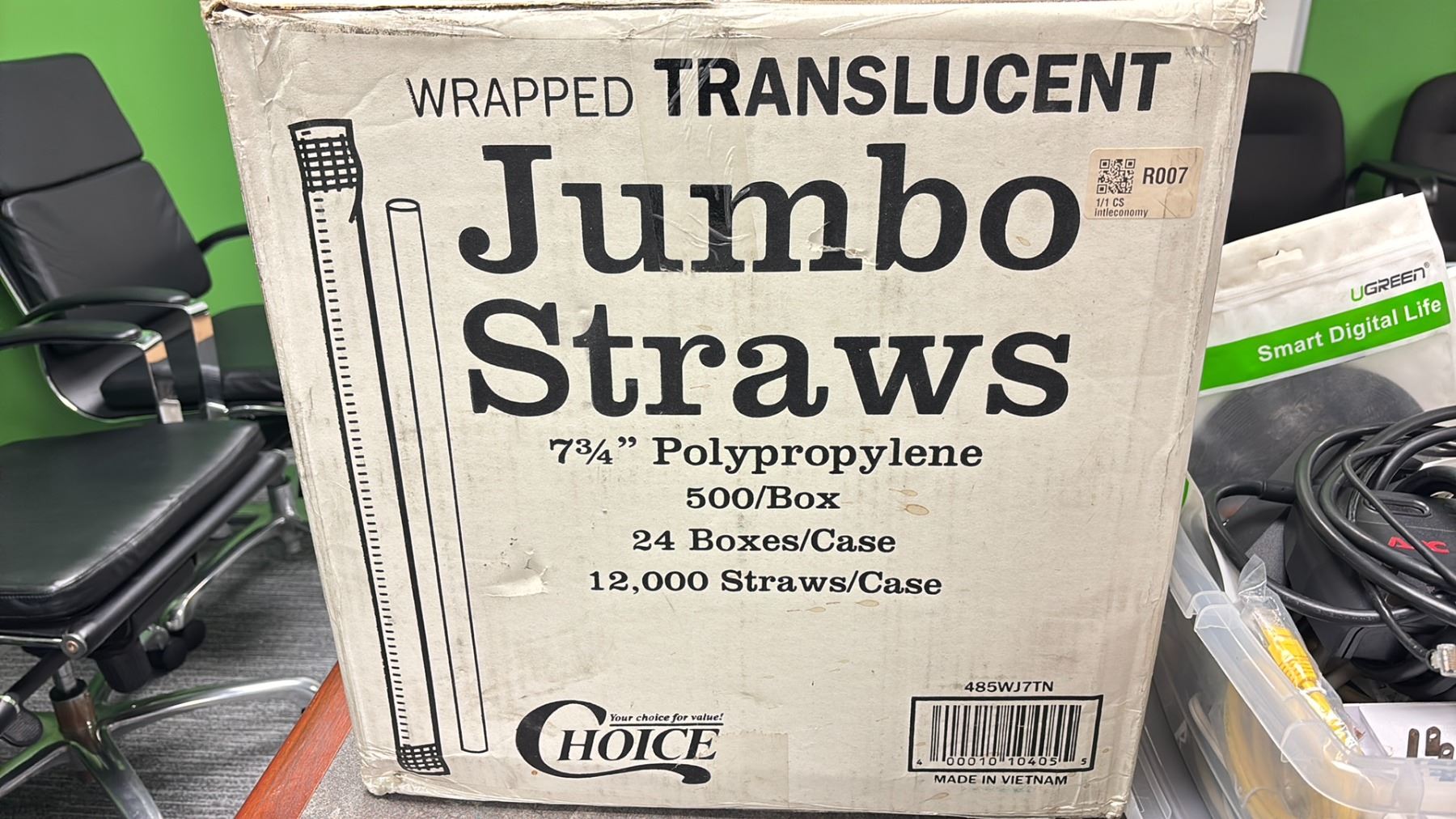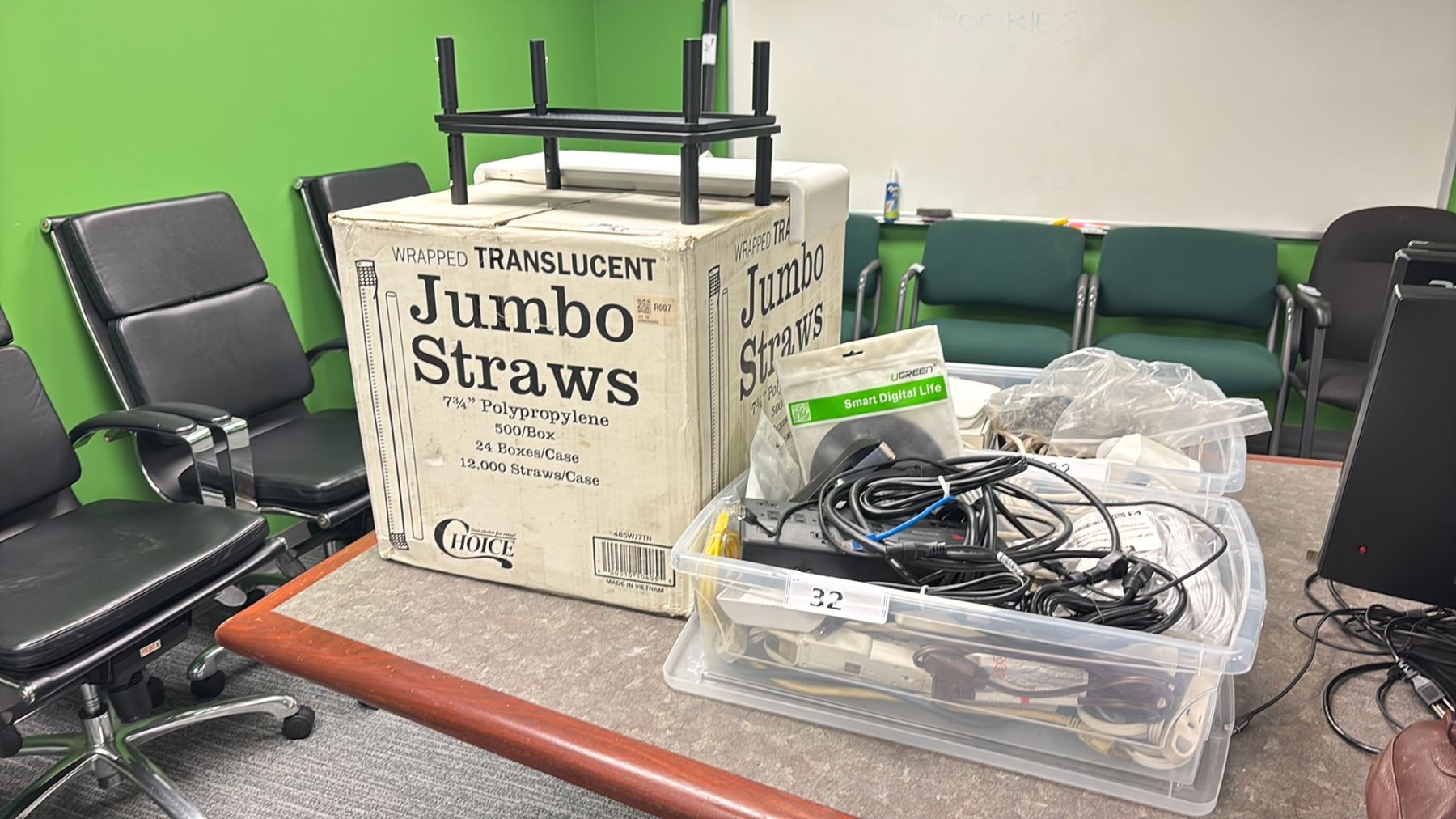 2 PLASTIC BINS OF ASSORTED ELECTRICAL CORDS, POWER CORDS, INTERNET CABLES, POWER BARS, A62 WIFI ACCESS POINTS, 3 KEYBOARD TRAYS & A LARGE BOX OF PLASTIC STRAWS