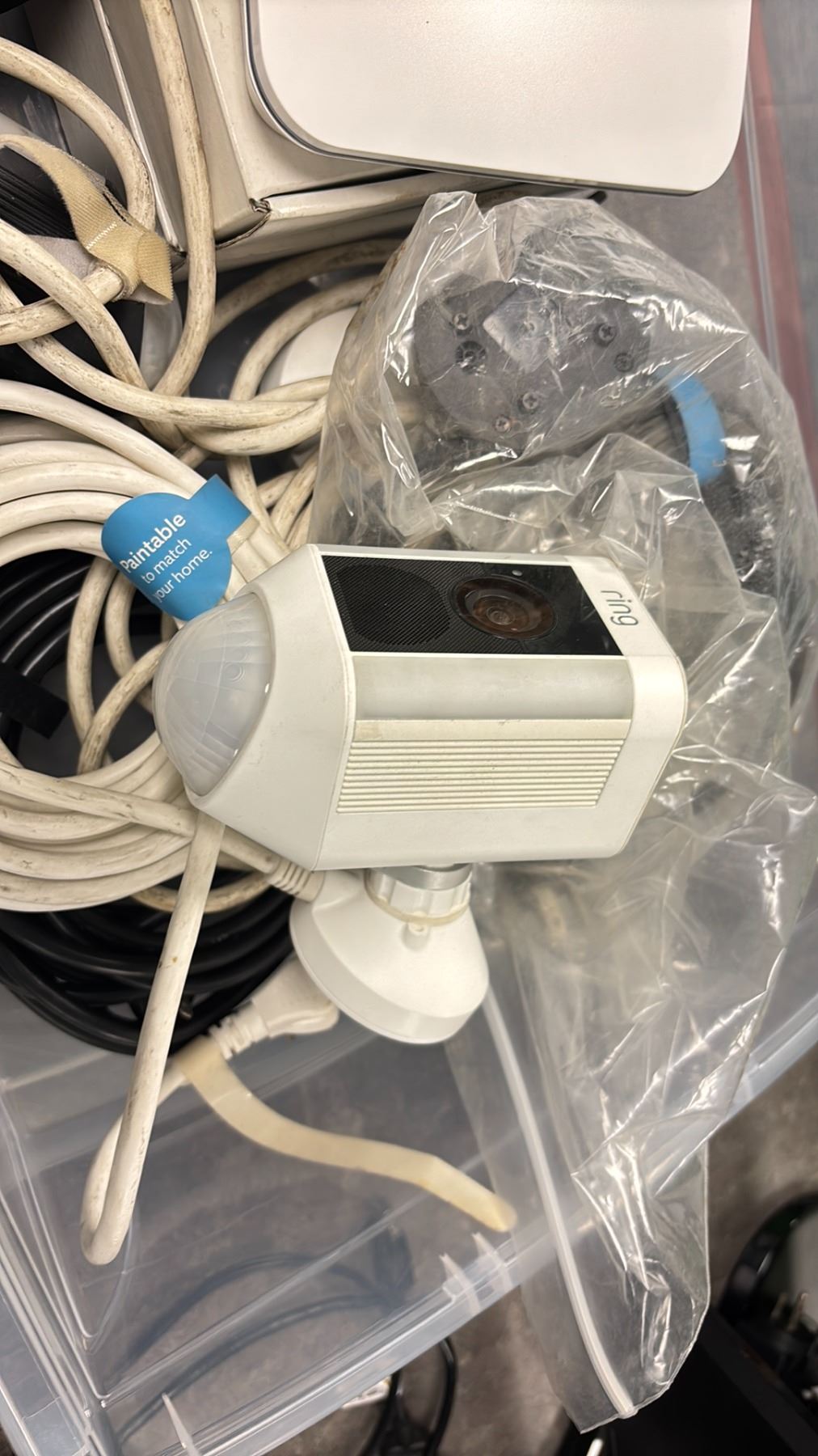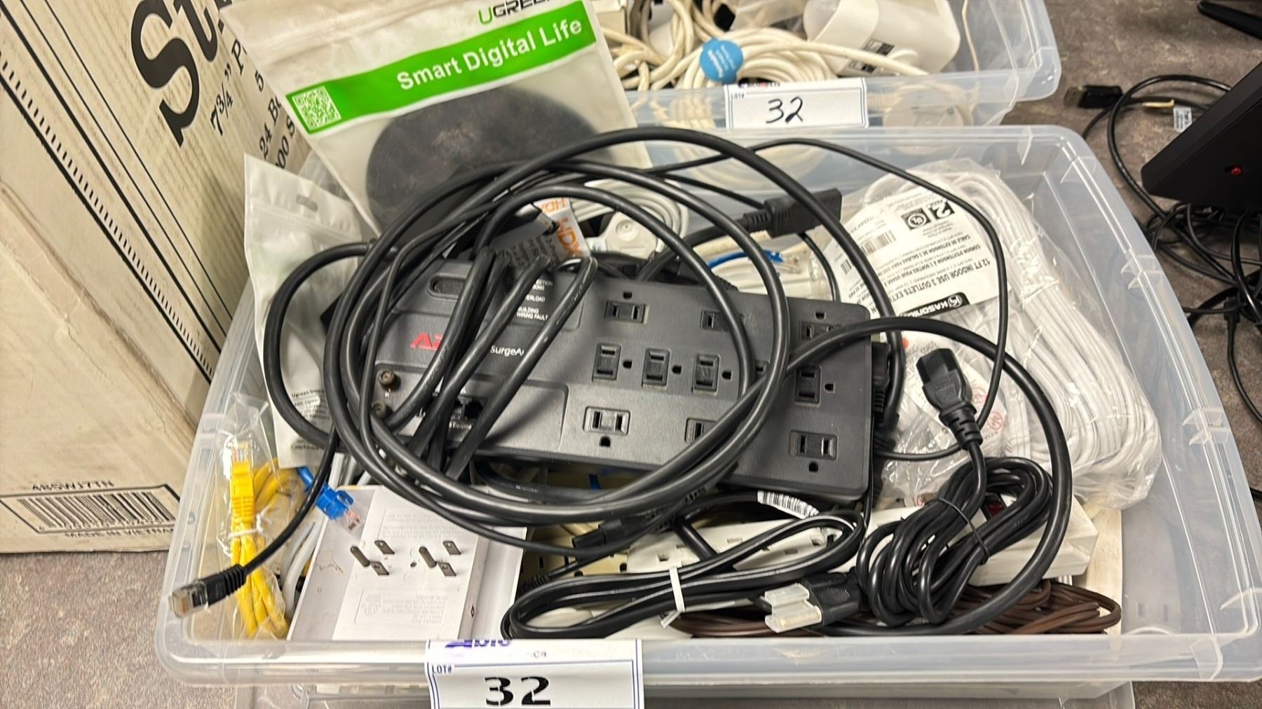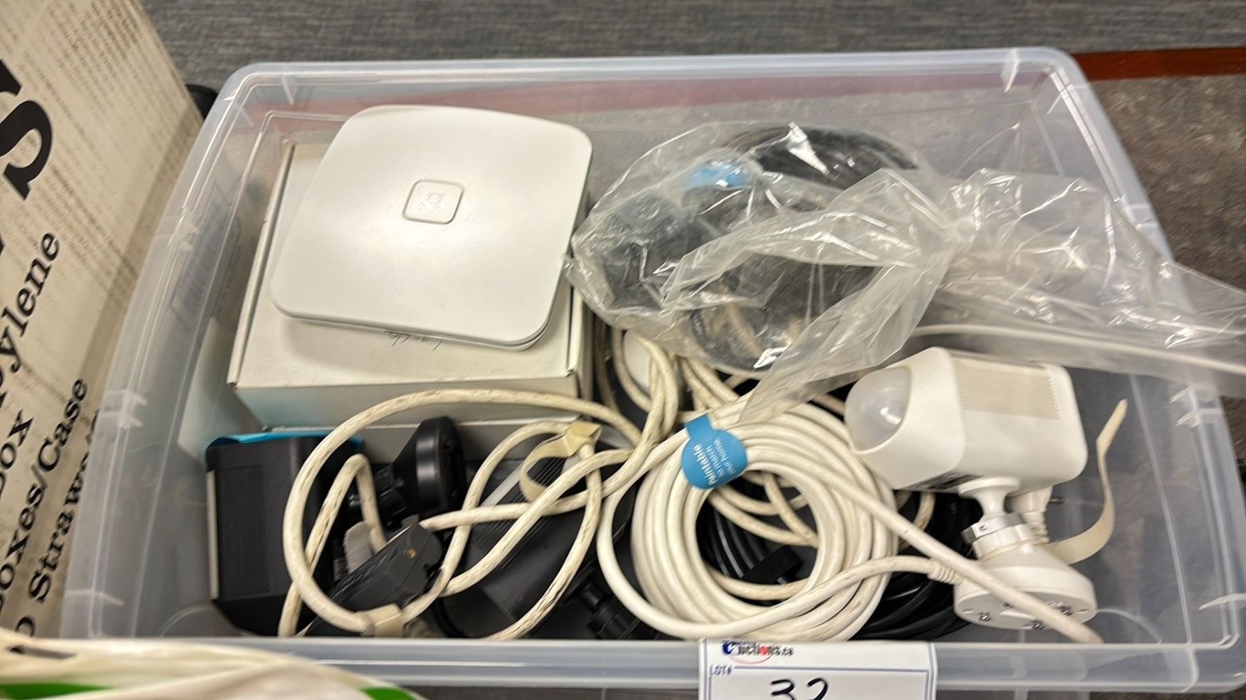 2 PLASTIC BINS OF ASSORTED ELECTRICAL CORDS, POWER CORDS, INTERNET CABLES, POWER BARS, A62 WIFI
