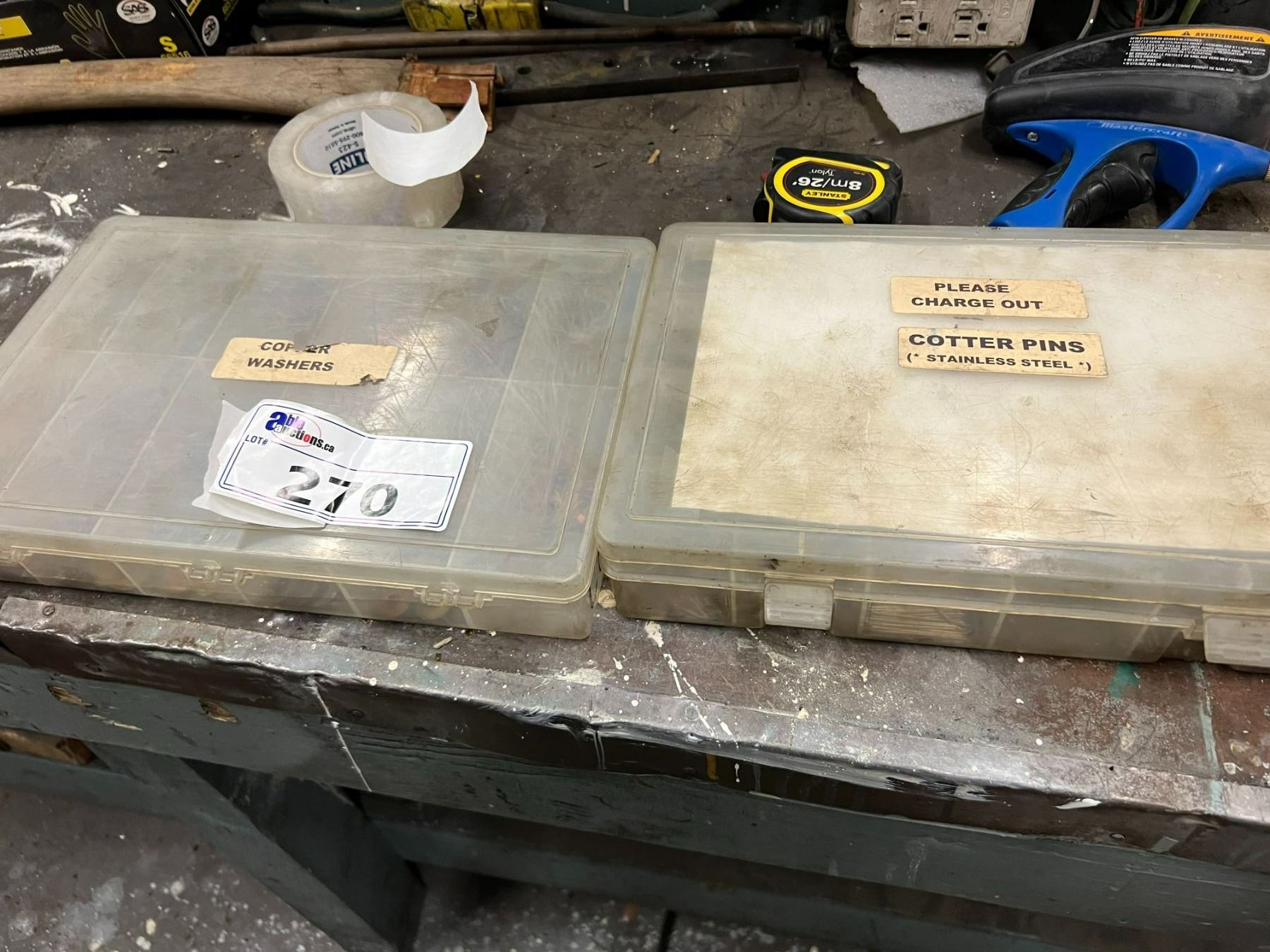 2 PLASTIC BINS OF COPPER WASHERS AND STAINLESS COTTER PINS