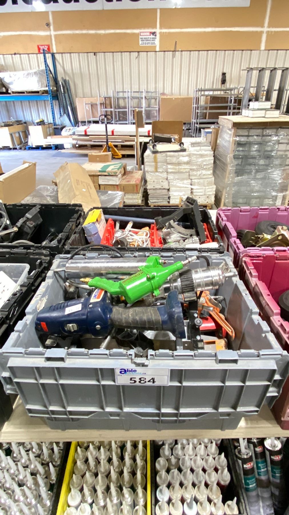 2 PLASTIC FOLD TOP BINS OF INDUSTRIAL HARDWARE, GREASE GUNS, CAULKING GUNS, & C-CLAMPS *BINS