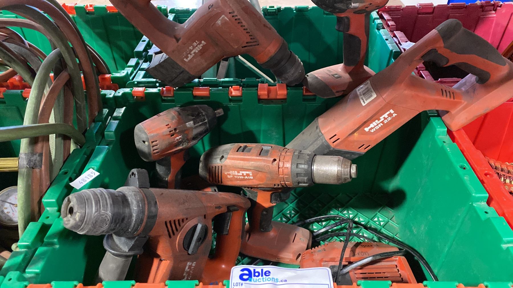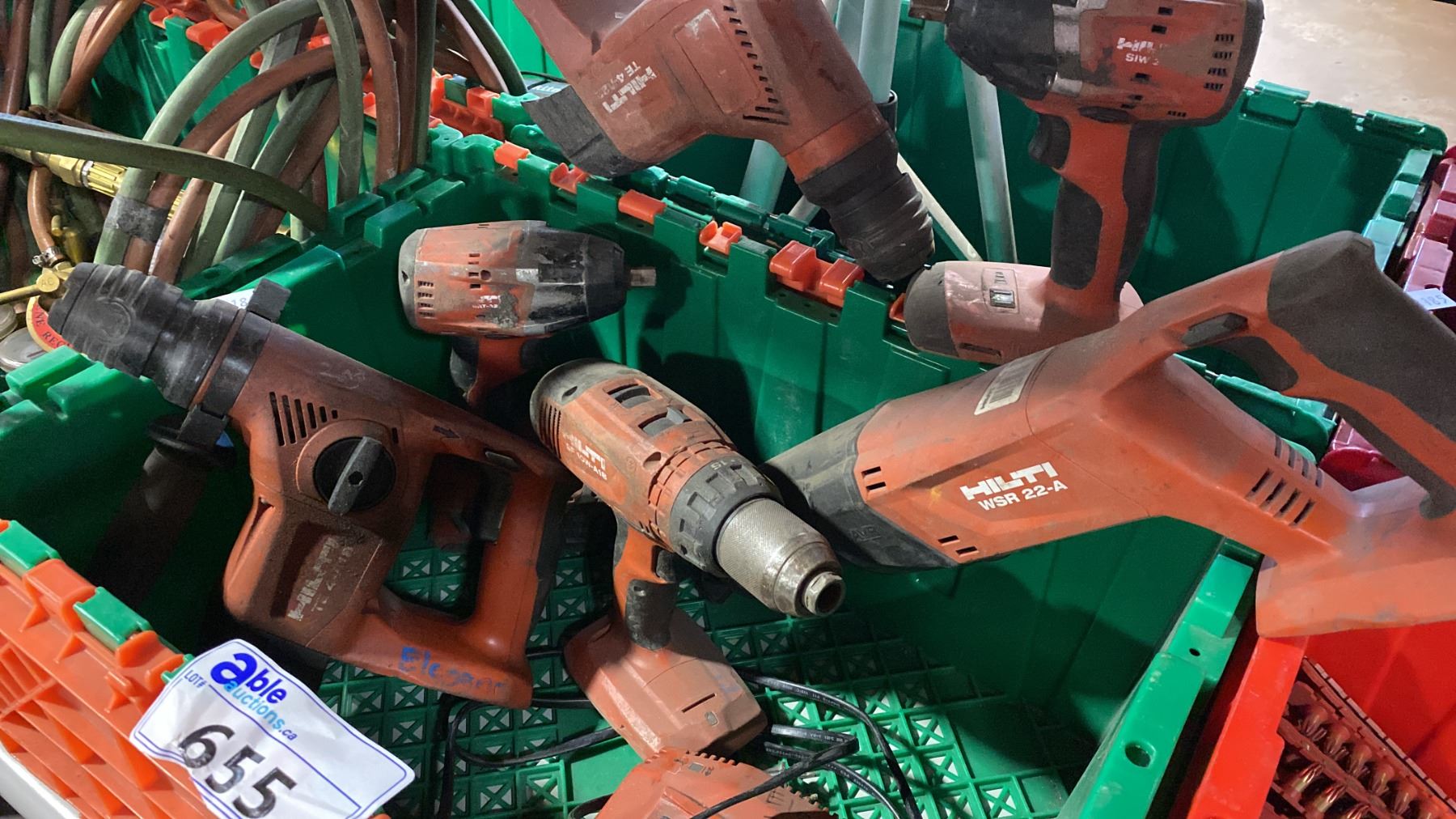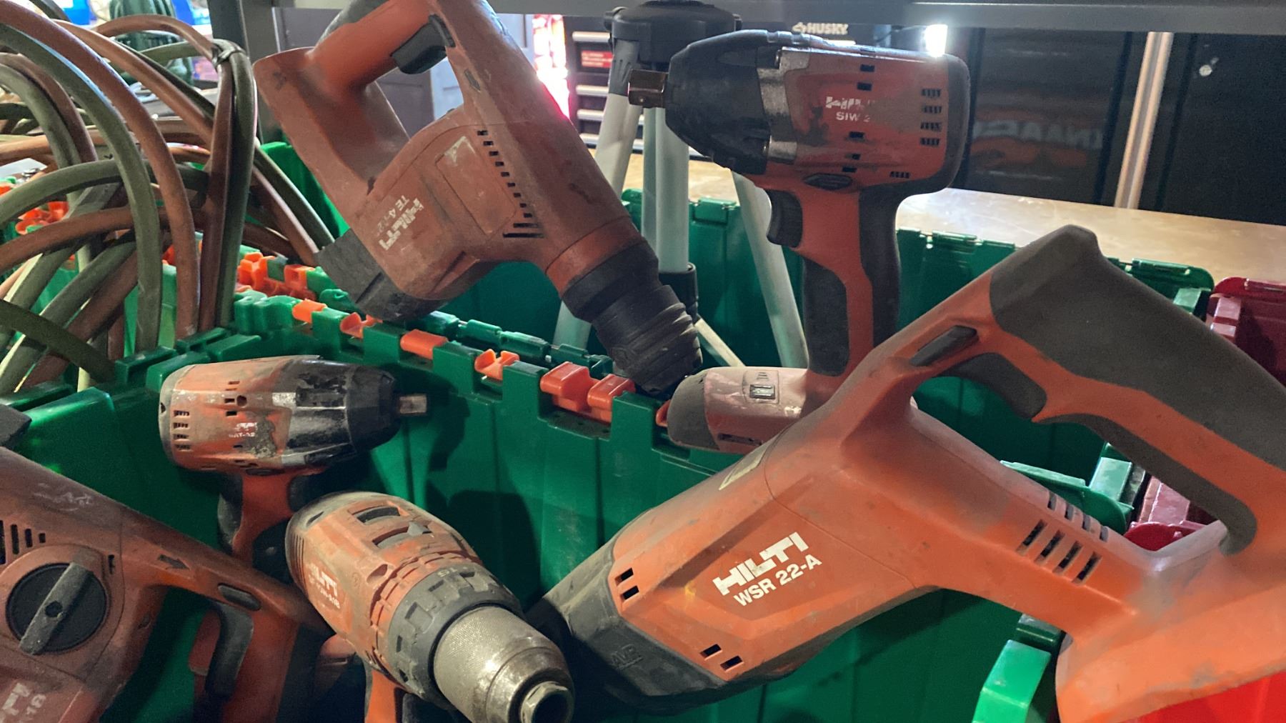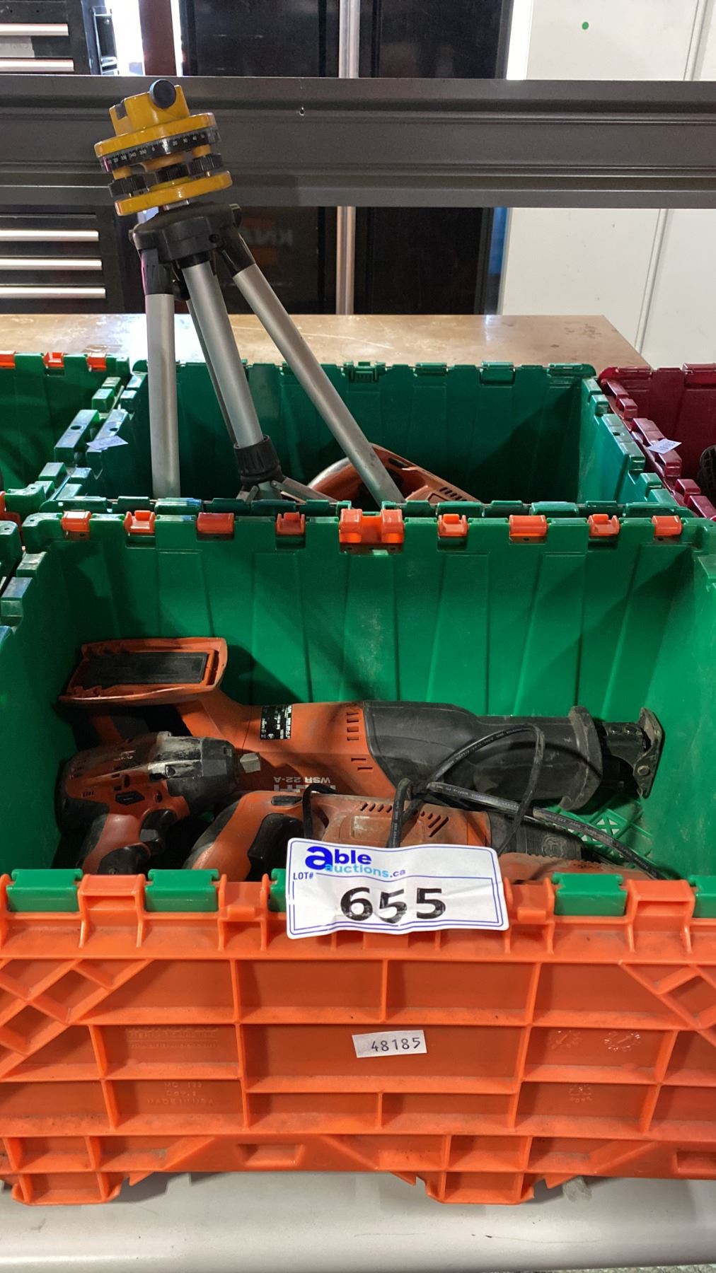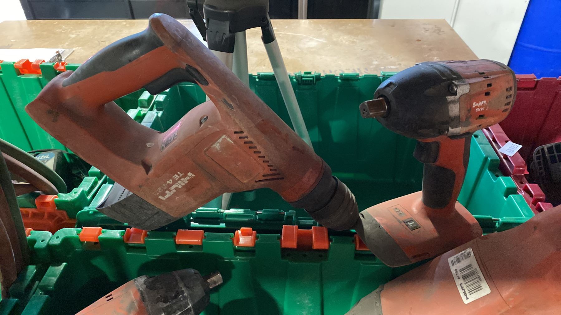 2 PLASTIC STORAGE BINS AND CONTENTS- 6 HILTI CORDLESS POWER TOOLS WITH 1 BATTERY, CHARGER & SURVEYORS TRIPOD