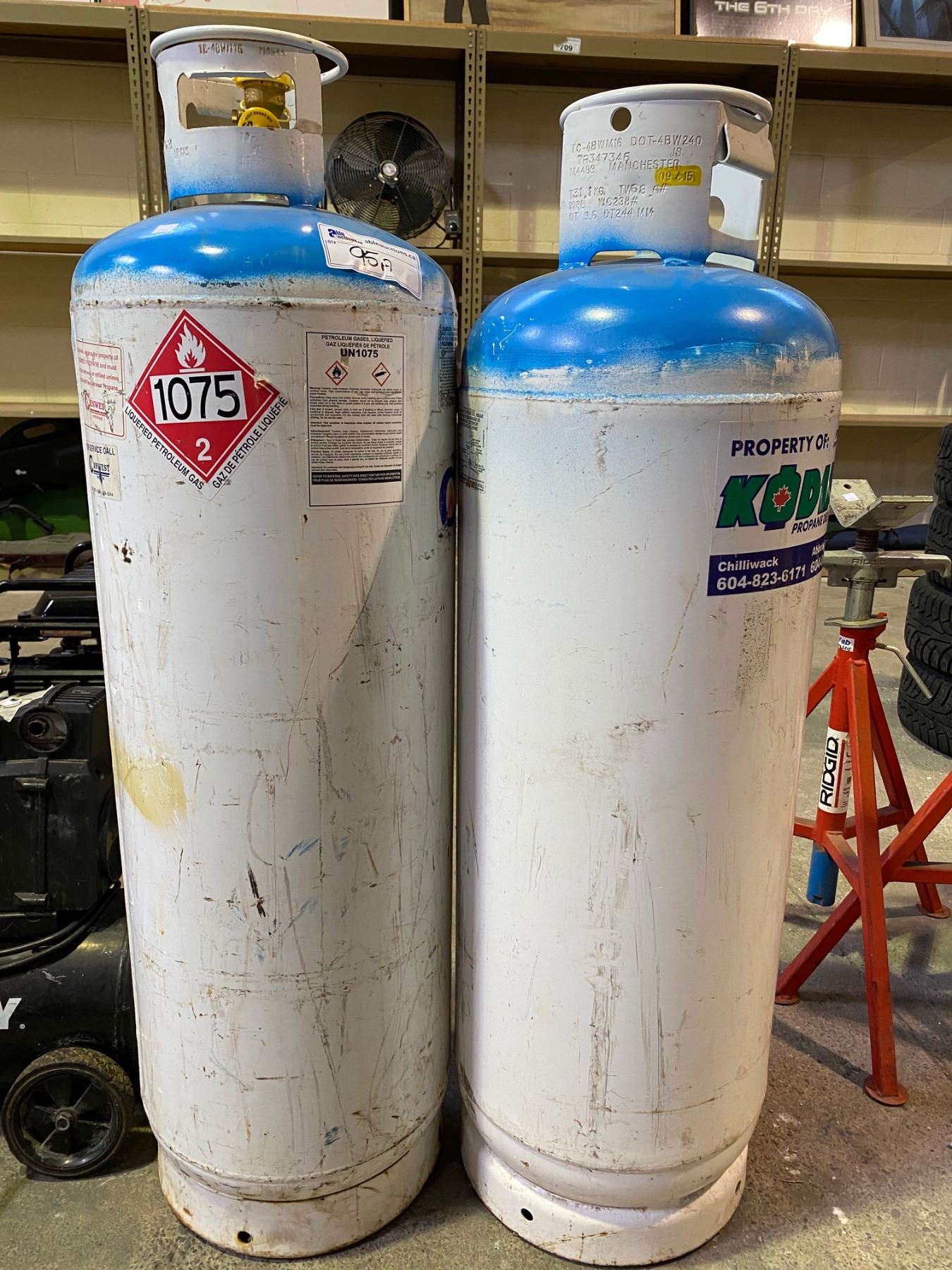 2 PROPANE CYLINDERS 16" DIAMETER 4FT TALL, 1 FULL