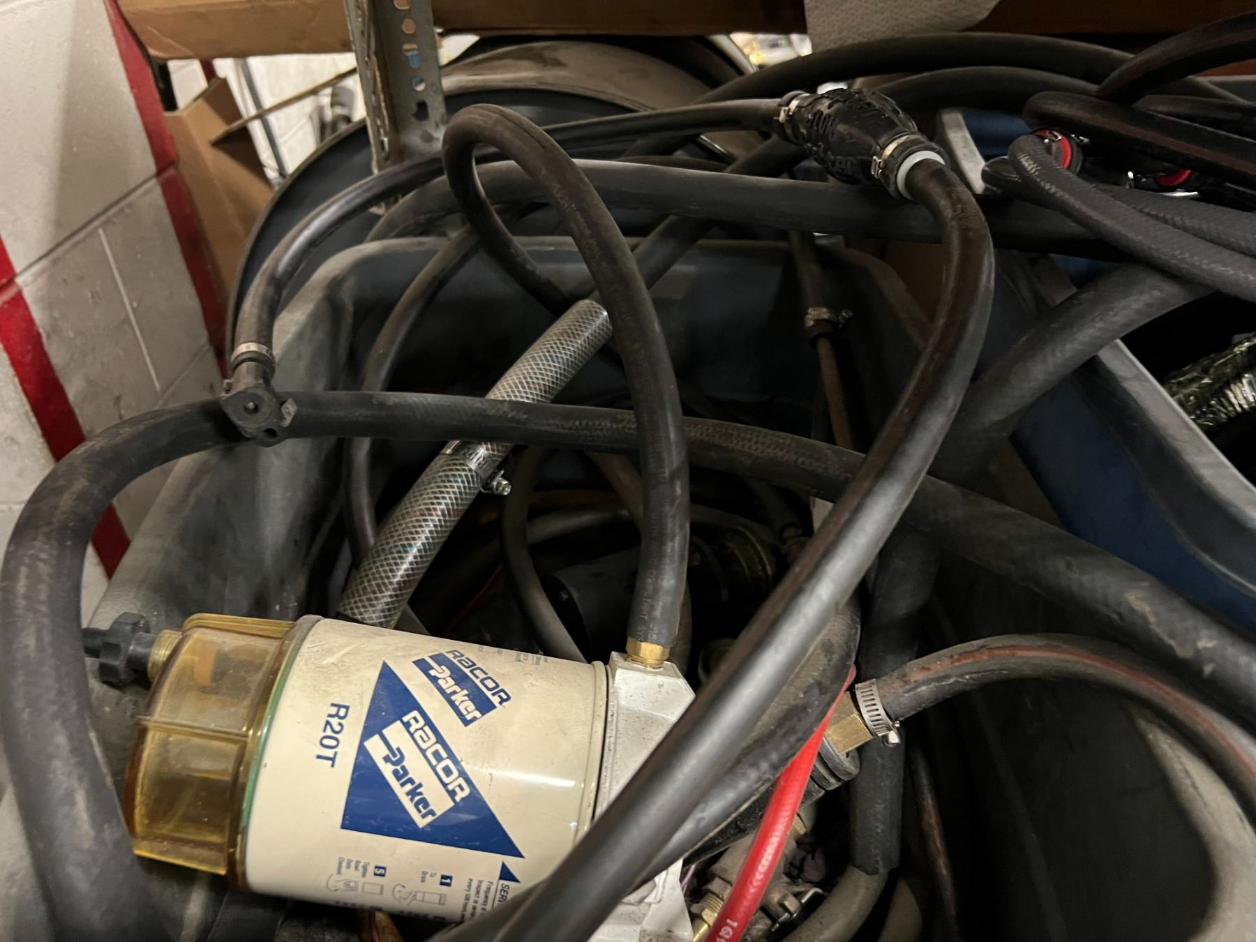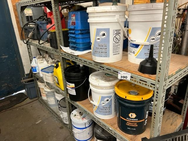 2 RACKS WITH ASST OIL PRODUCTS AND CONTAINERS. BILGE CLEANER, GUN WASH SOLVENT, FIBREGLASS RESIN, HYDRAULIC FLUID, SYNTHETIC ENGINE OIL, KEROSENE, KLEENFLO, COMMERCIAL SANITIZER, DIESEL FUEL, BOAT FUEL LINES, 2 OUTBOARD FUEL TANKS, ASST FITTINGS, ETC