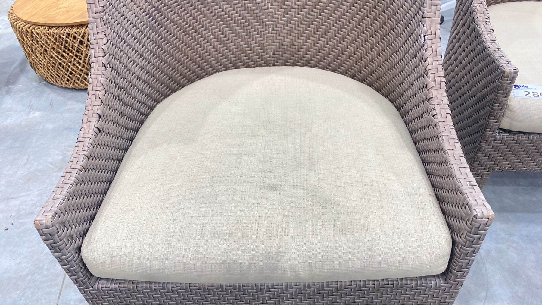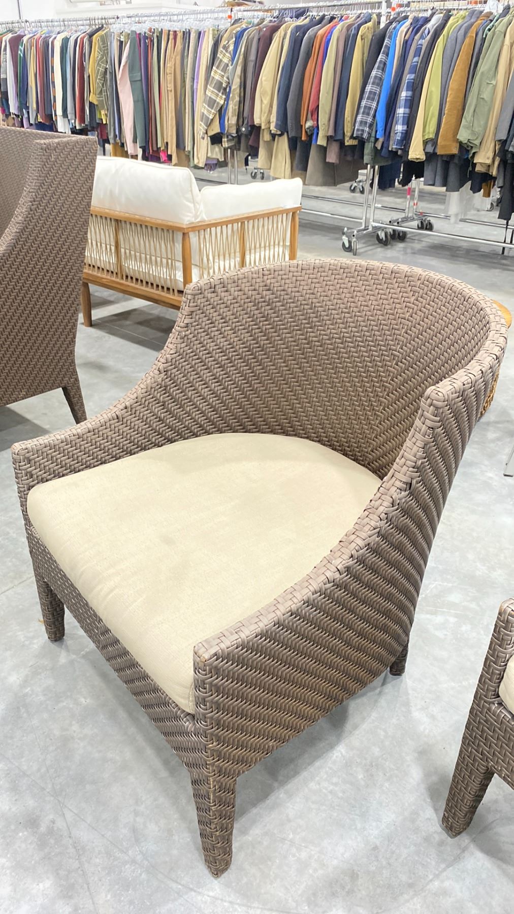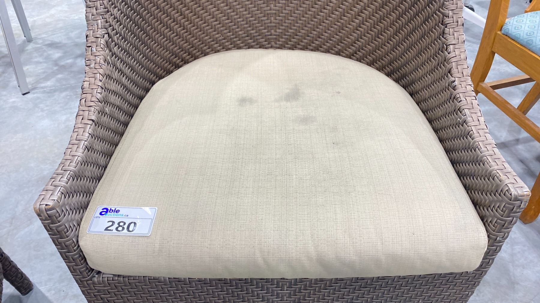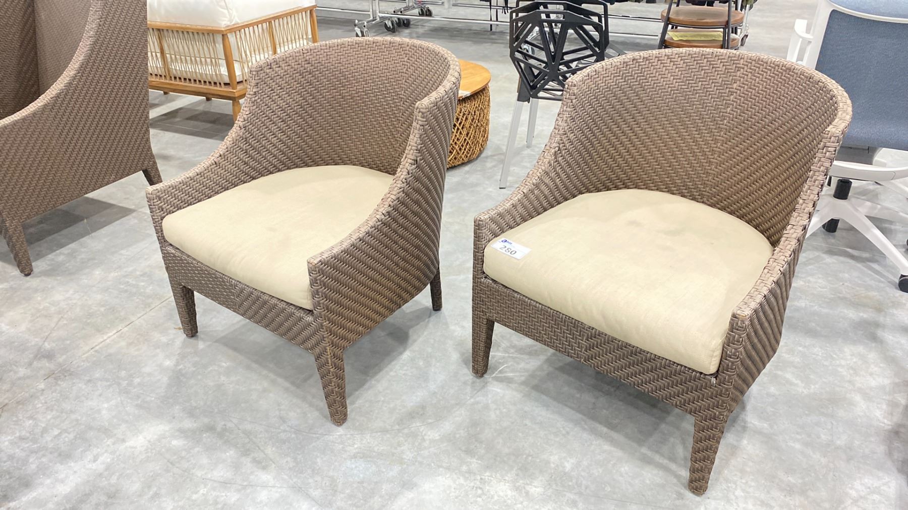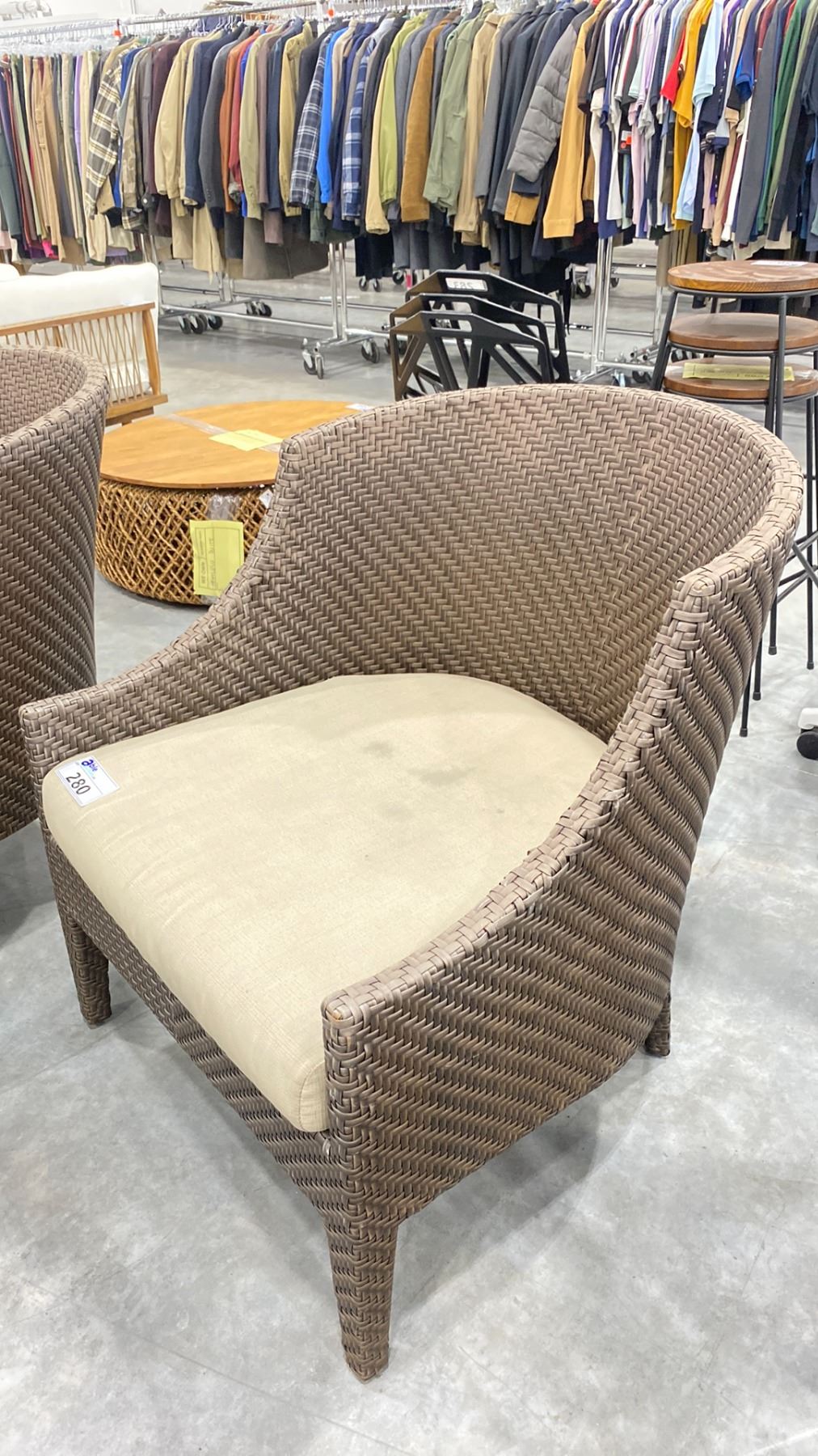 ( 2 ) RATTAN LOOK OUTDOOR PATIO CHAIRS WITH BEIGE CUSHIONS