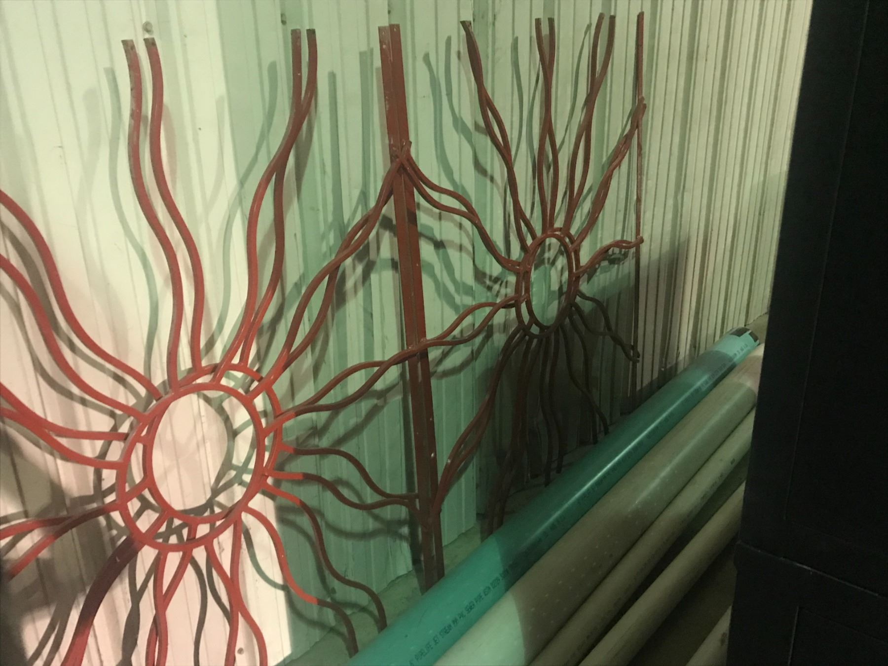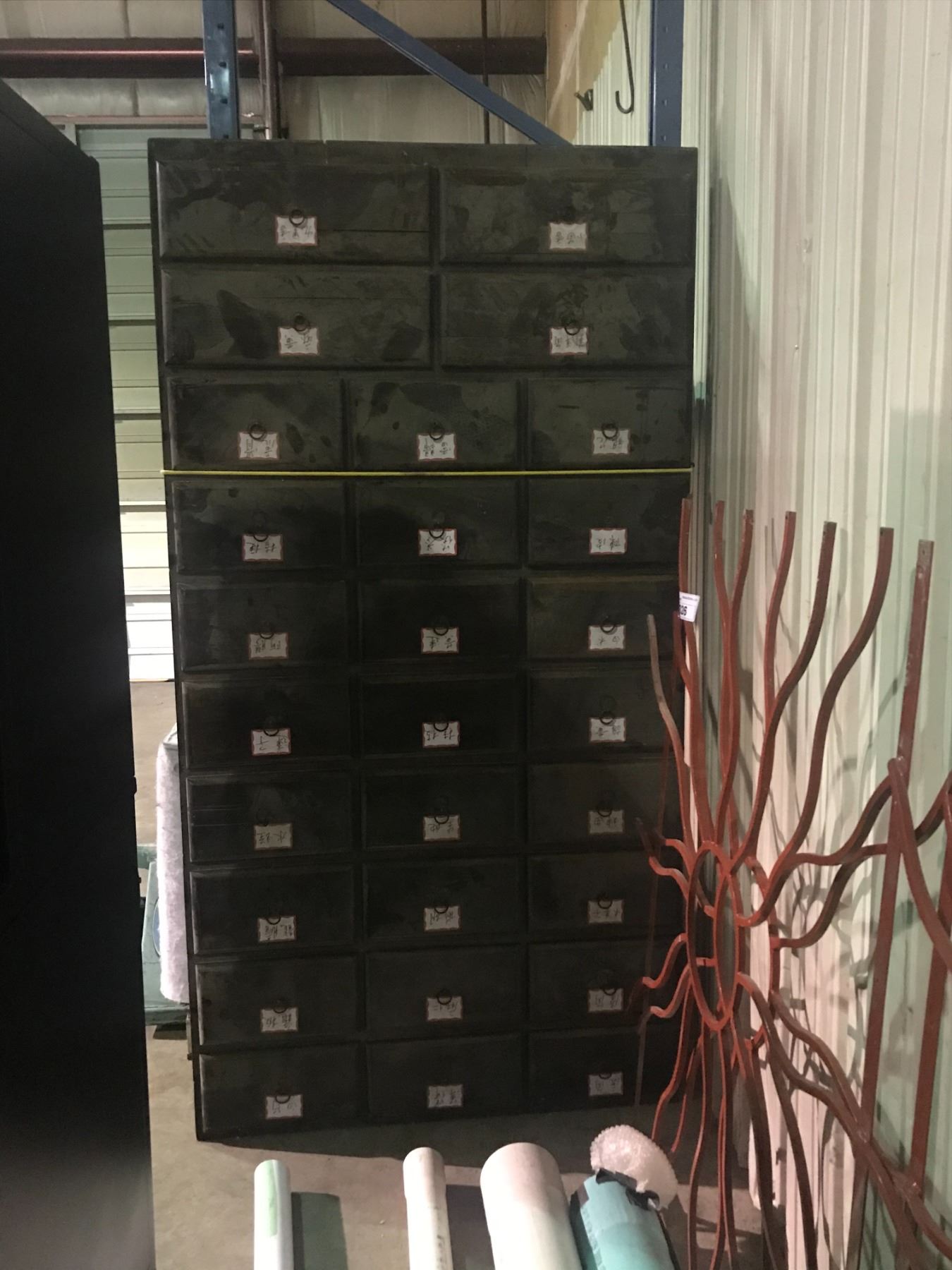 2 RED METAL SUN SECURITY PANELS, FAUX 28 DRAWER WALL CABINET & ASSORTED PVC PIPE