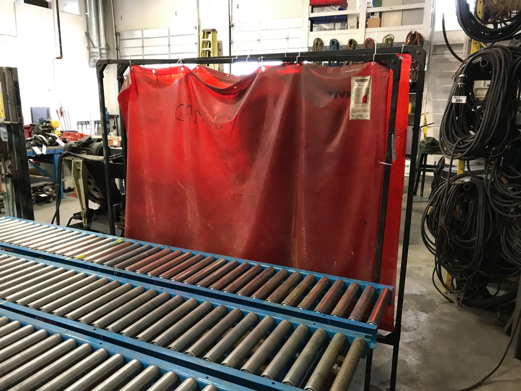 2 RED WELDING SCREENS & JANITORIAL CABINET WITH CONTENTS