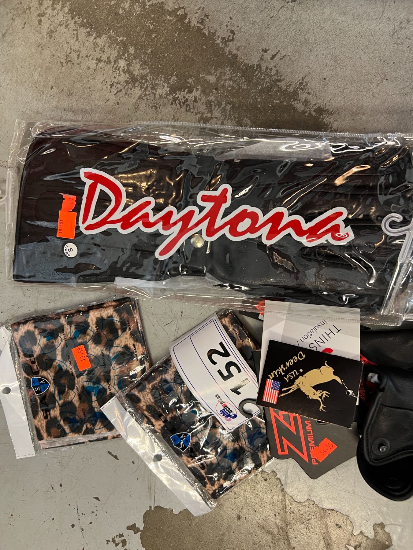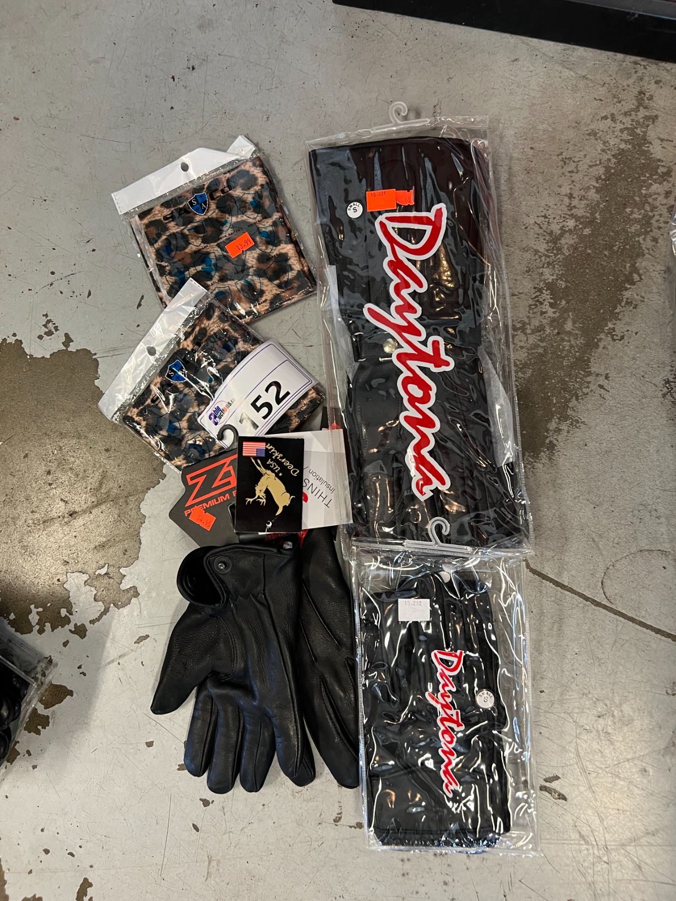 2 SACO UNIVERSAL BANDANAS, 1 PAIR Z1R WOMENS GLOVES (SIZE S), DAYTONA LEATHER RIDING GLOVES SHORT (SIZE S), DAYTONA LEATHER RIDING GLOVES LONG (SIZE S)