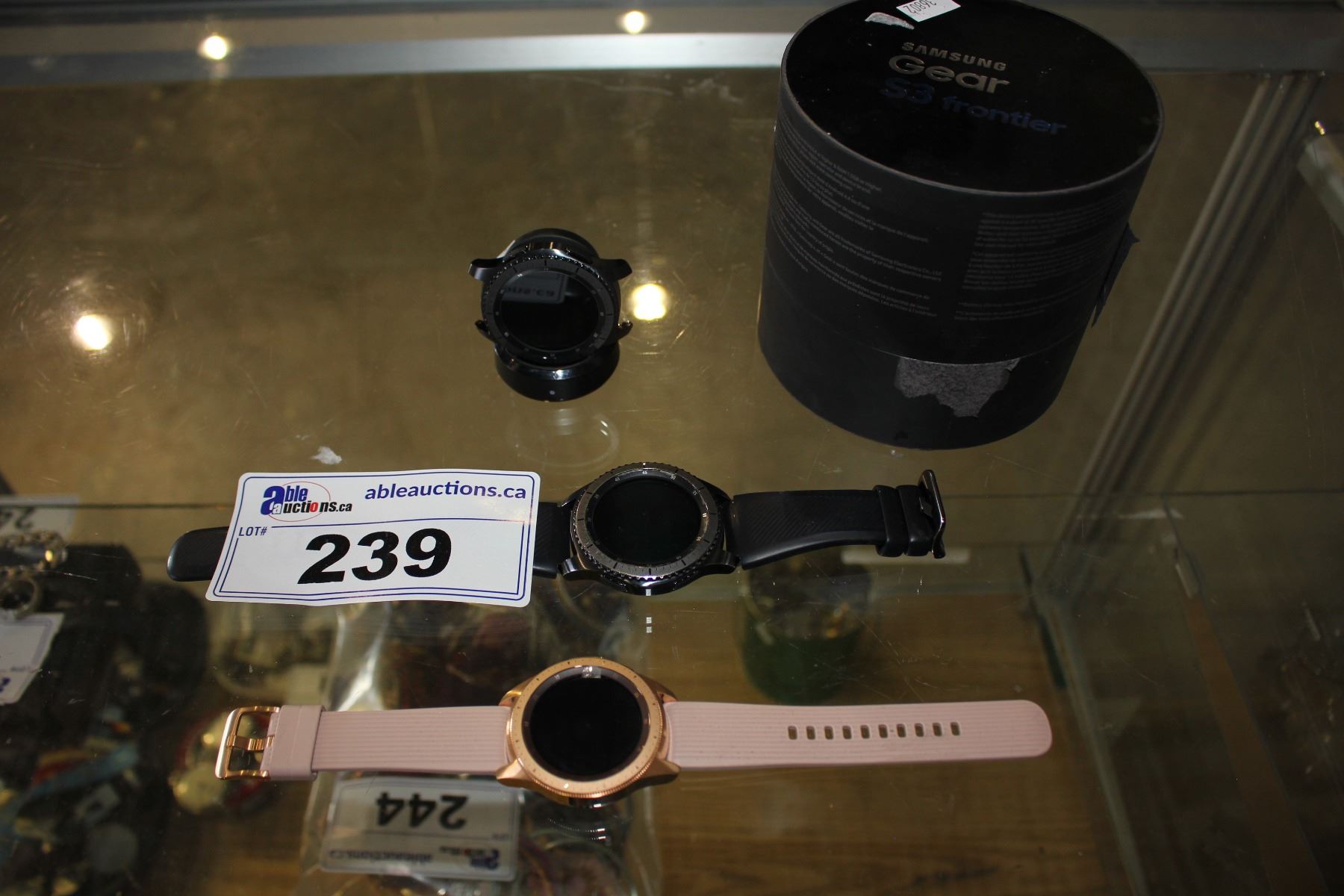 2 SAMSUNG GEAR S3 FRONTIER SMARTWATCHES, PINK SAMSUNG GALAXY SMARTWATCH, AND CHARGING STAND