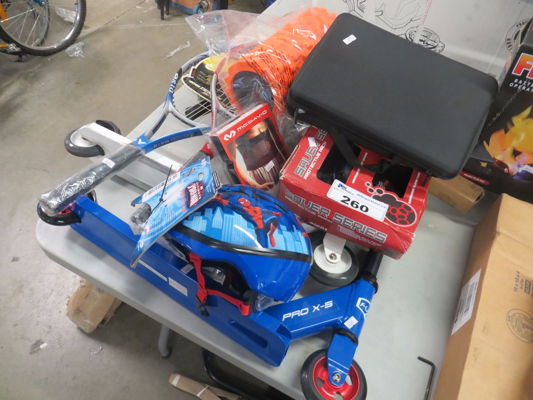 2 SCOOTERS/TENNIS RACKETS/MISC SPORTS SAFTEY GEAR