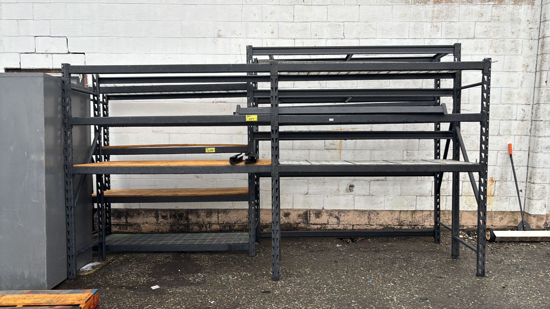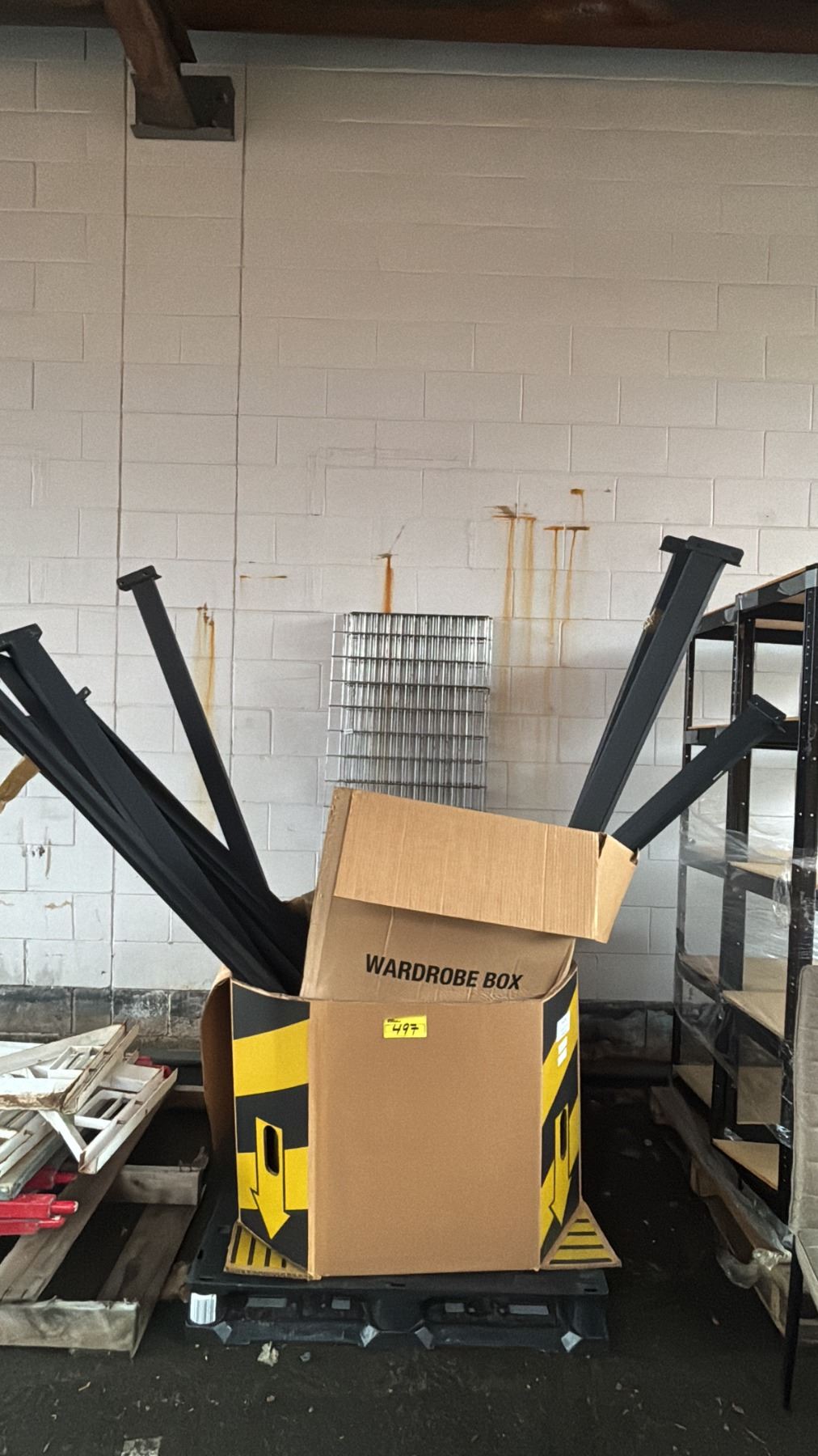 2 SECTIONS OF EZ RECT SHELVING & A PALLET OF CROSSBARS & MESH RACKING