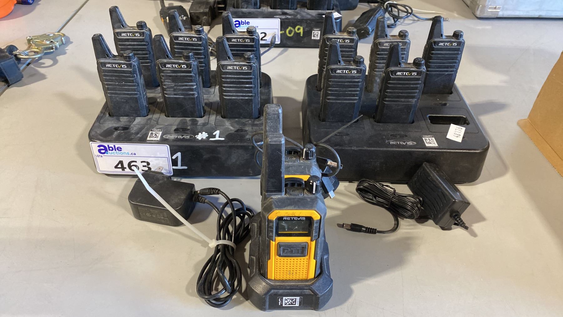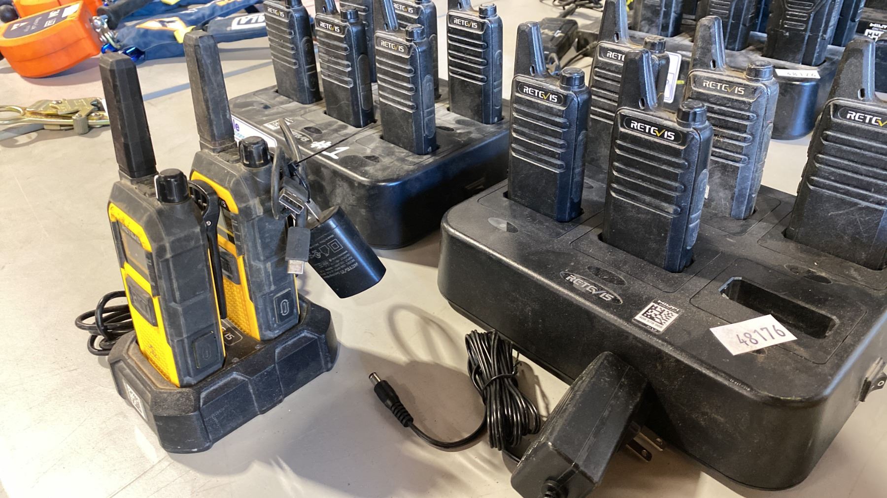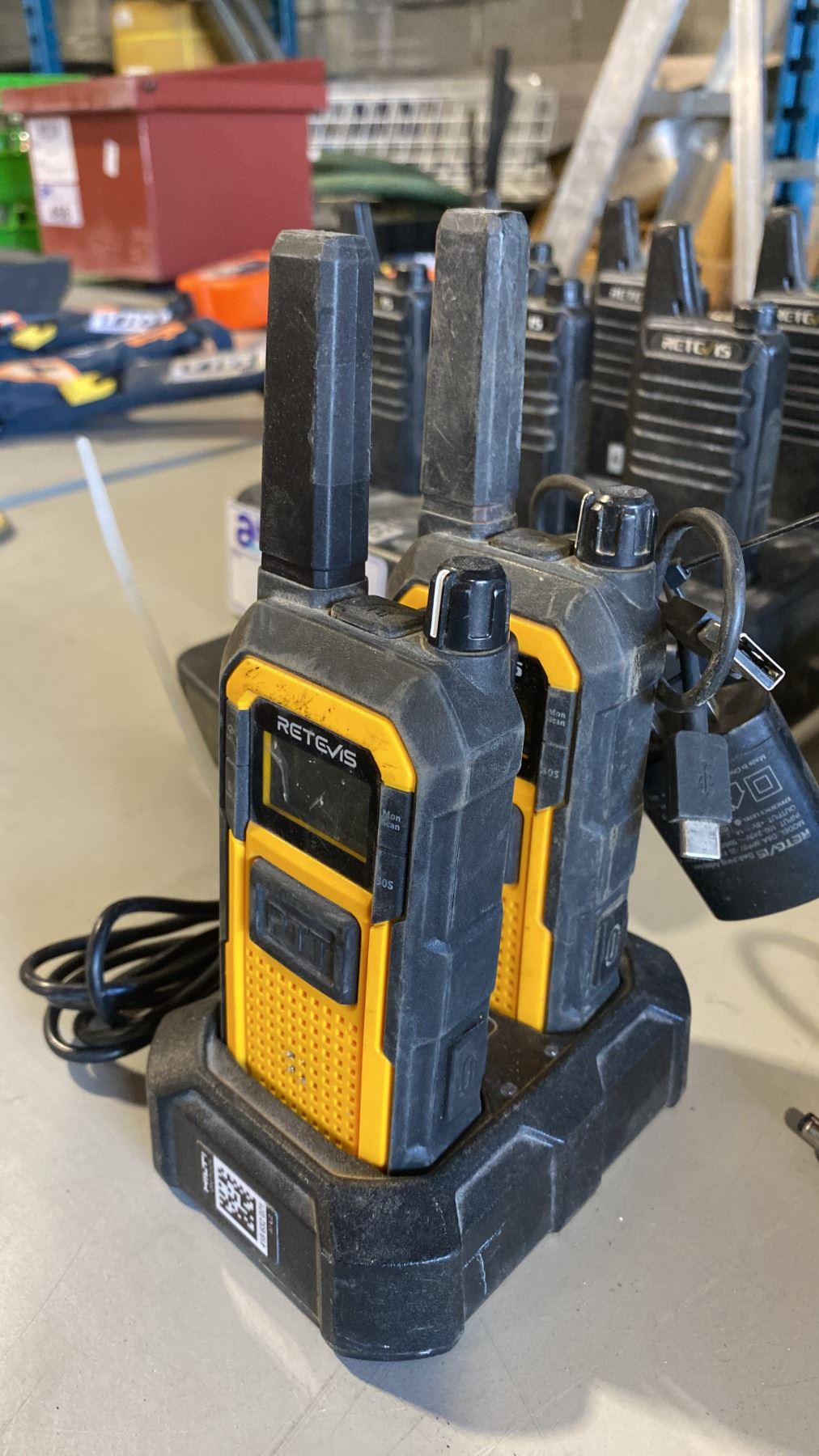 2 SETS OF 6 RETEVIS WALKIE TALKIES (1 MISSING 11 TOTAL) AND SET OF 2 RETEVIS YELLOW AND BLACK WALKIE TALKIES