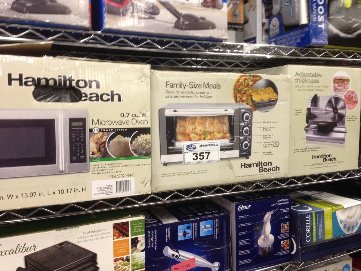 2 SHELF LOT OF ASSORTED HOUSEHOLD ITEMS INCLUDING HAMILTON BEACH MICROWAVE, MEAT SLICER, EXCALIBUR DEHYDRATOR,OSTER HAND BLENDER ETC.