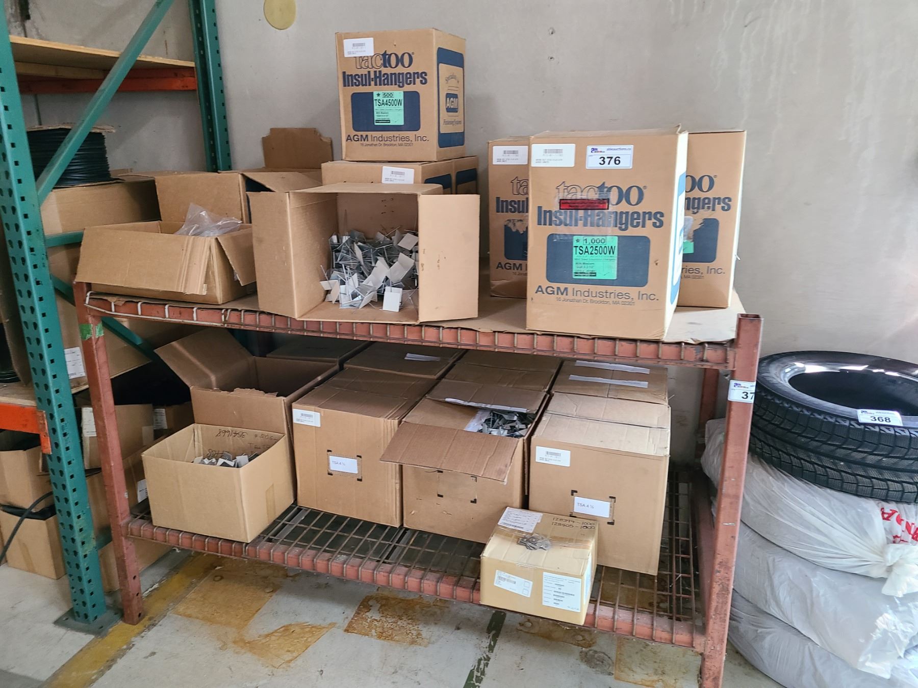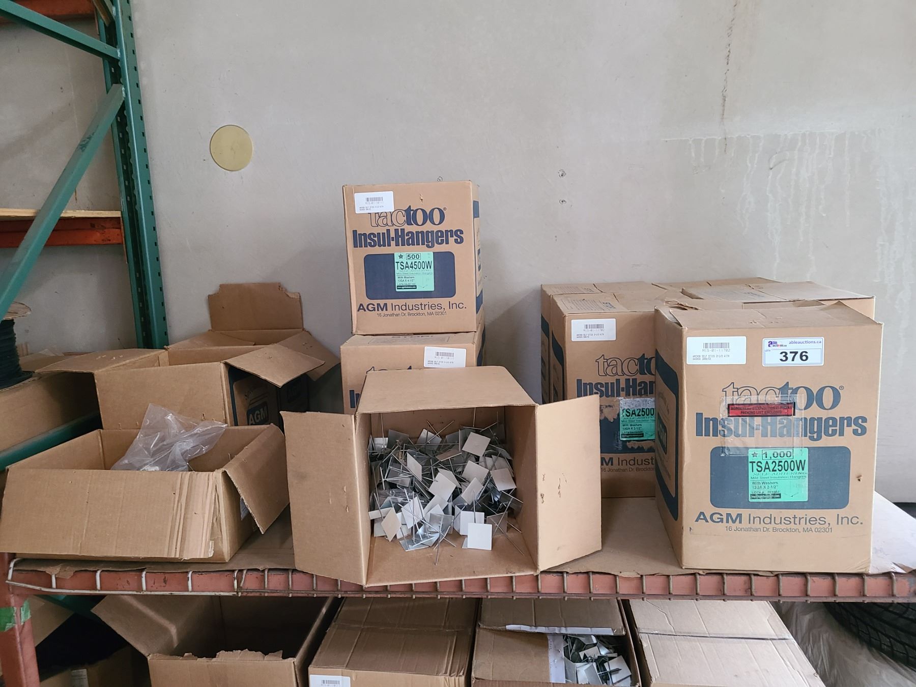 2 SHELVES, APPROXIMATELY 18 BOXES OF SELF ADHERING MILD STEEL INSULATION HANGERS WITH WASHERS