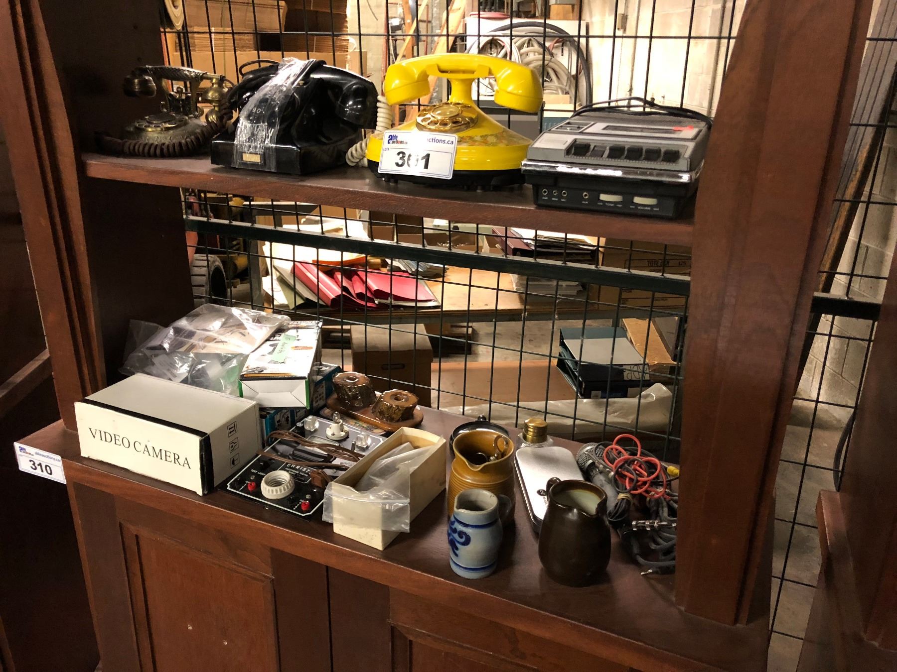 2 SHELVES OF ASSORTED COLLECTABLES: PHONES, JUGS & MORE