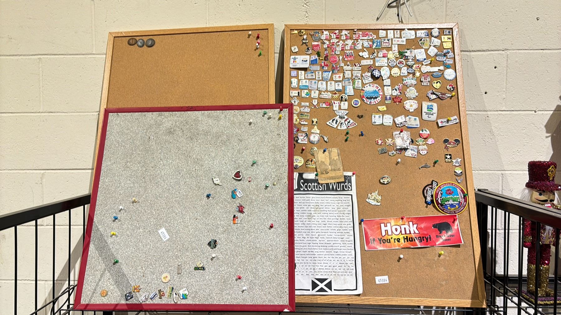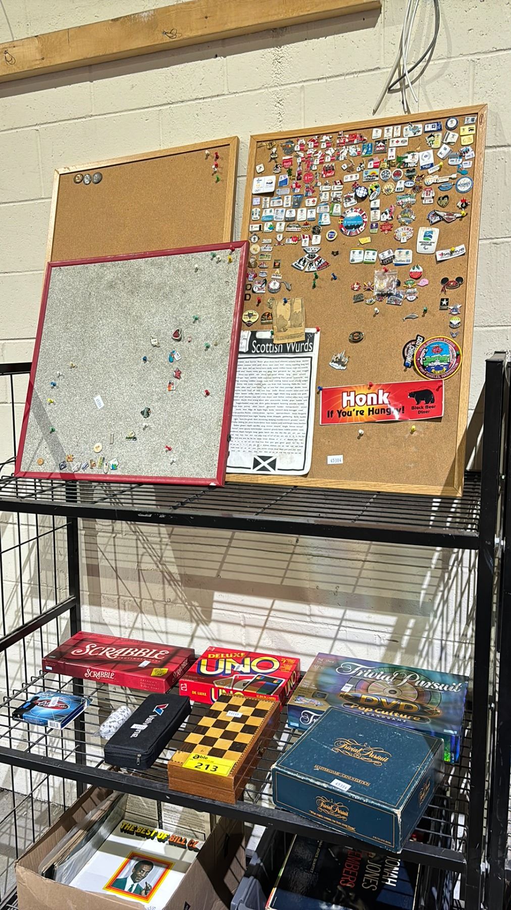 2 SHELVES OF ASSORTED ITEMS INCLUDING; BOARD GAMES, CORK BOARDS WITH ASSORTED PINS & MORE