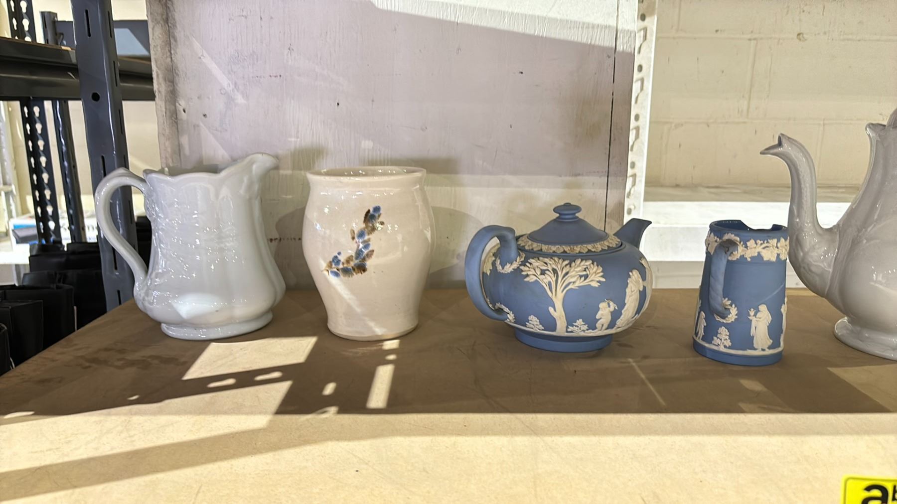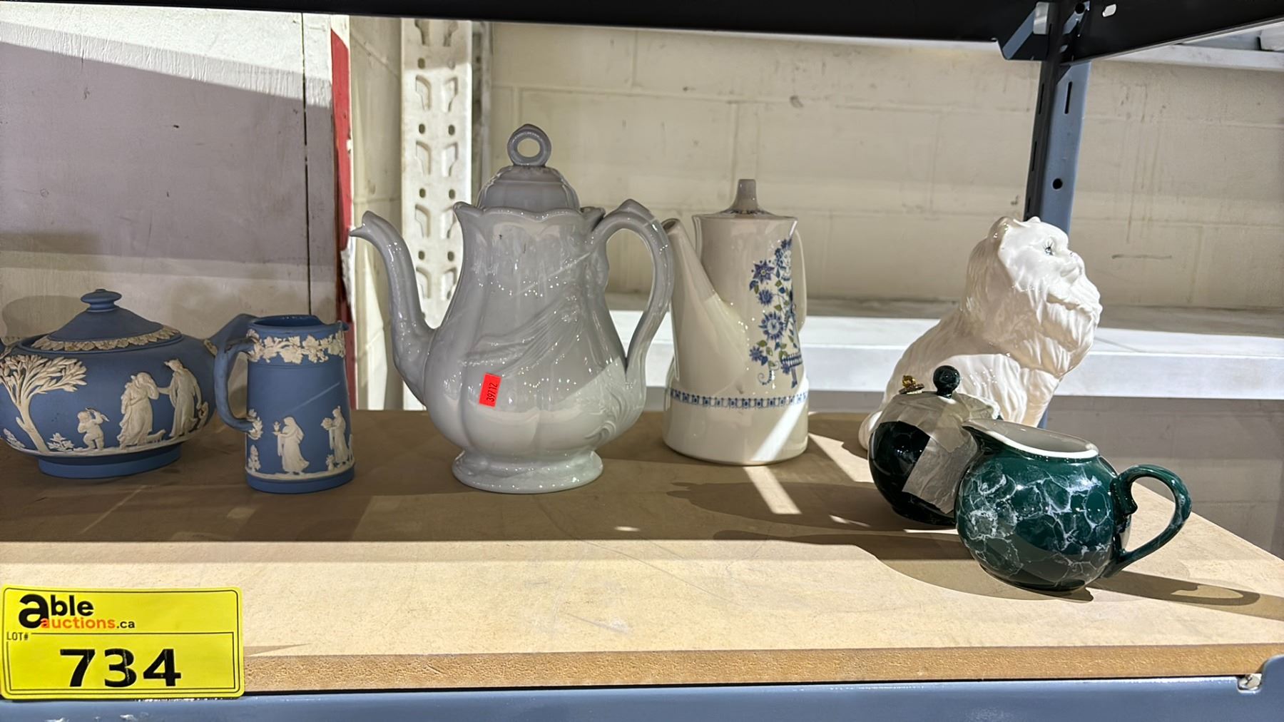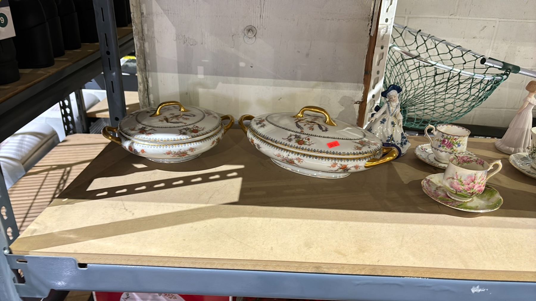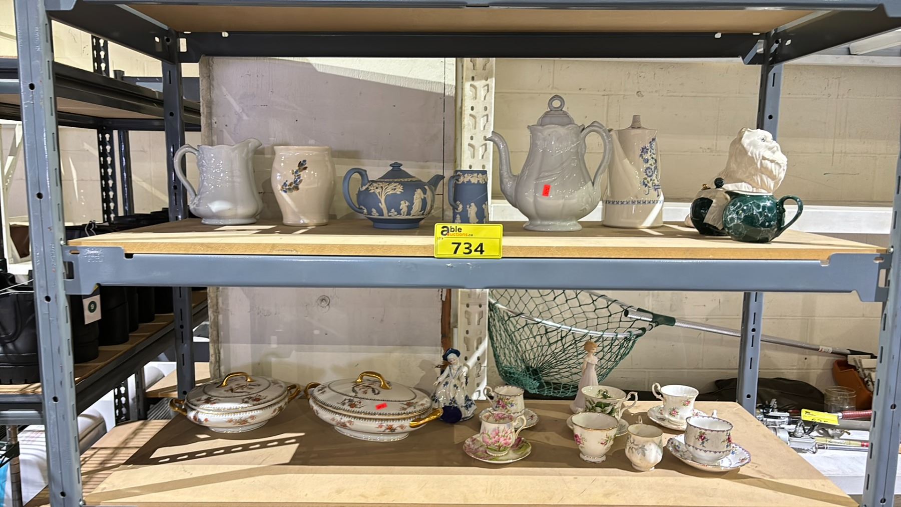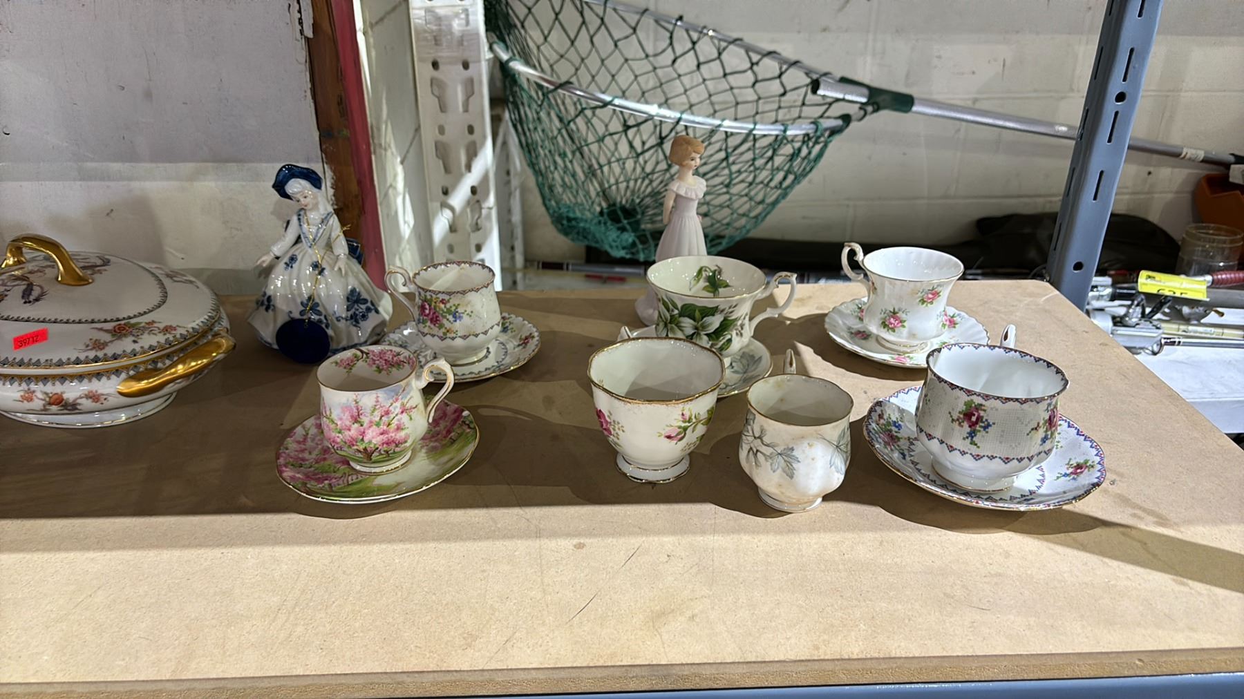 2 SHELVES OF ASSORTED ITEMS INCLUDING; BONE CHINA TEA CUPS, CAT FIGURE, TEAPOTS & MORE