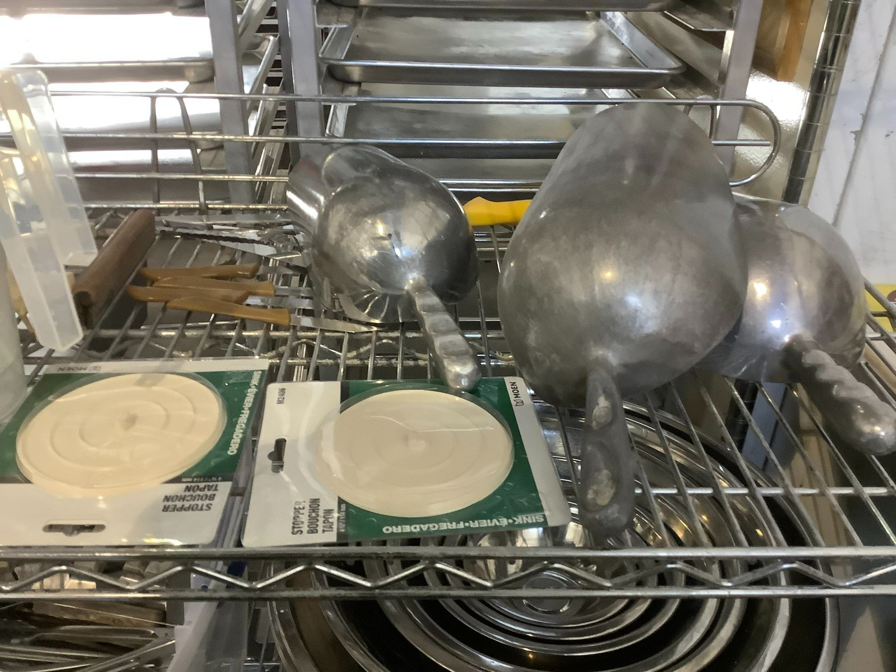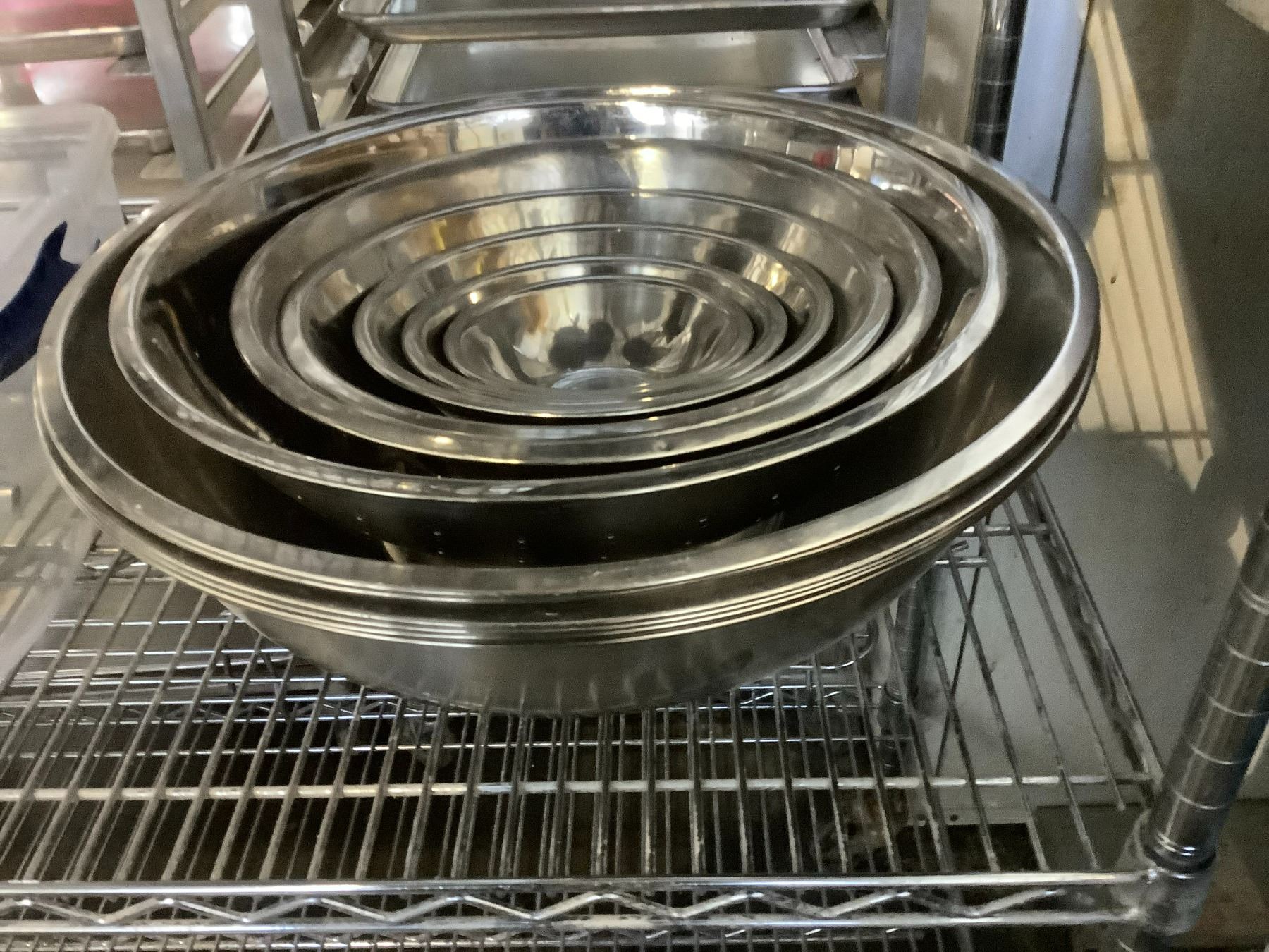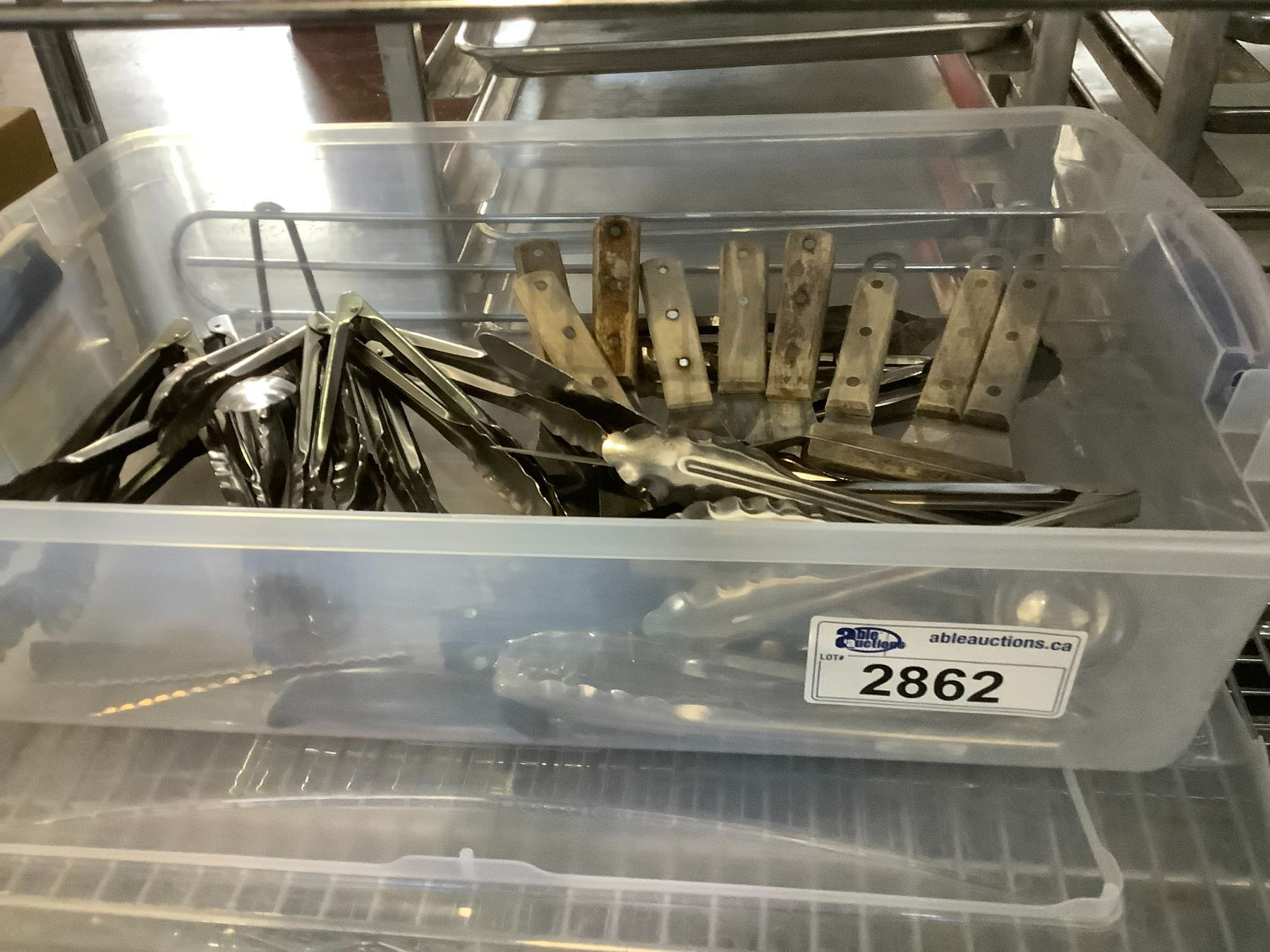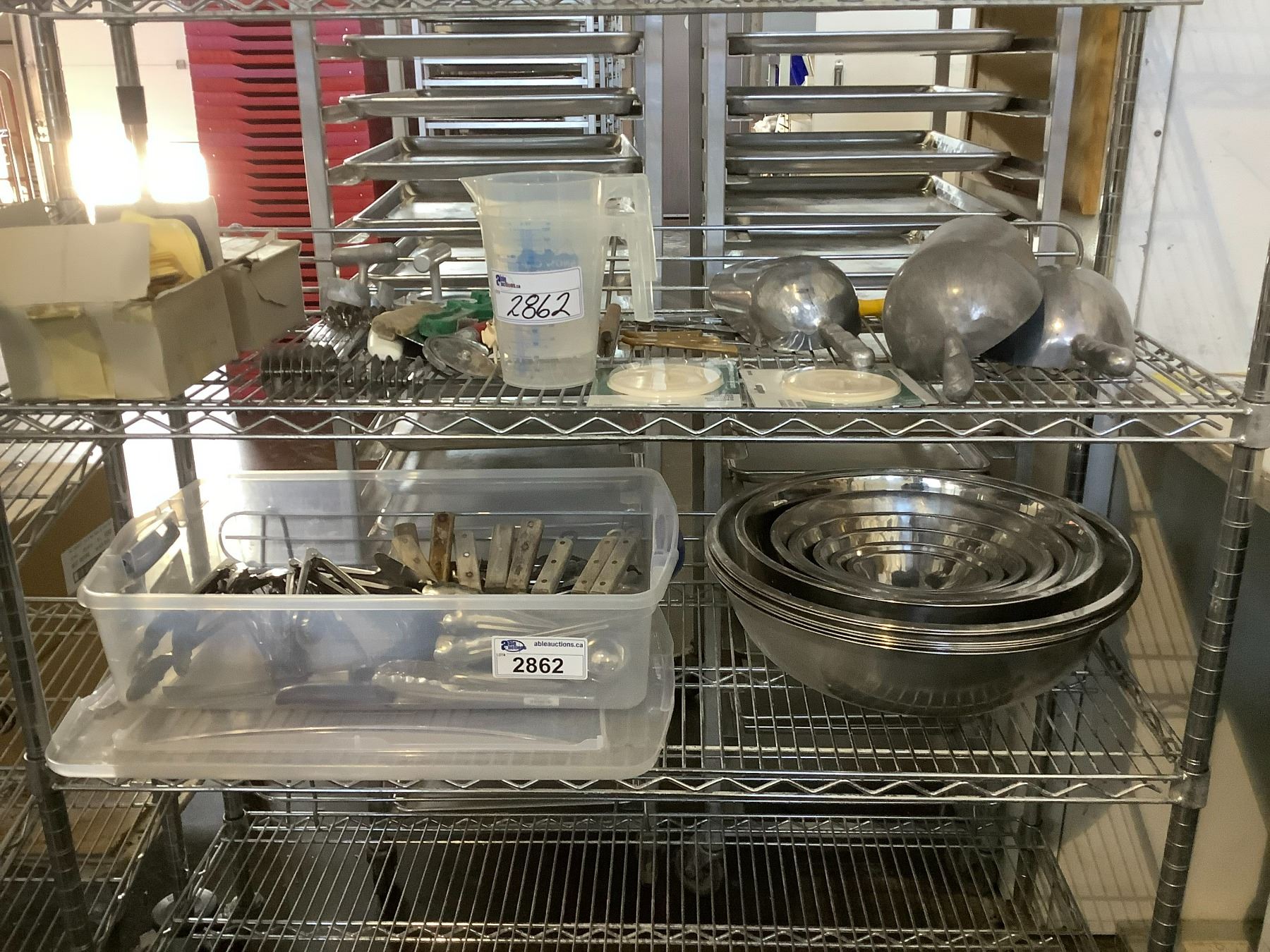 2 SHELVES OF ASSORTED ITEMS INCLUDING; MIXING BOWLS, TONGS, SPATULAS, CUTTING TOOLS & MORE