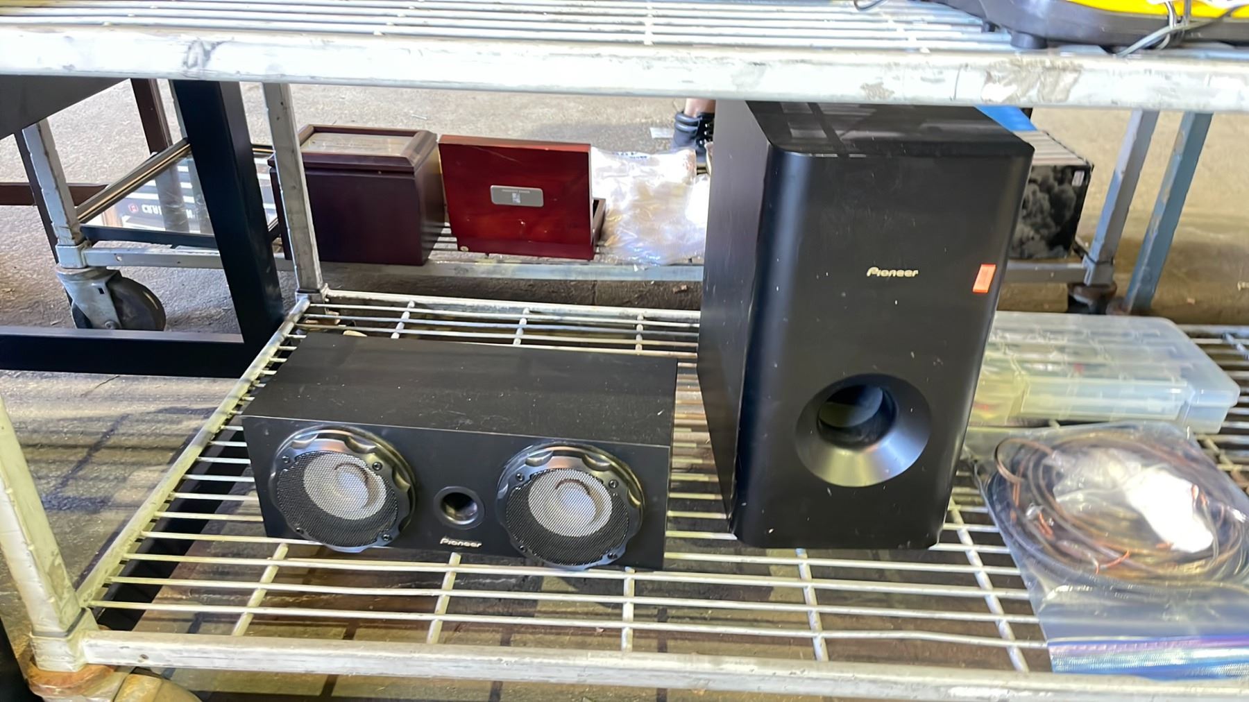 2 SHELVES OF ASSORTED ITEMS INCLUDING; SPEAKERS, VINTAGE CELL PHONE, 8 TRACK TAPES & MORE