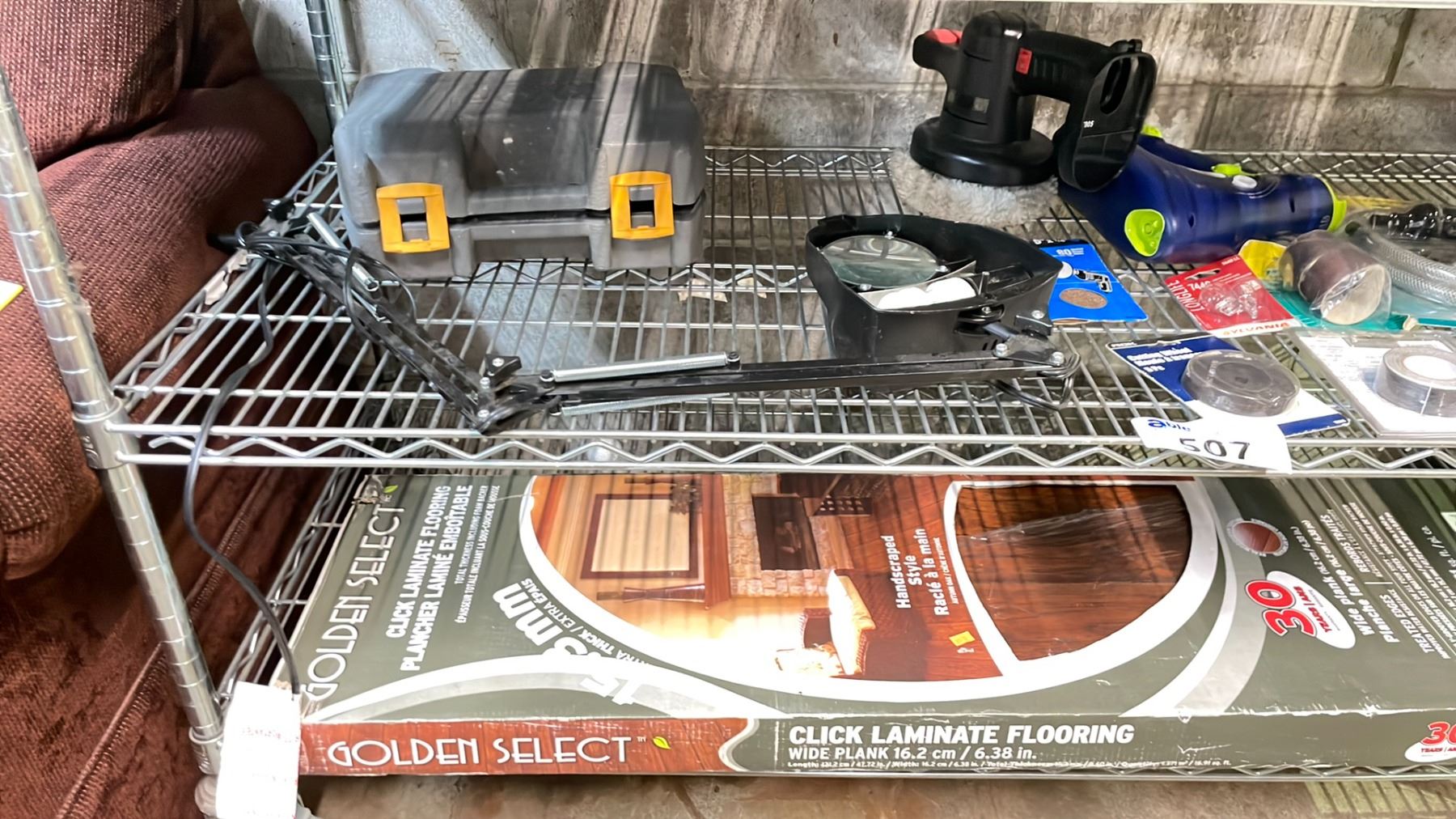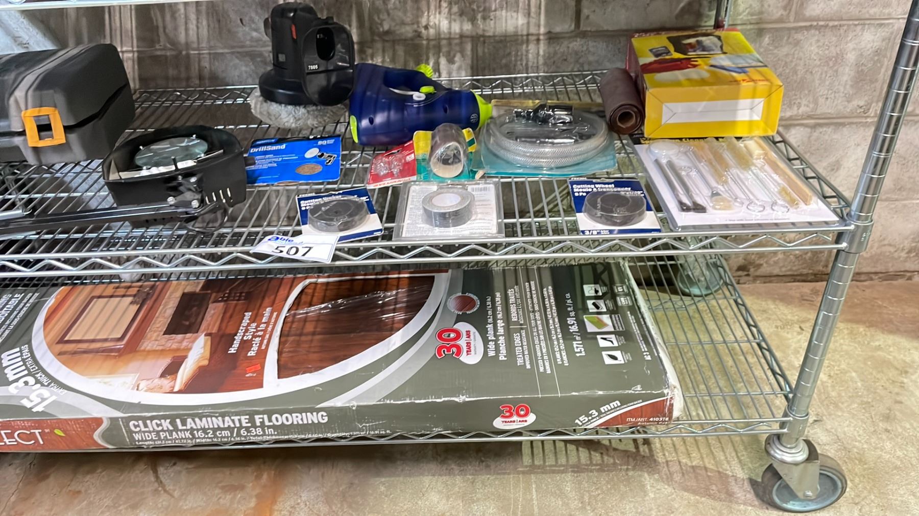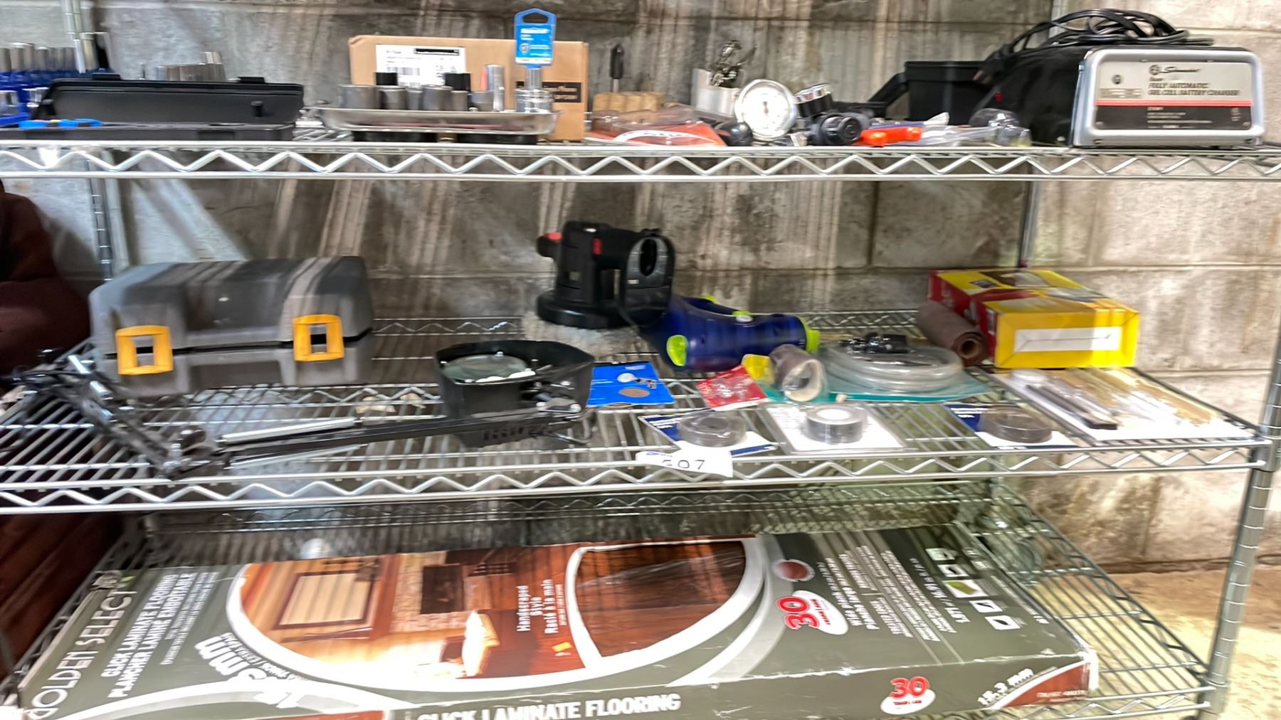 2 SHELVES OF ASSORTED ITEMS, INCLUDING TOOLS, TOOLBOX POWER SCRUBBER, LAMINATED FLOORING *UNKNOWN WORKING CONDITION MAY BE MISSING PIECES*