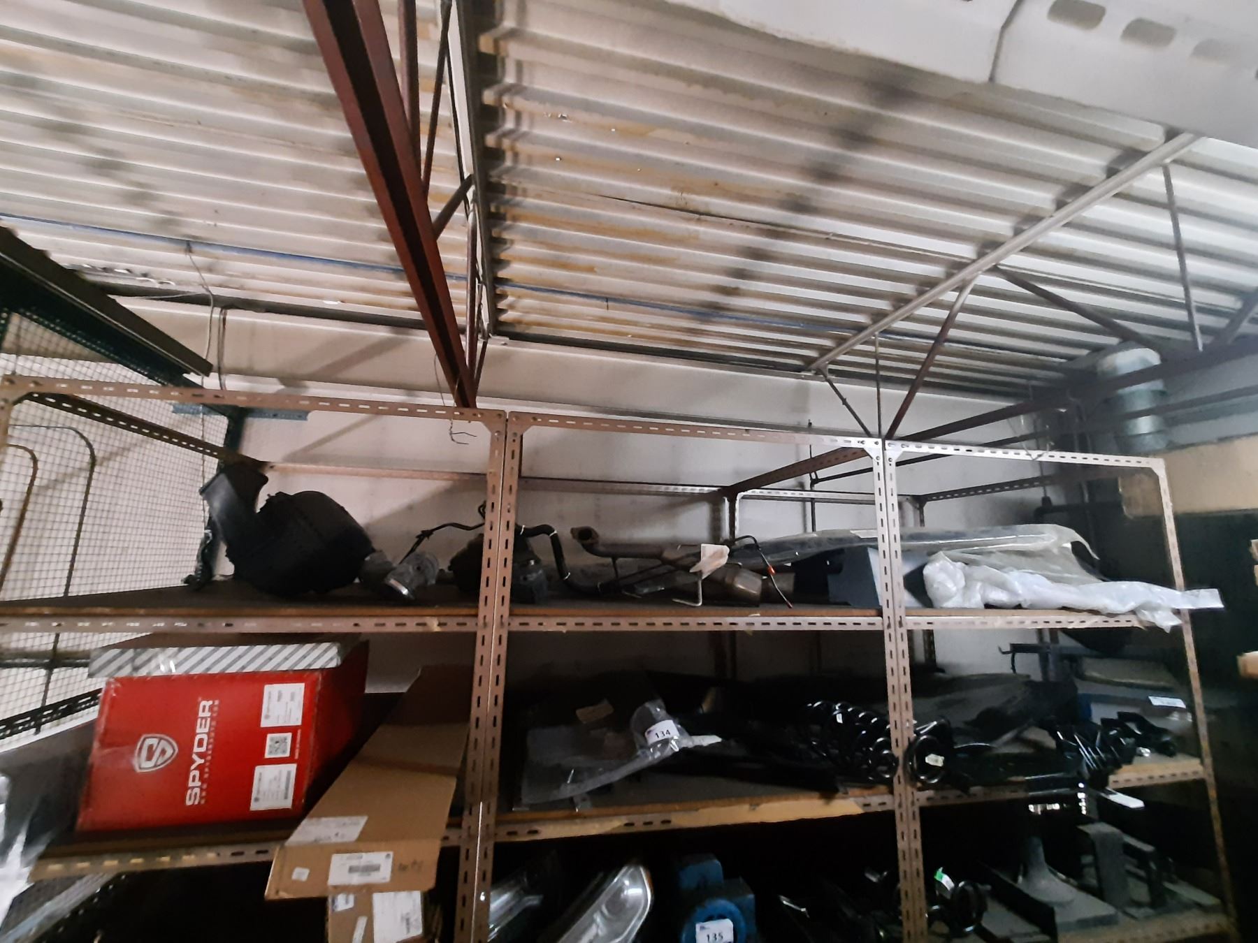 2 SHELVES OF ASSORTED VEHICLE PARTS AND HARDWARE INCLUDING AIR INTAKES, EXHAUST SYSTEMS, SHOCKS AND FENDERS
