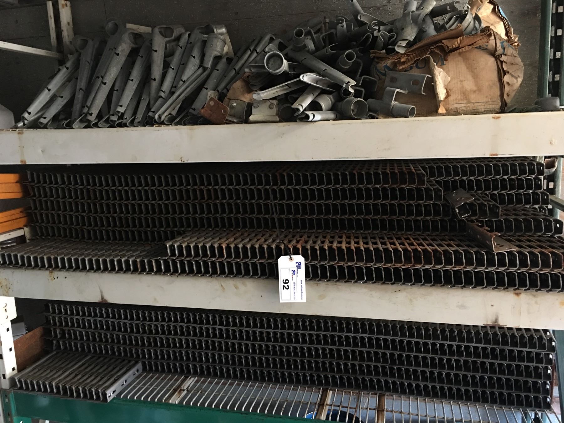 2 SHELVES OF BEAM CLIPS, AND A SHELF OF BARBED WIRE ATTACHMENTS FOR CHAIN LINK FENCING