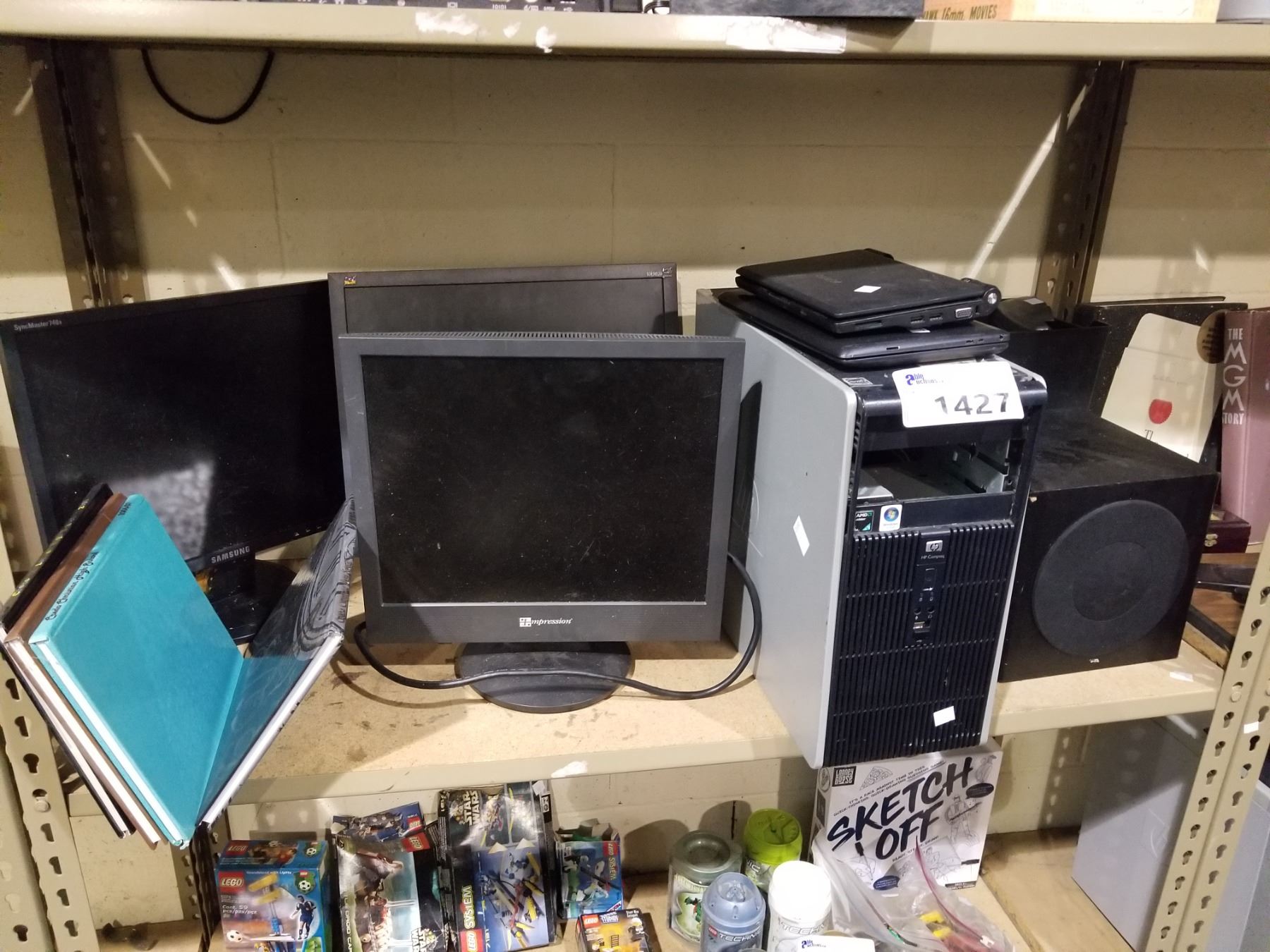 2 SHELVES OF COMPUTERS, ELECTRONICS, MONITORS, SUBWOOFER, ETC