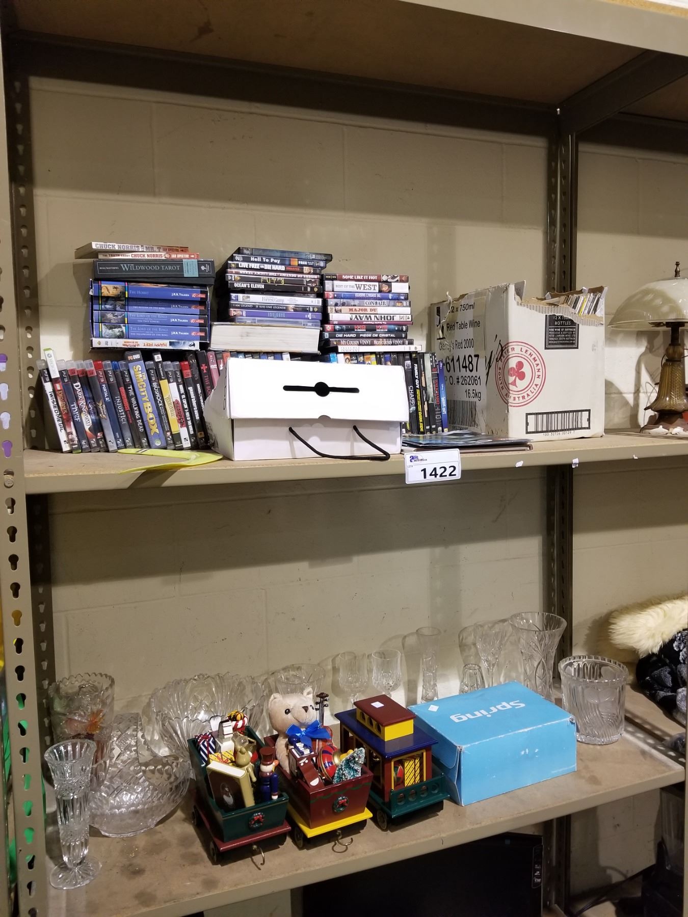 2 SHELVES OF DVDS, GAMES, BLU-RAYS, GLASSWARE & MORE