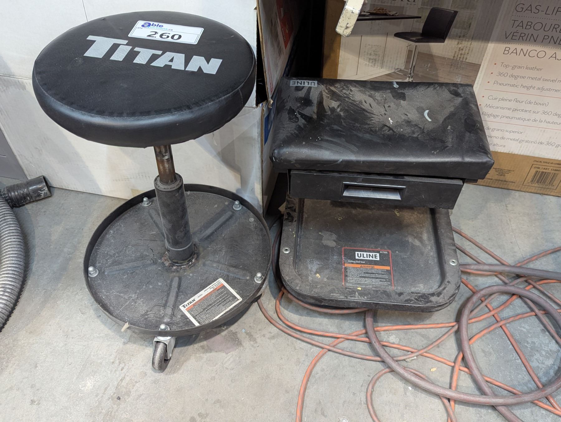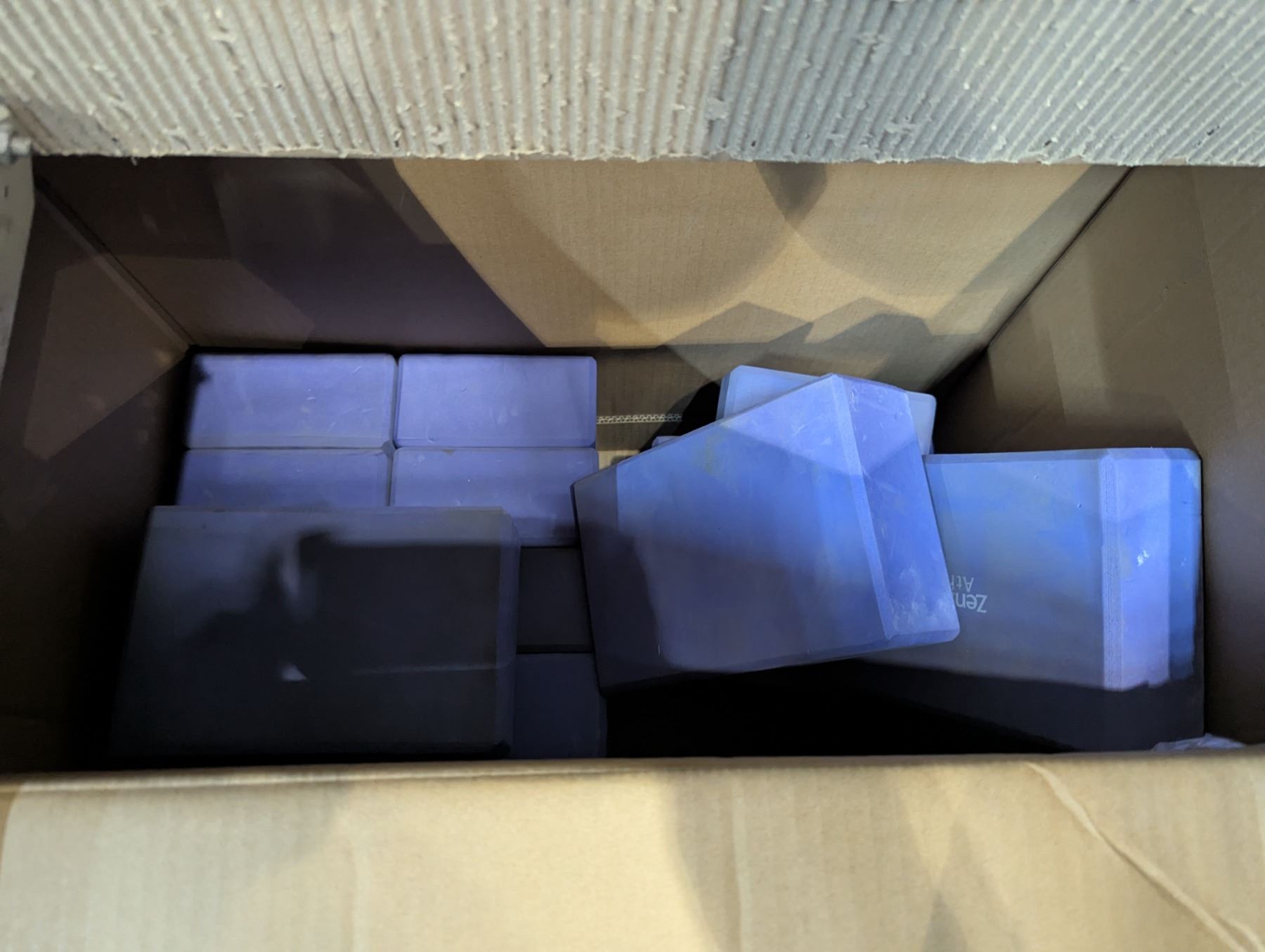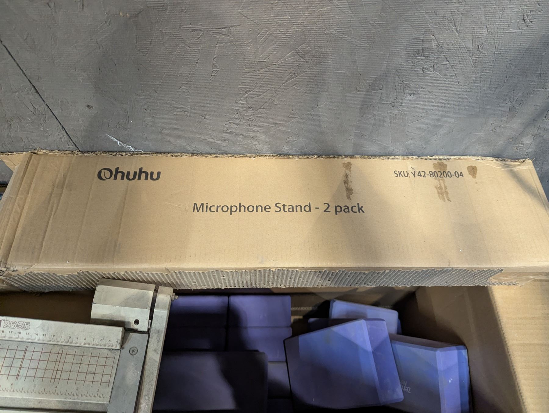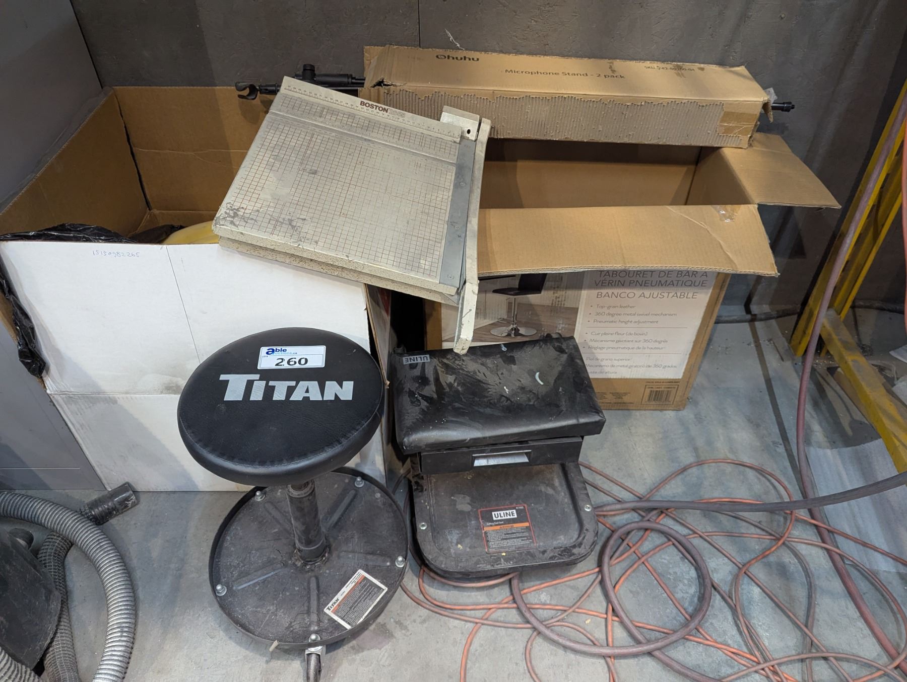 2 SHOP STOOLS, BOX OF FOAM YOGA BLOCKS, MICROPHONE STANDS, PAPER CUTTER & ROLL OF FOAM