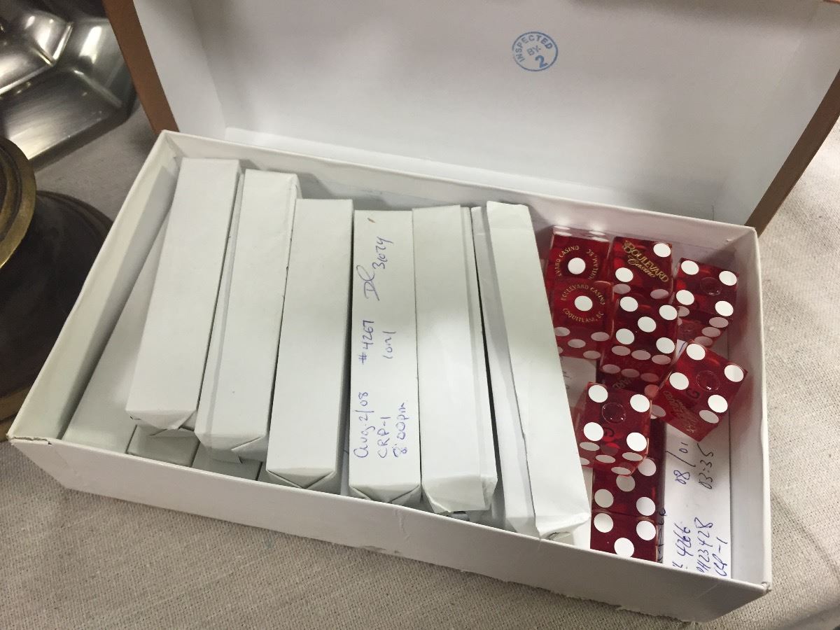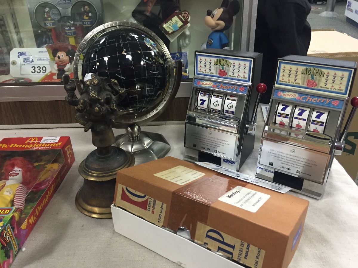 2 SLOT MACHINES, GLOBE AND BOX OF DICE