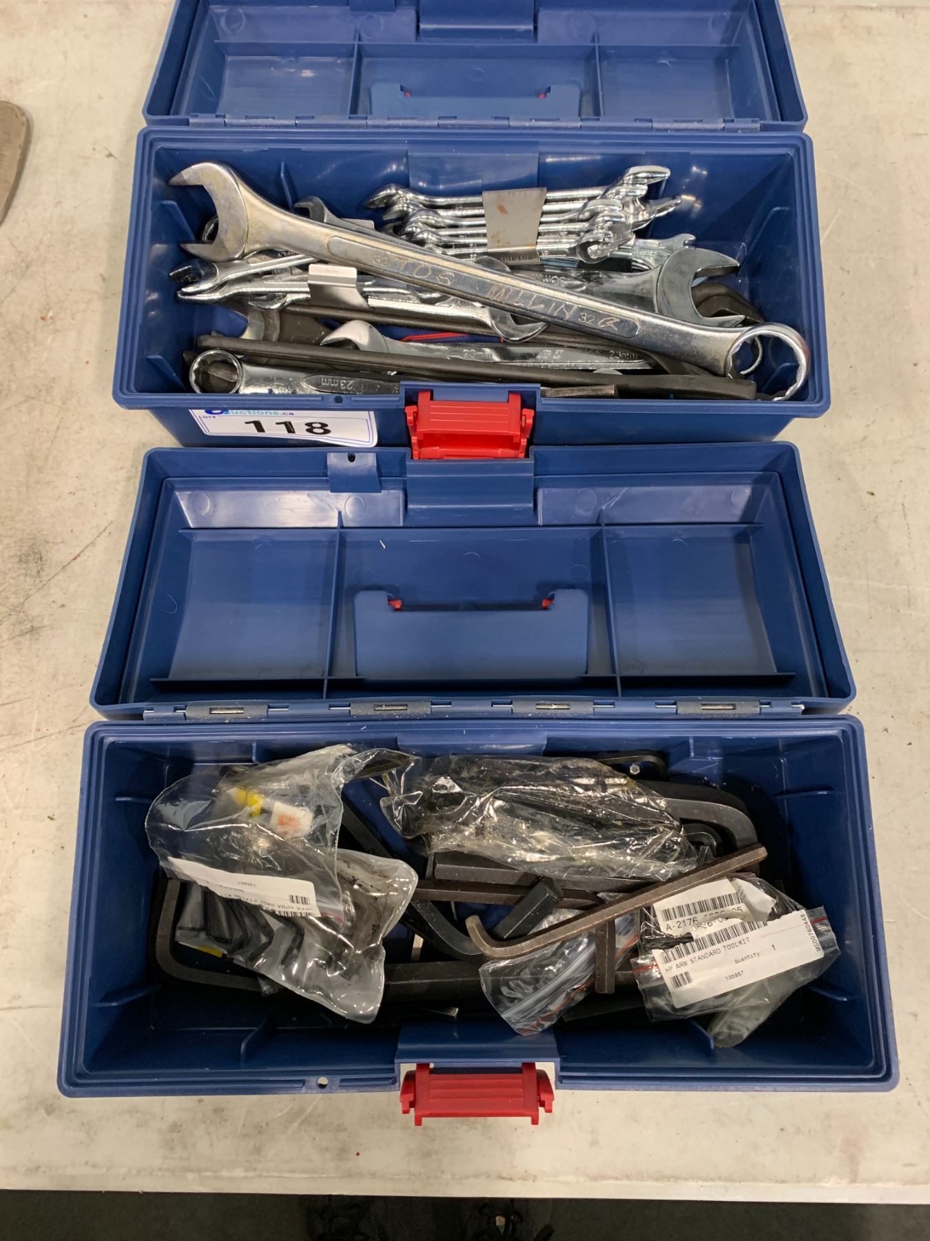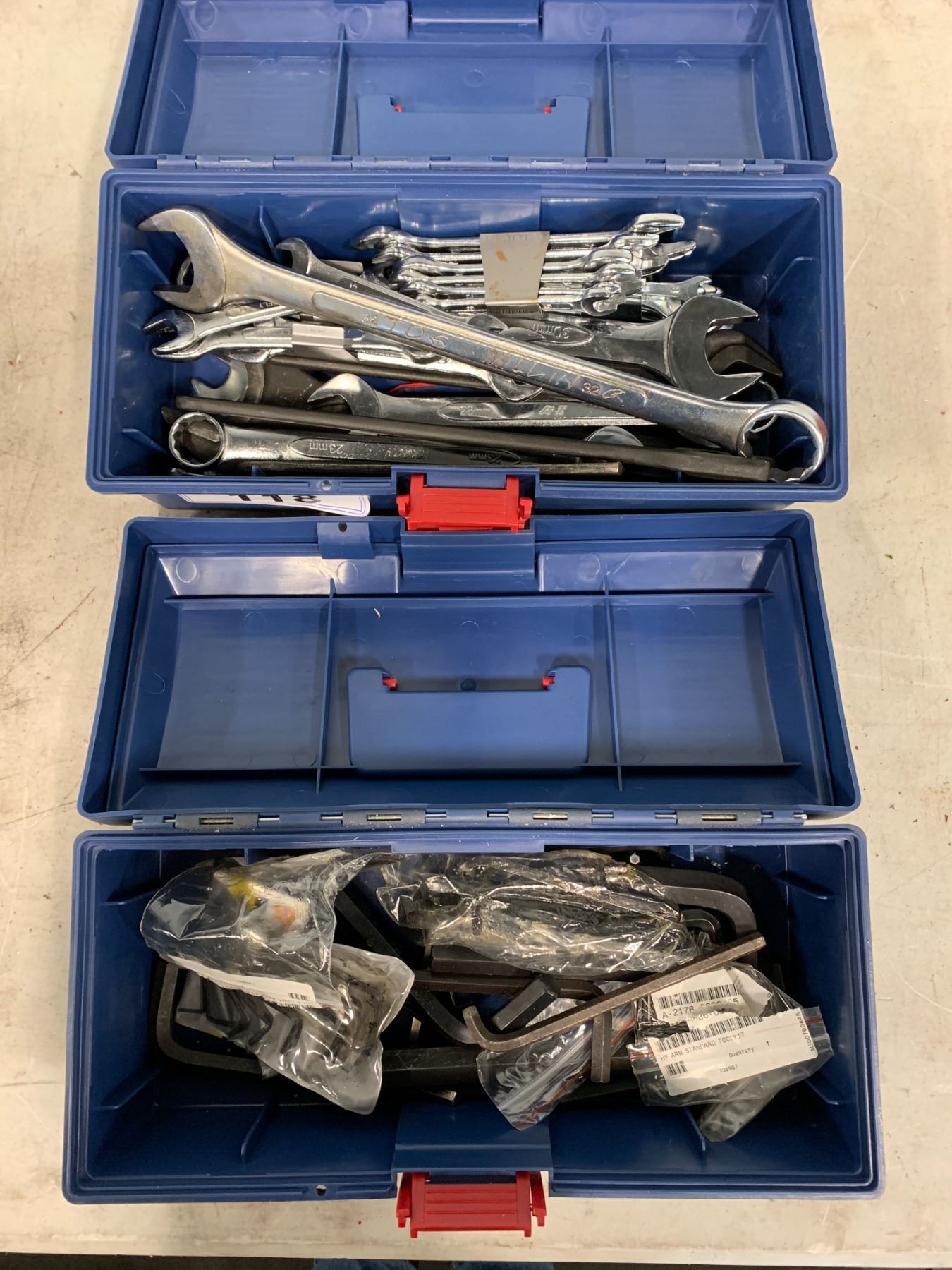 2 SMALL BLUE TOOL BOXES AND CONTENTS- ASSORTED COMBINATION WRENCHES & ALLEN KEYS