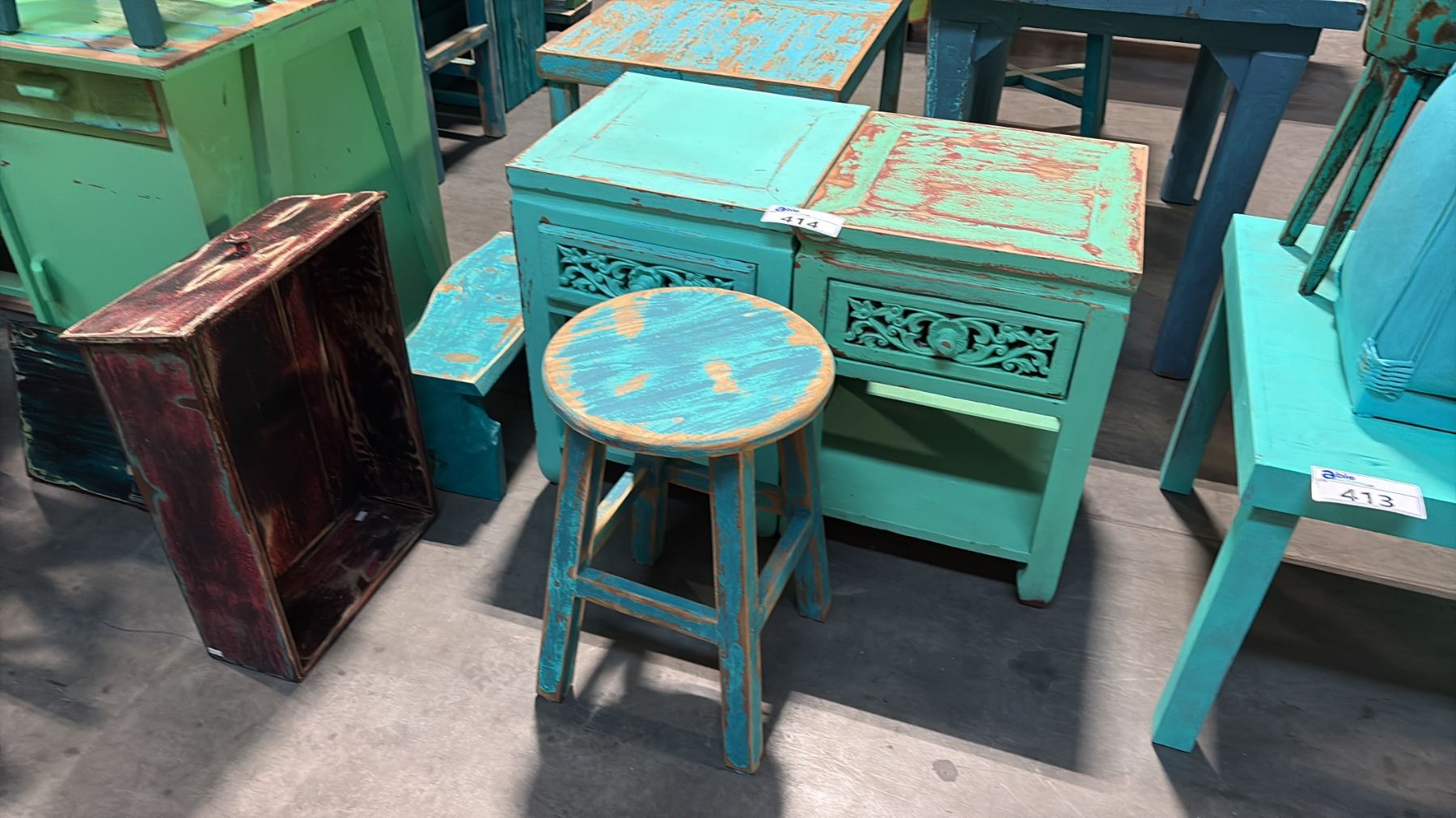 2 SMALL TEAL END TABLES AND ONE SMALL STOOL