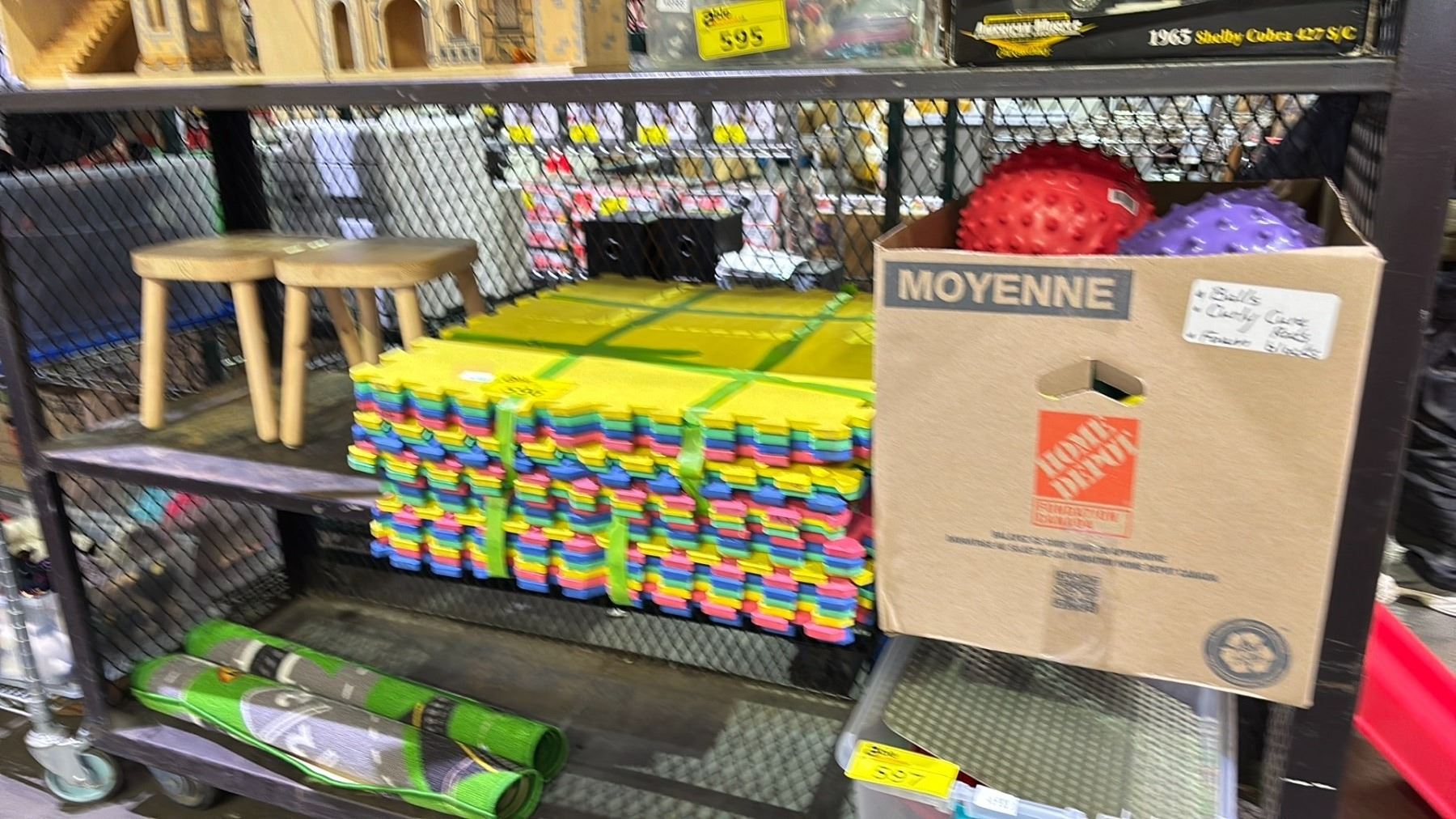 2 SMALL WOOD STOOLS, 20 INTERLOCKING FOAM TILES & BOX OF BALLS, FOAM BLOCKS & MORE