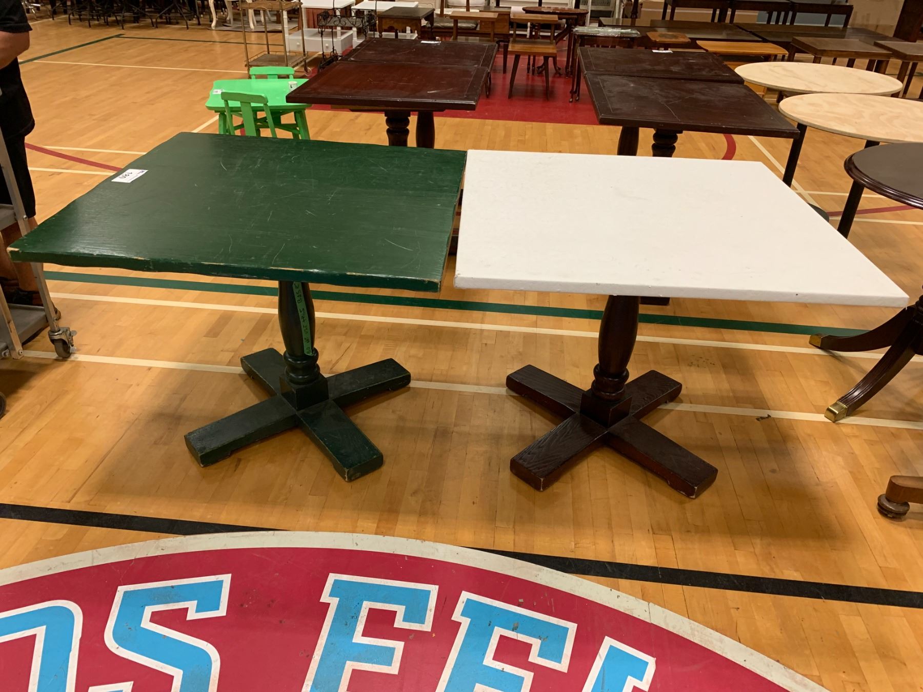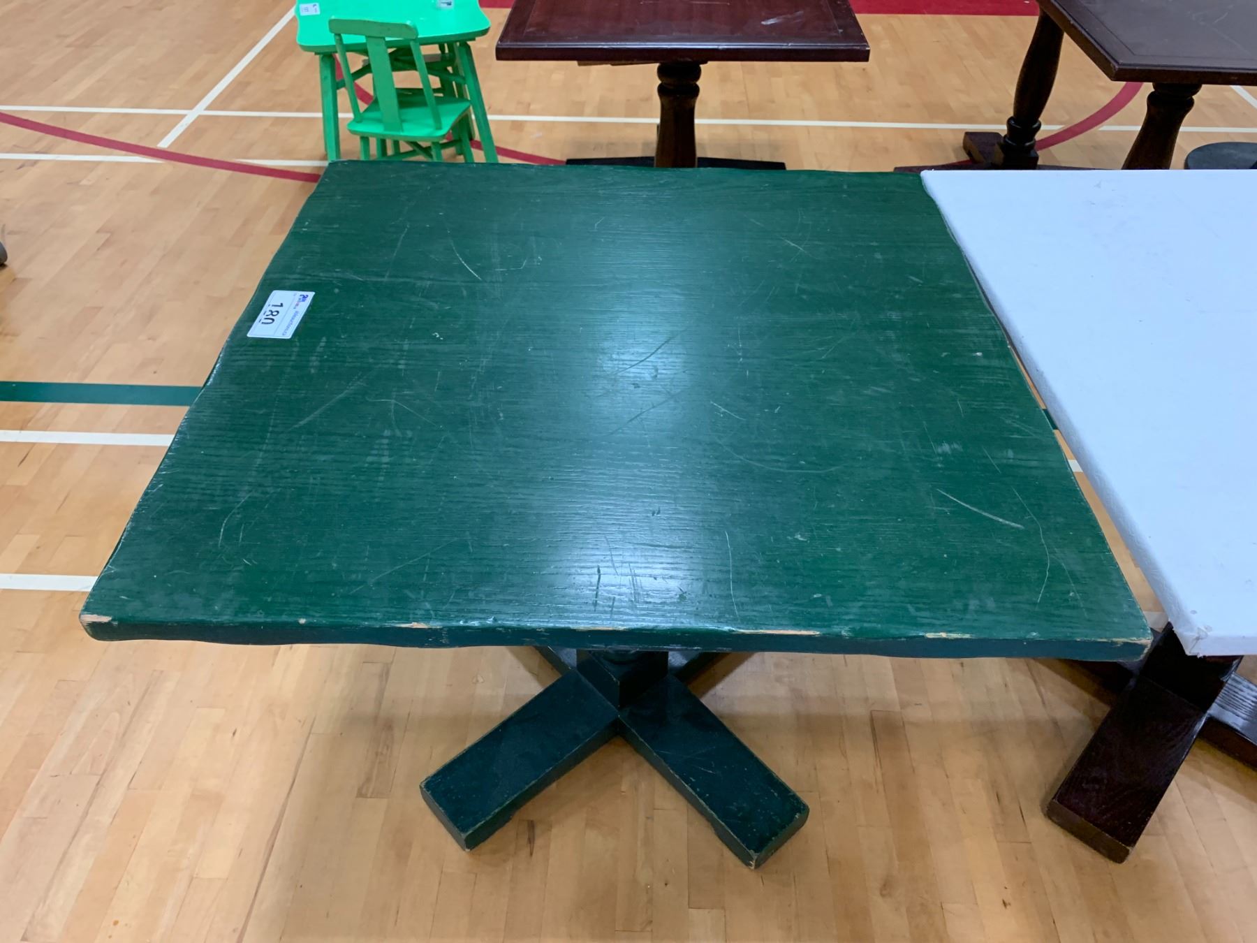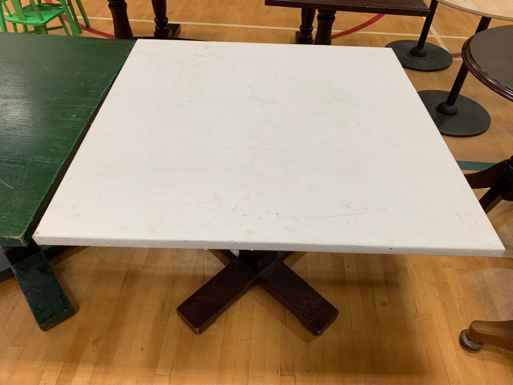 2 SQUARE WOOD TABLES (SOME DAMAGE) APPROX 29"X36"X36"