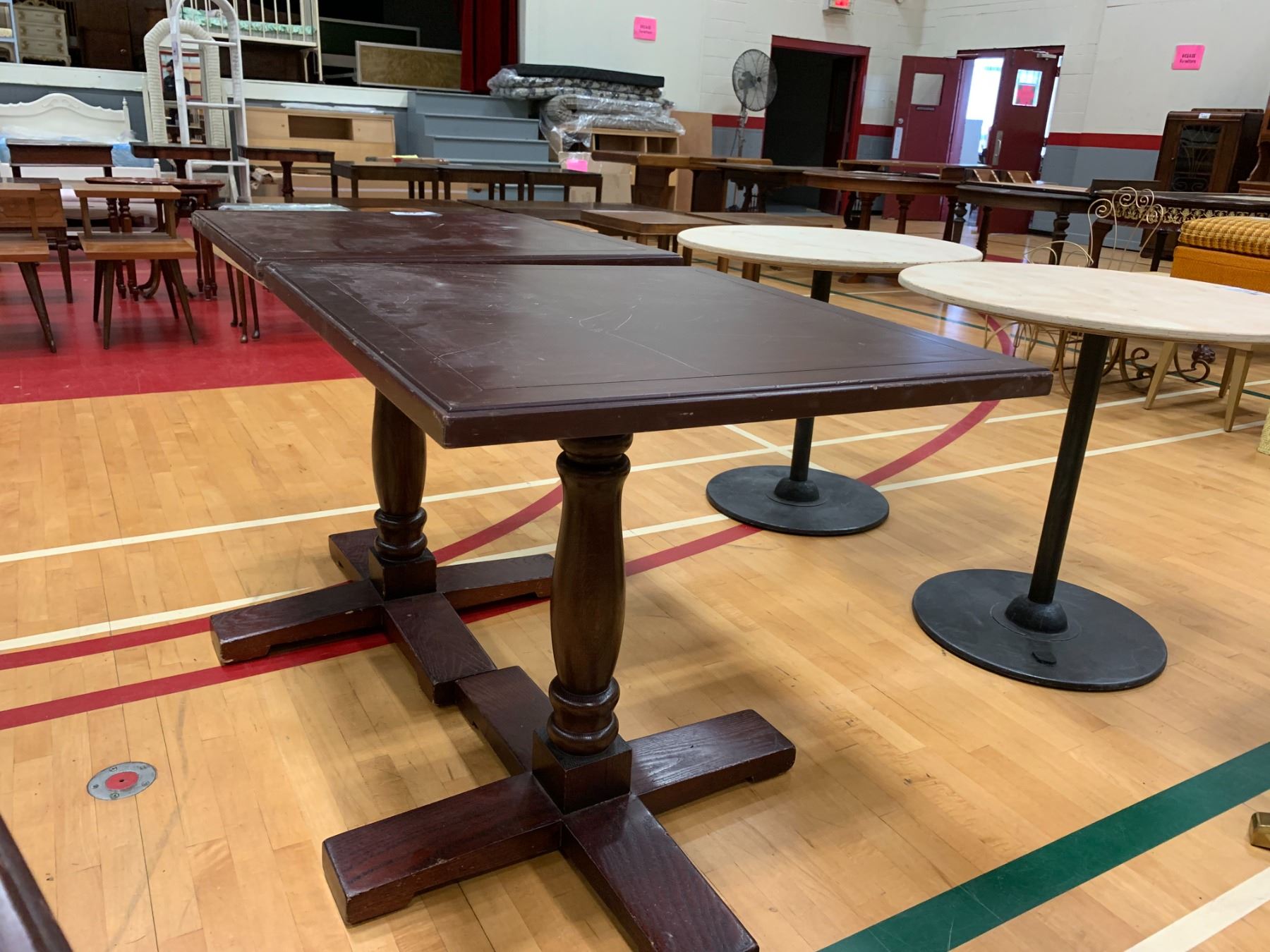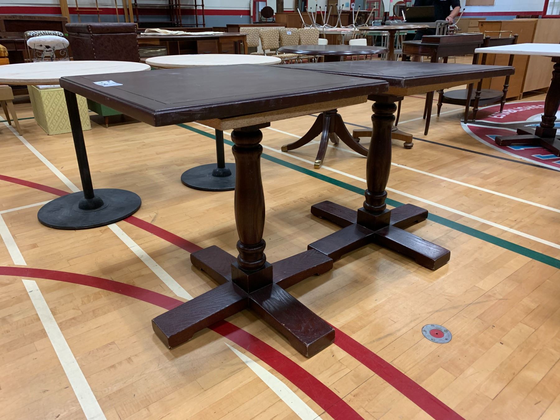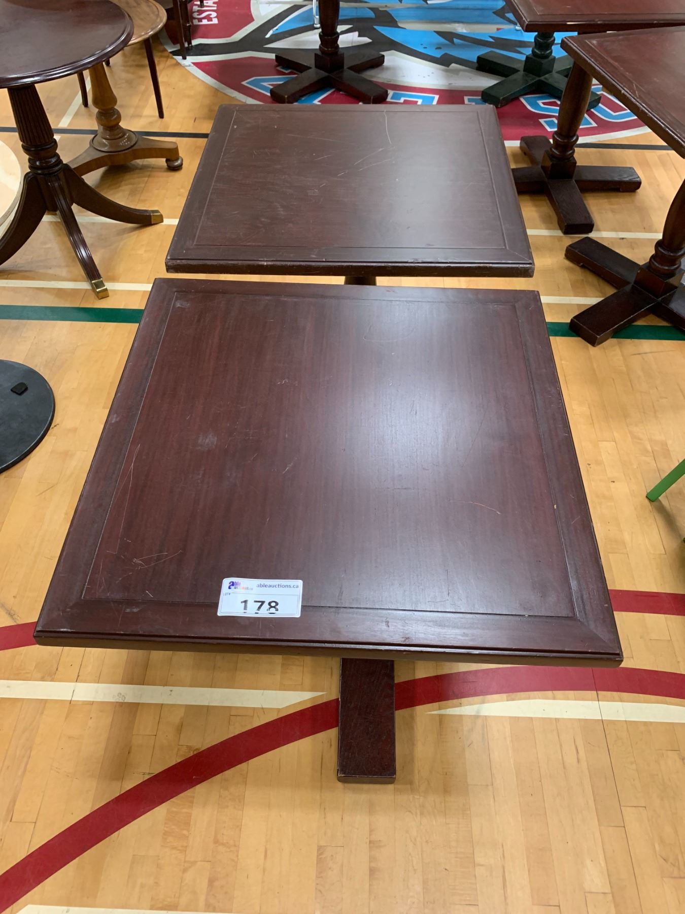 2 SQUARE WOOD TABLES (SOME DAMAGE) APPROX 30"X28"X28"