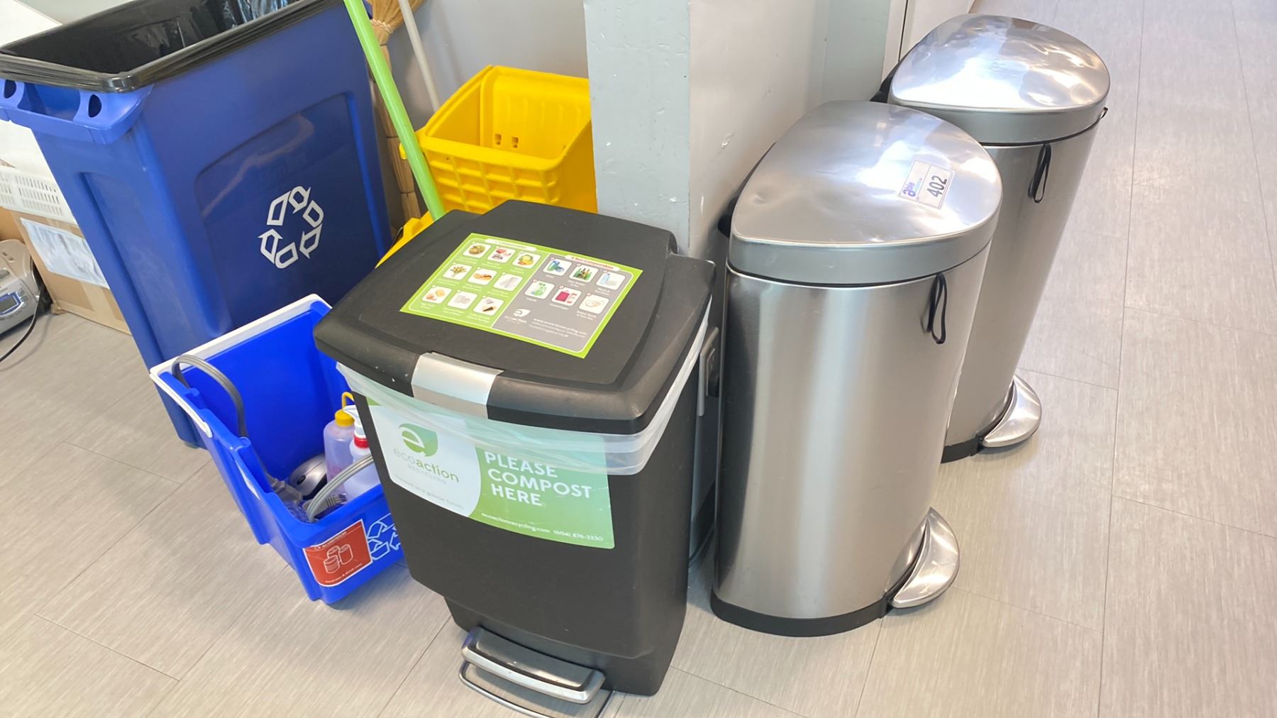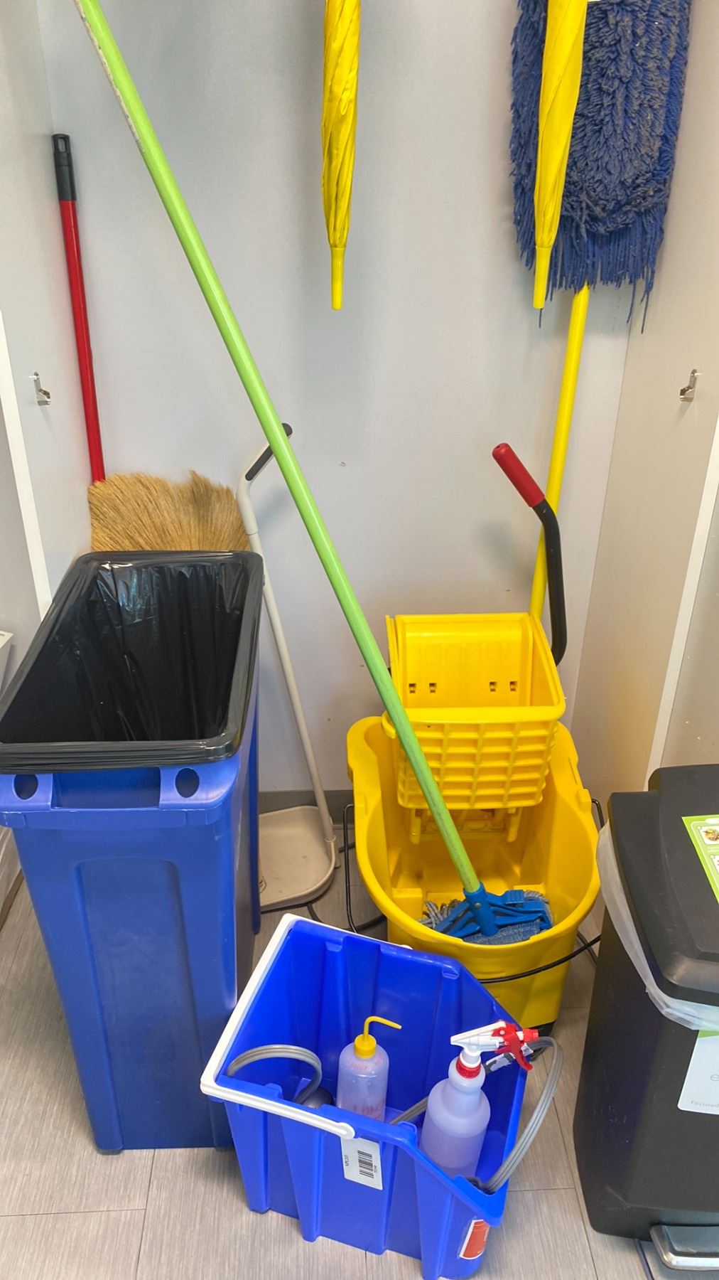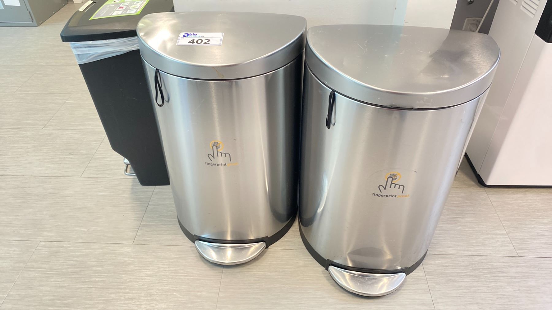 2 STAINLESS STEEL GARBAGE BINS, GARBAGE AND RECYCLING BIN AND ASSORTED JANITORIAL SUPPLIES