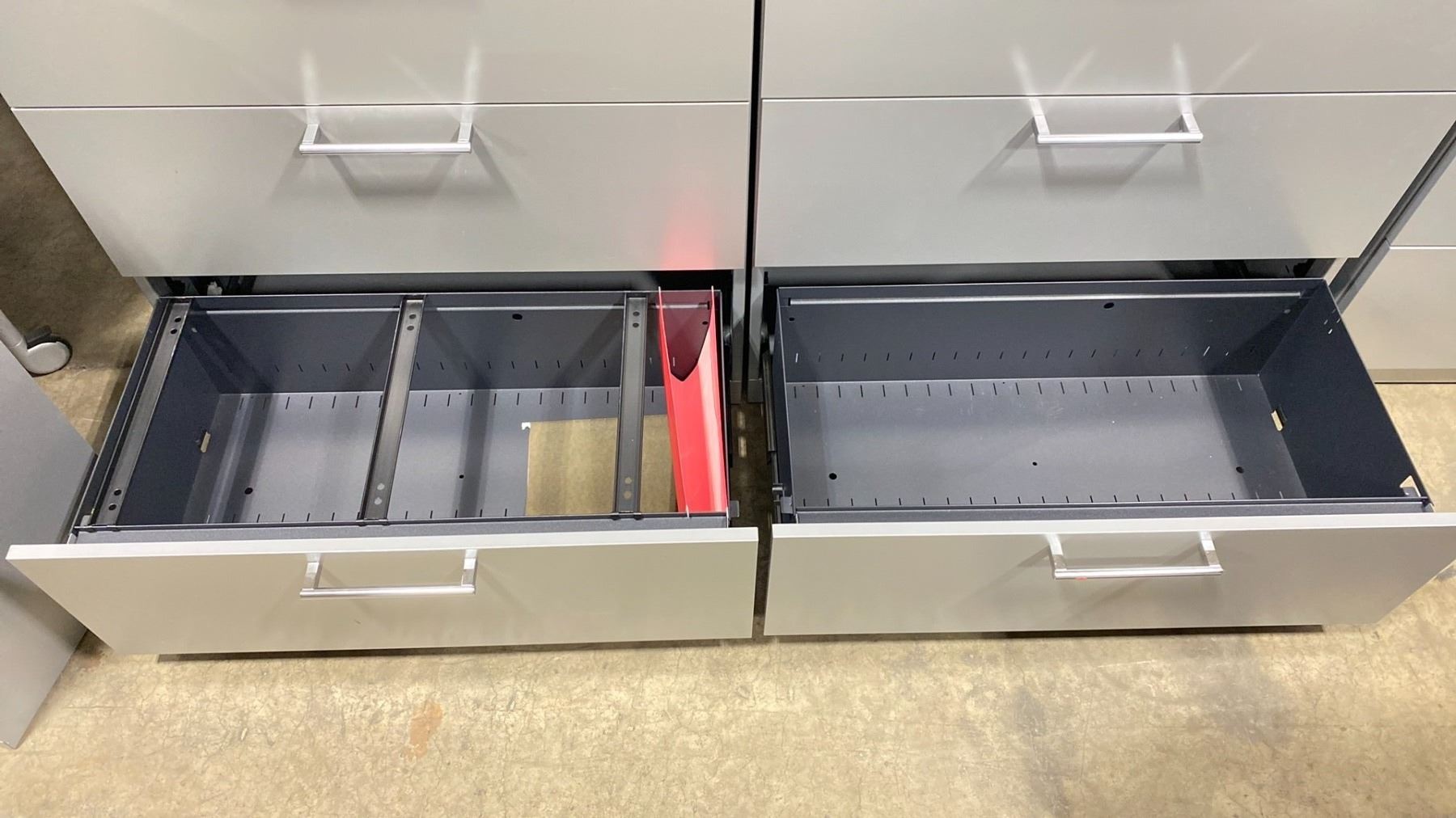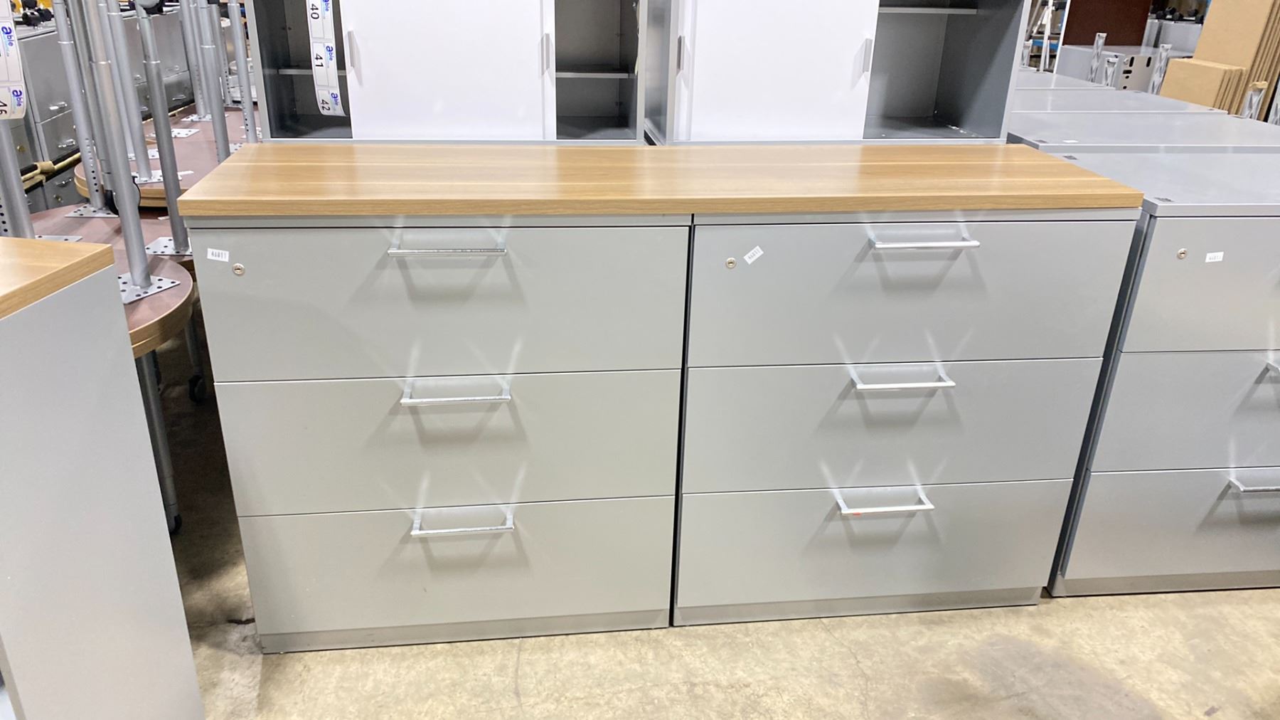 2 STEELCASE GREY METAL 3 DRAWER STORAGE FILE CABINETS WITH NATURAL WOOD LOOK TOP ( SIDE BY SIDE CONFIGURATION ) CABINETS SIZE 36"W X 19"D X 41"H TOTAL 72"W