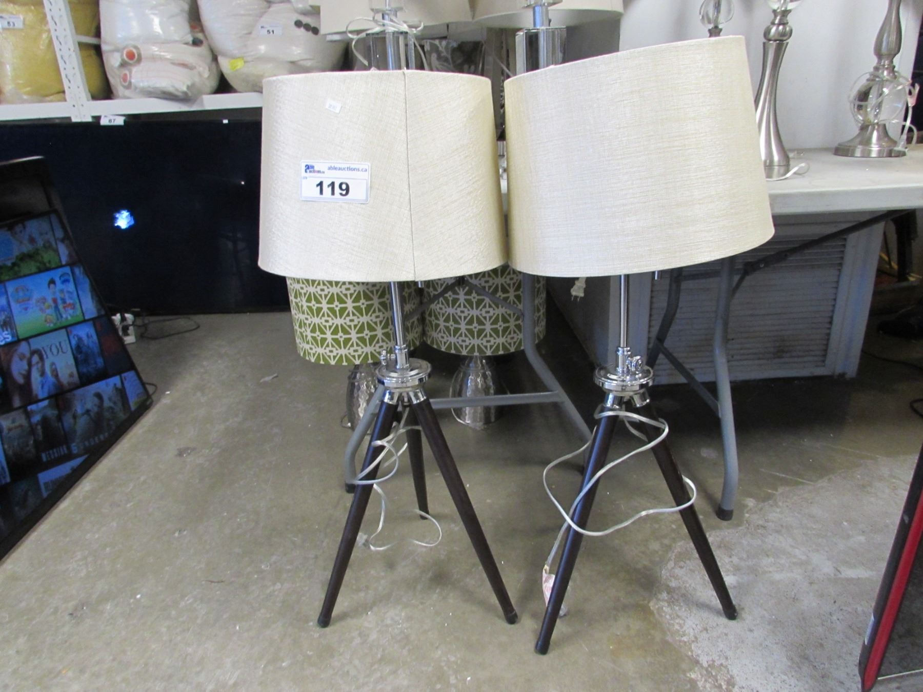 2 TELESCOPIC TRIPOD STAND LAMPS WITH BEIGE SHADES