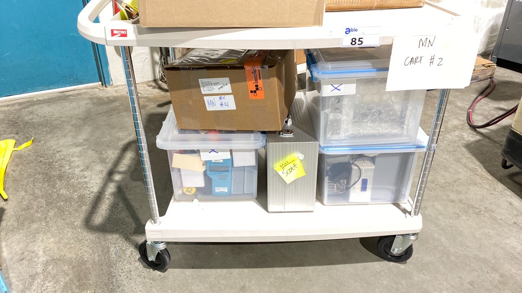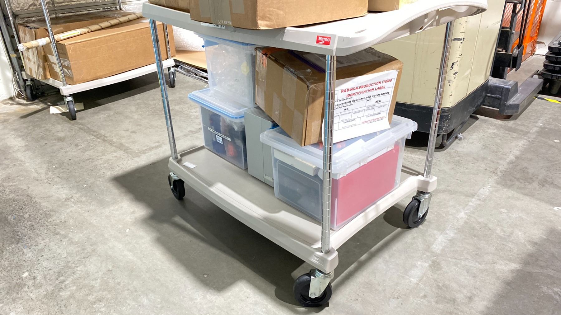 2 TIER BEIGE AND CHROME ROLLING CART (CONTENTS NOT INCLUDED)