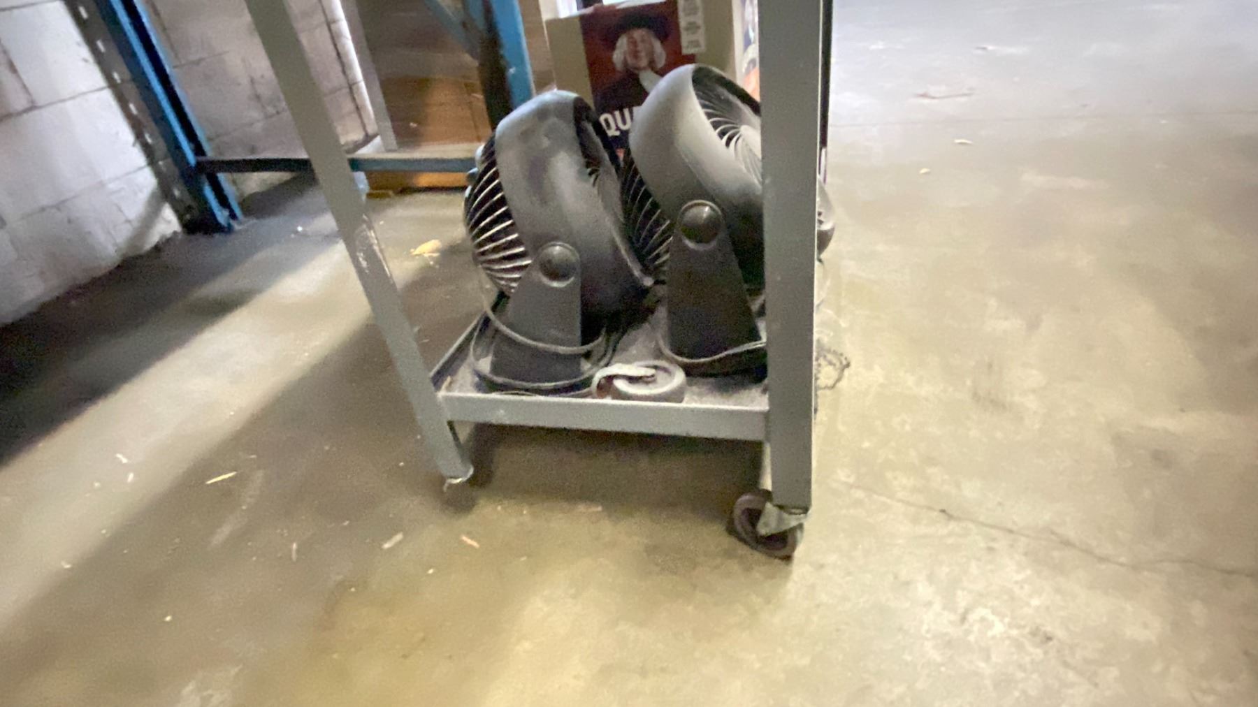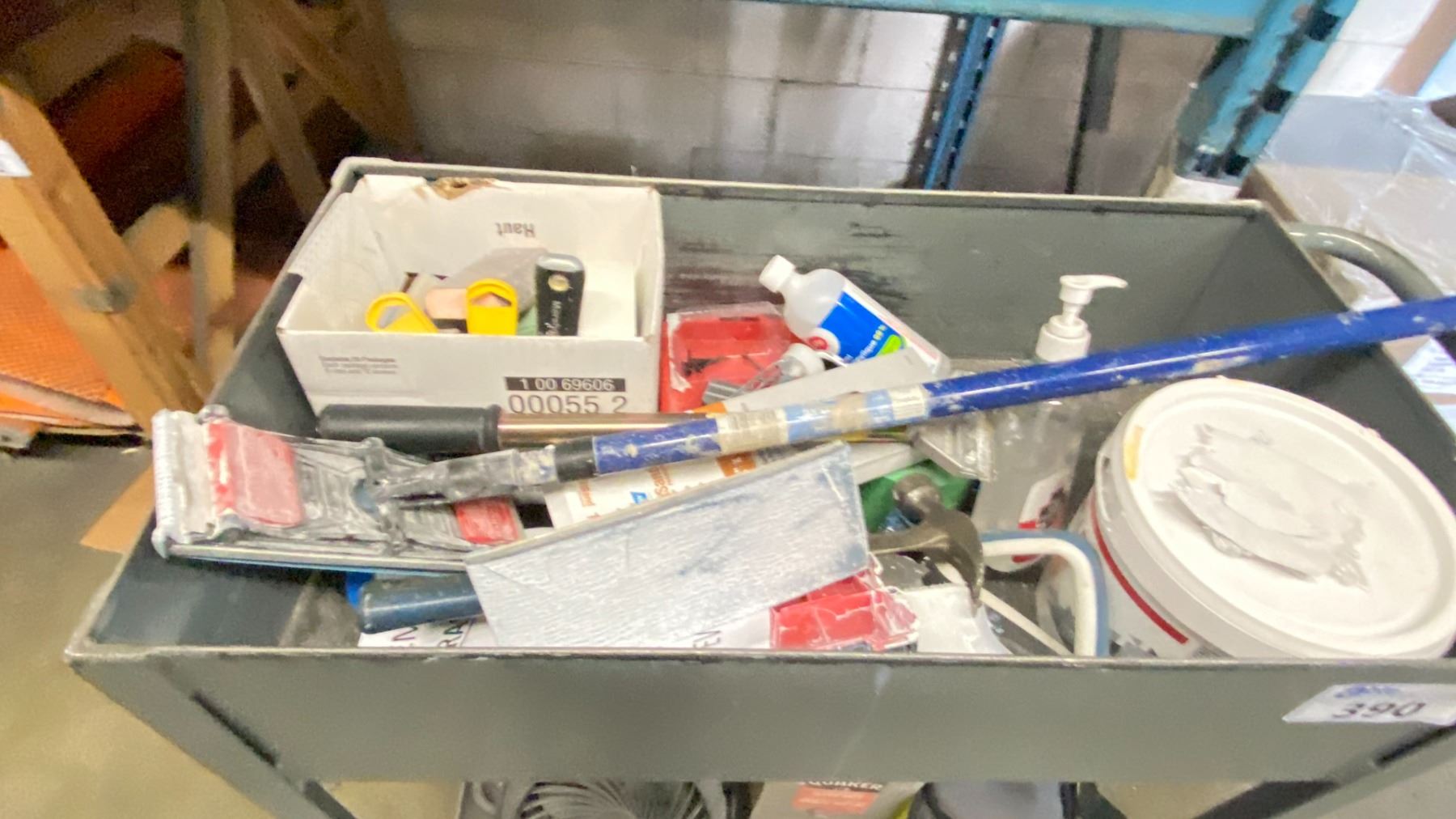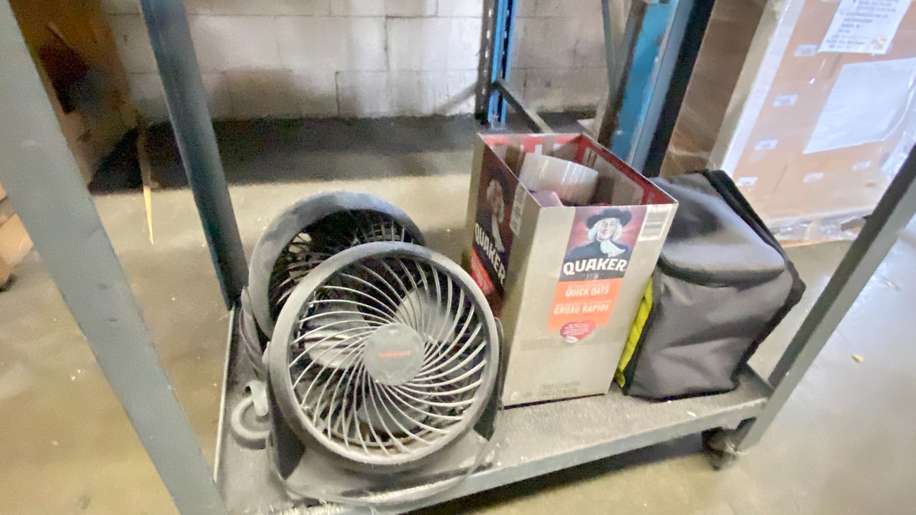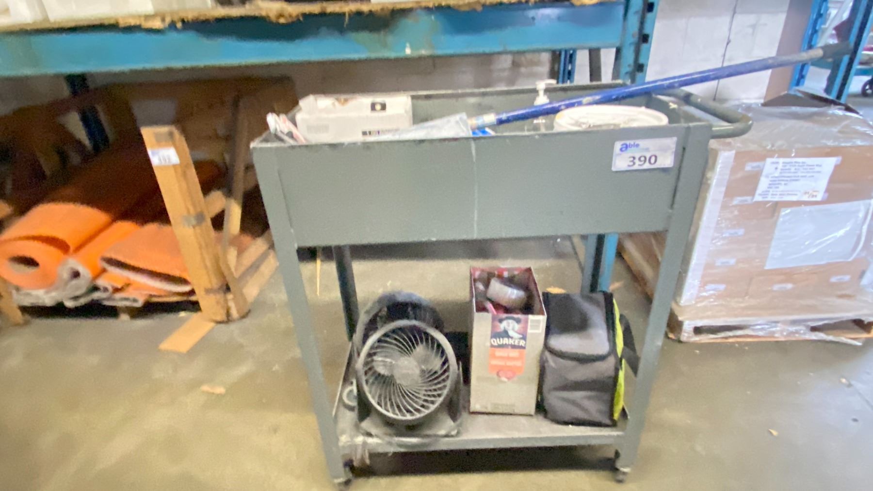 2 TIER METAL CART MISSING WHEEL WITH CONTENTS; FANS, TAPE, HAMMER AND MORE
