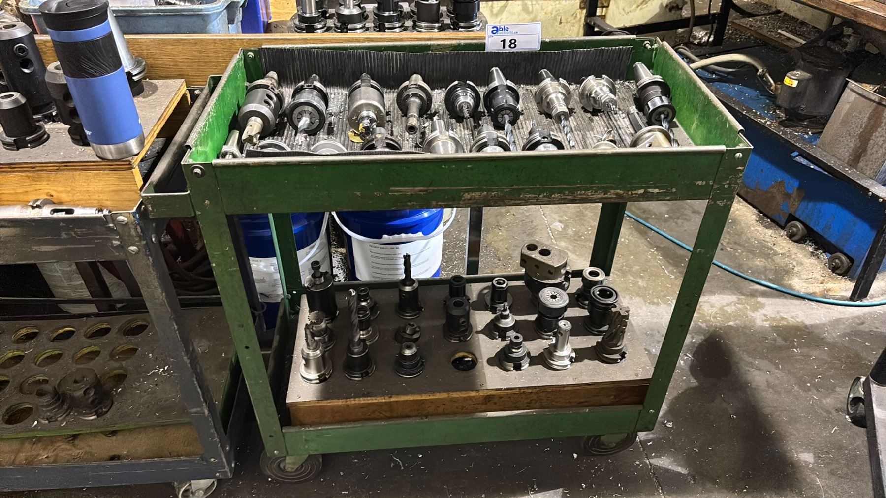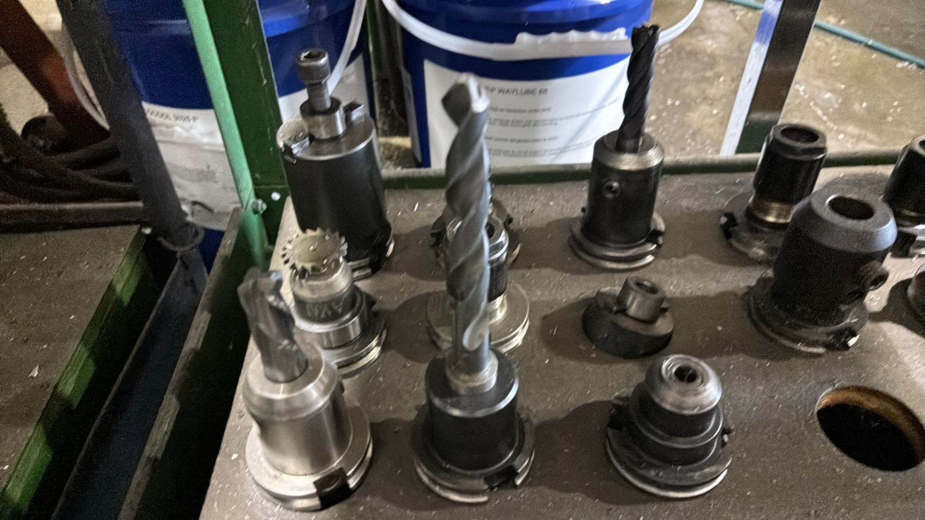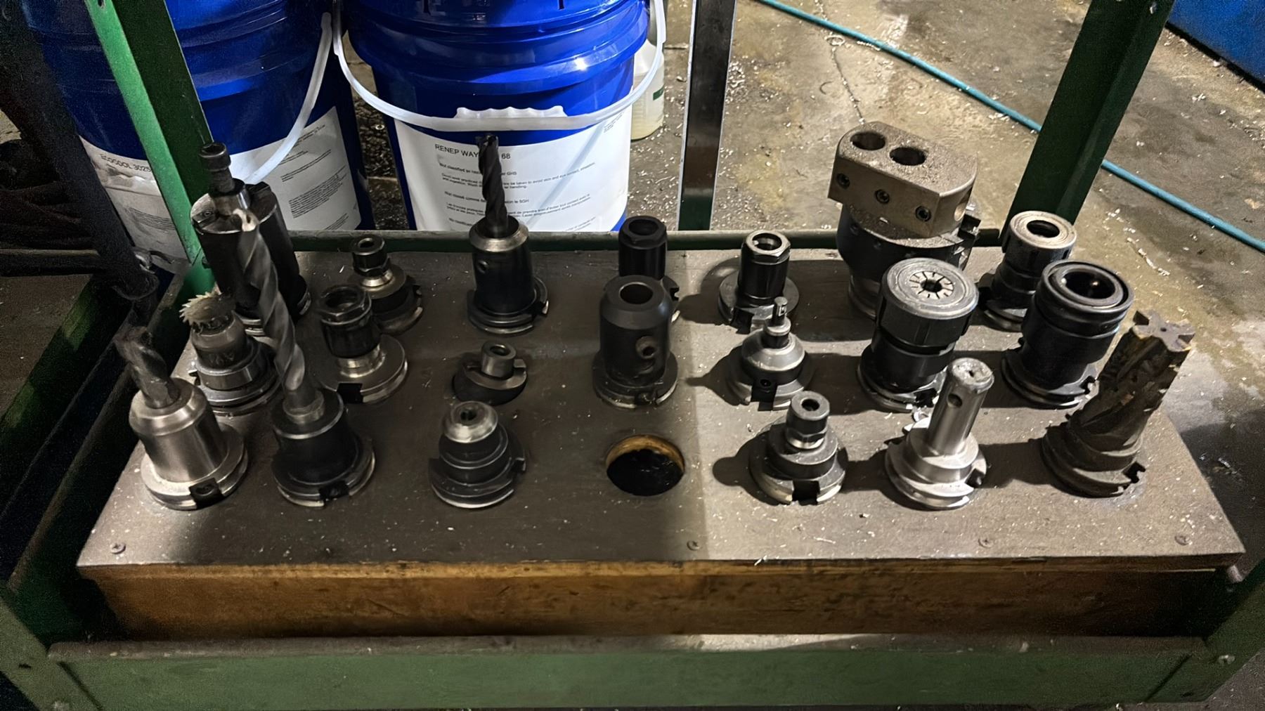 2 TIER MOBILE PRODUCT CART WITH ASSORTED COMMERCIAL INDUSTRIAL CNC MACHINE TOOLING / HEADS