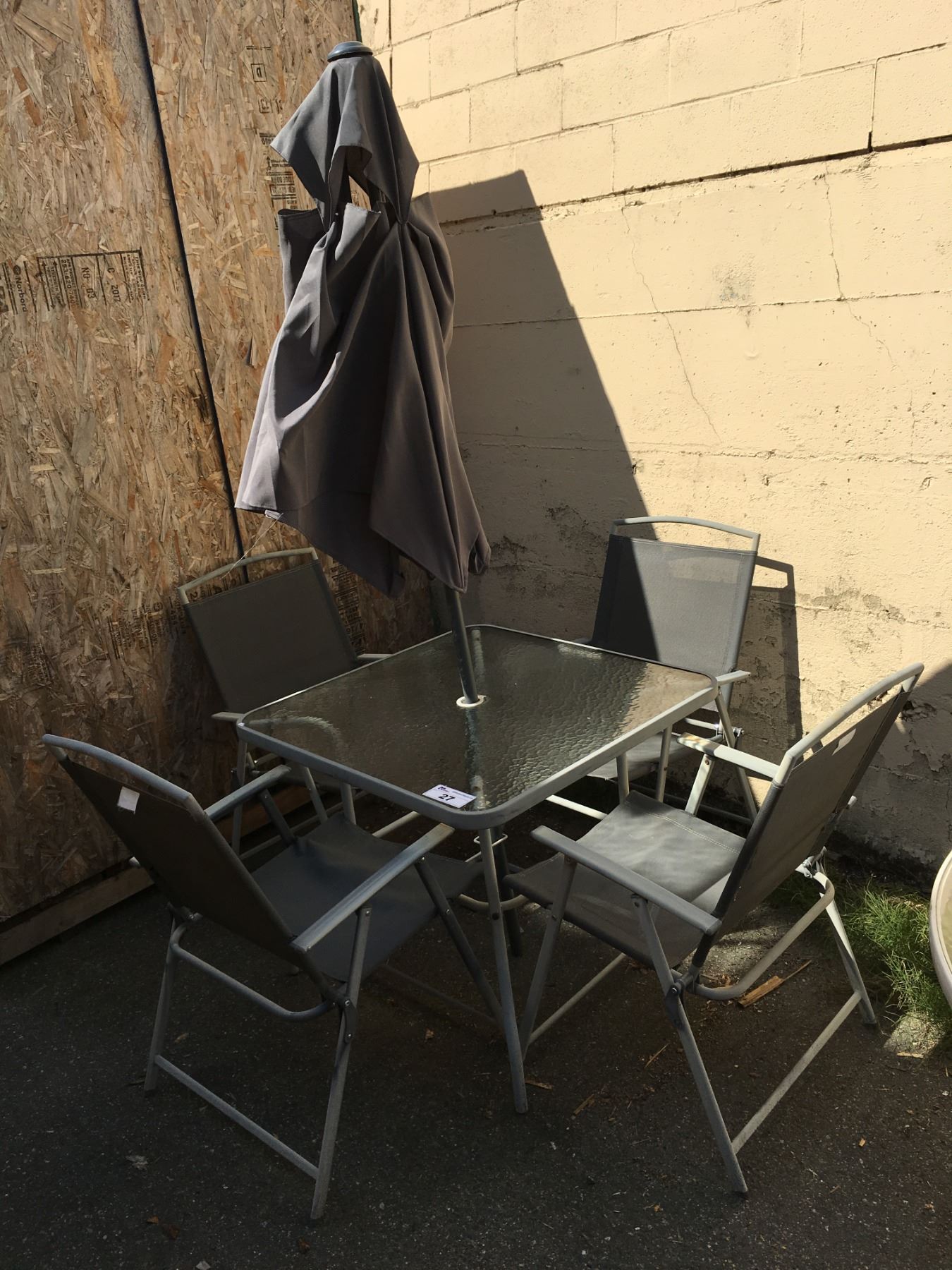 2 TONE GREY 6 PCE OUTDOOR PATIO SET - TABLE WITH UMBRELLA & 4 CHAIRS (2 CHAIRS NEED 2 BOLTS)