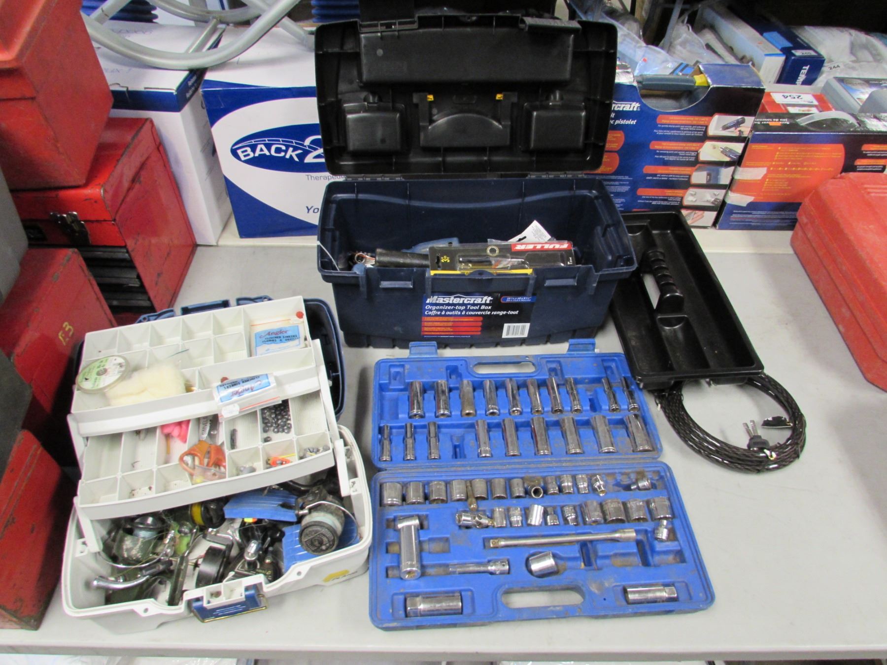 2 TOOL BOXES & CONTENTS (MASTERCRAFT SCREWDRIVER SET, HAMMER, FISH TACKLE, ETC), WESTWARD SOCKET SET, MASTER LOCK