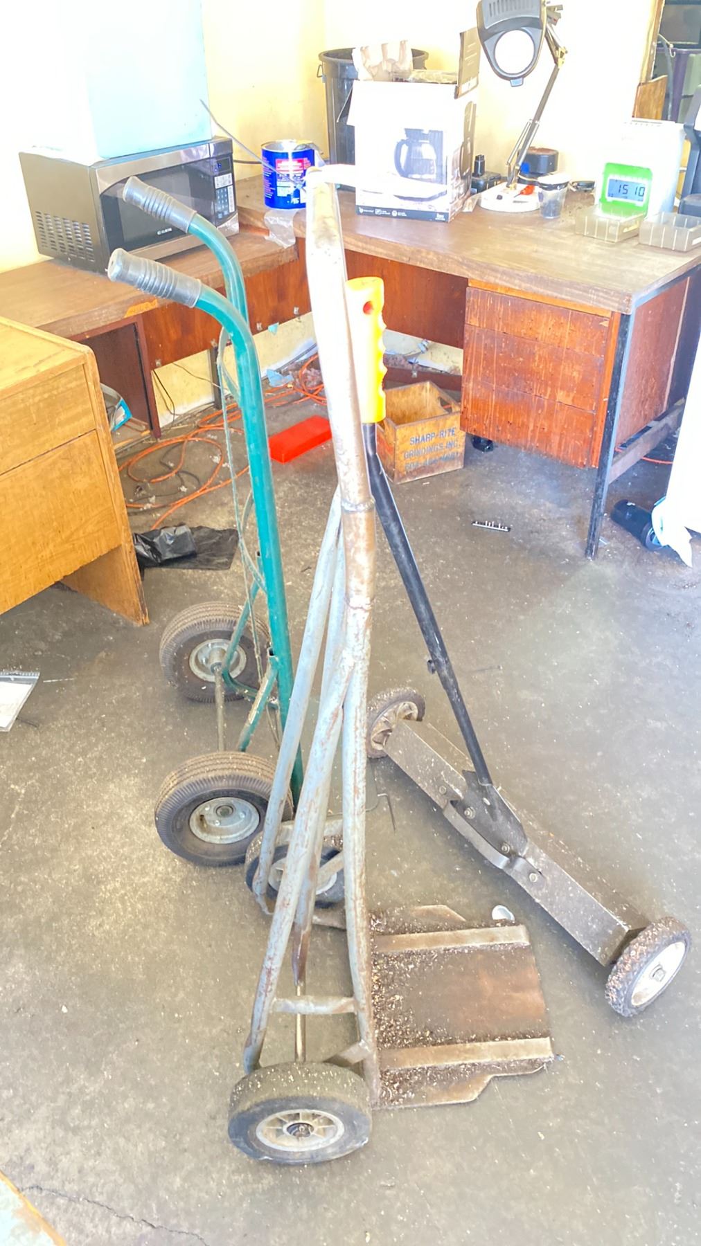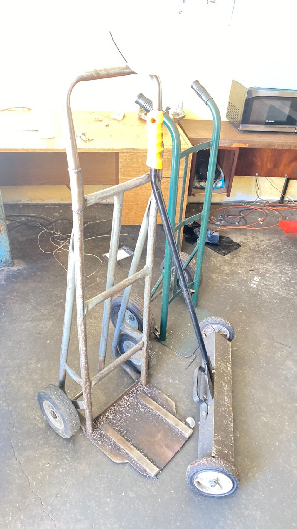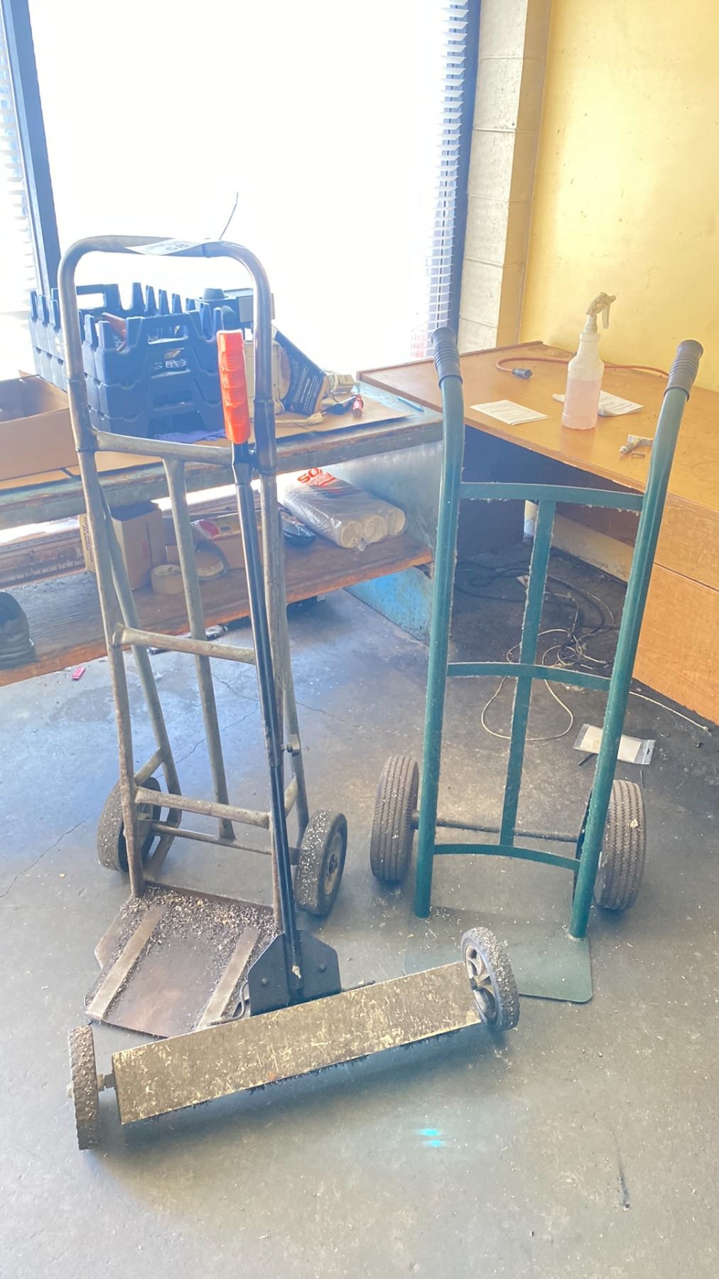 2- TWO WHEEL MOVER DOLLIES AND ONE MAGNETIC SWEEPER ON WHEELS