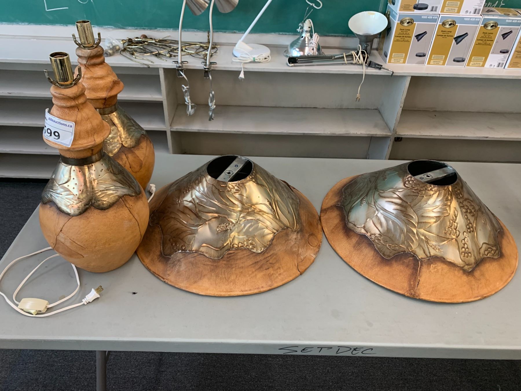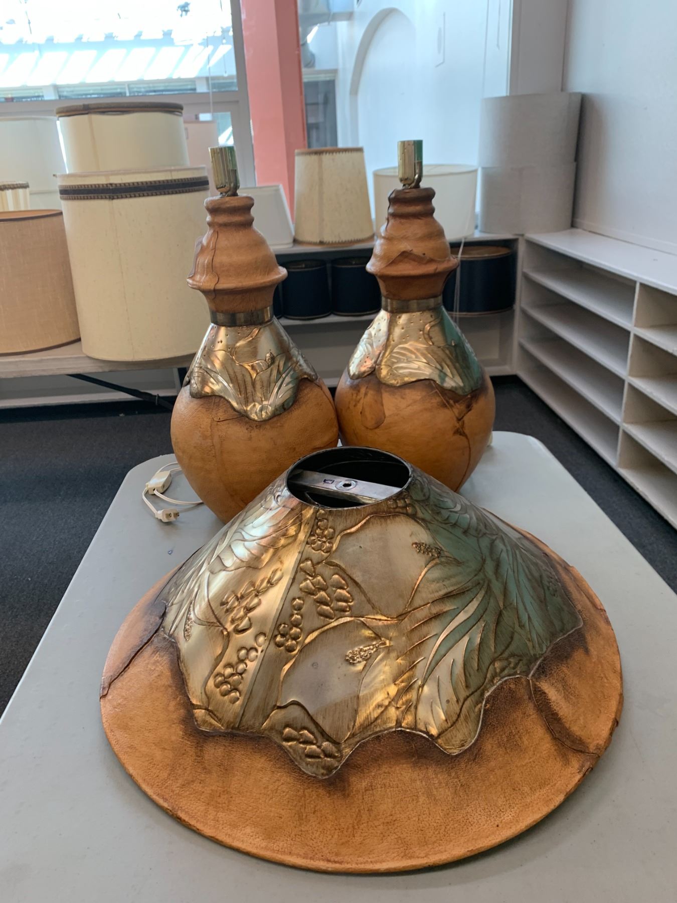 2 VINTAGE TIN & LEATHER WRAPPED LAMPS WITH SHADES