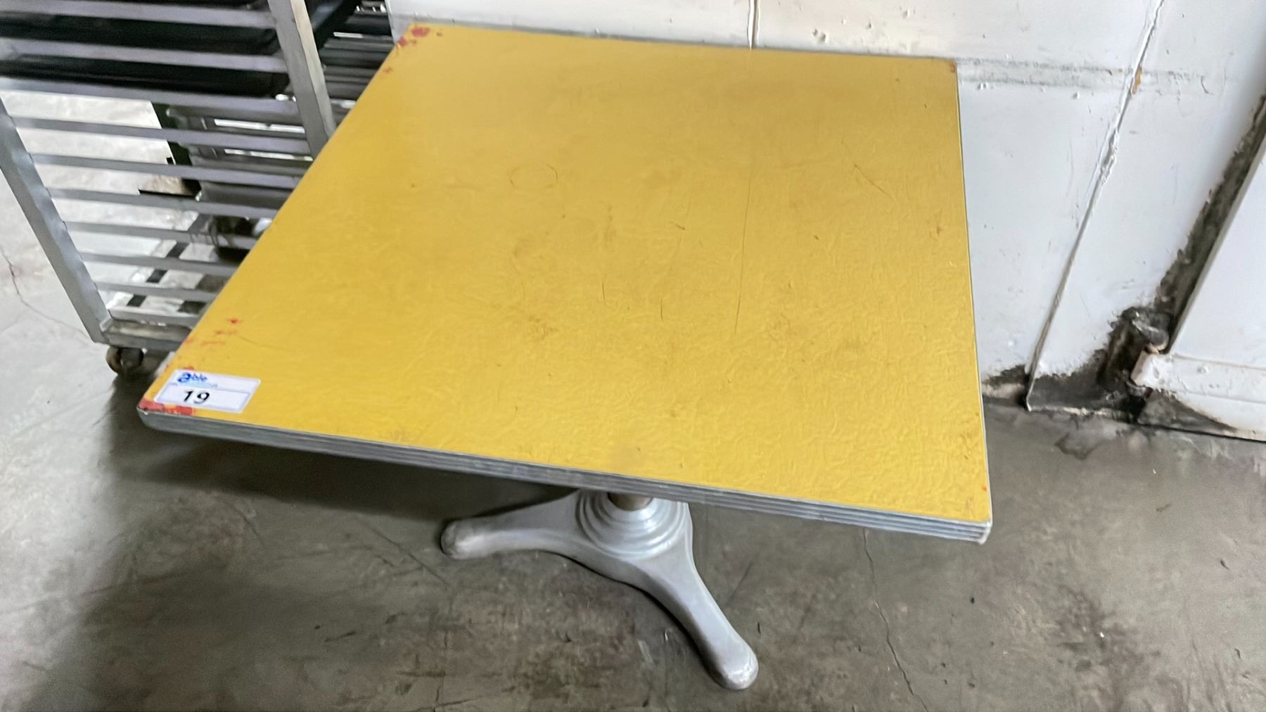 2 VINTAGE YELLOW TOP SILVER METAL BASE CAFE TABLE 36"W X 36"D X 30"H
