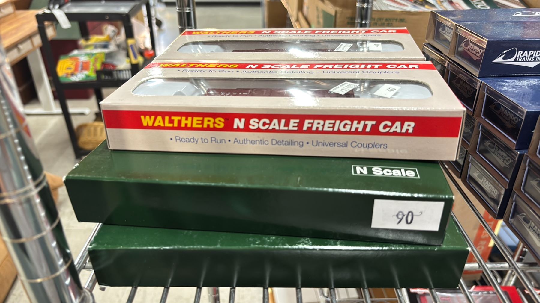(2) WALTHERS N SCALE FREIGHT CARS, KATO PRECISION RAILROAD MODELS N SCALE SMOOTH SIDE PASSENGER CAR VIA RAIL 6-CAR SET & 4-CAR ADD-ON SET MODEL TRAINS