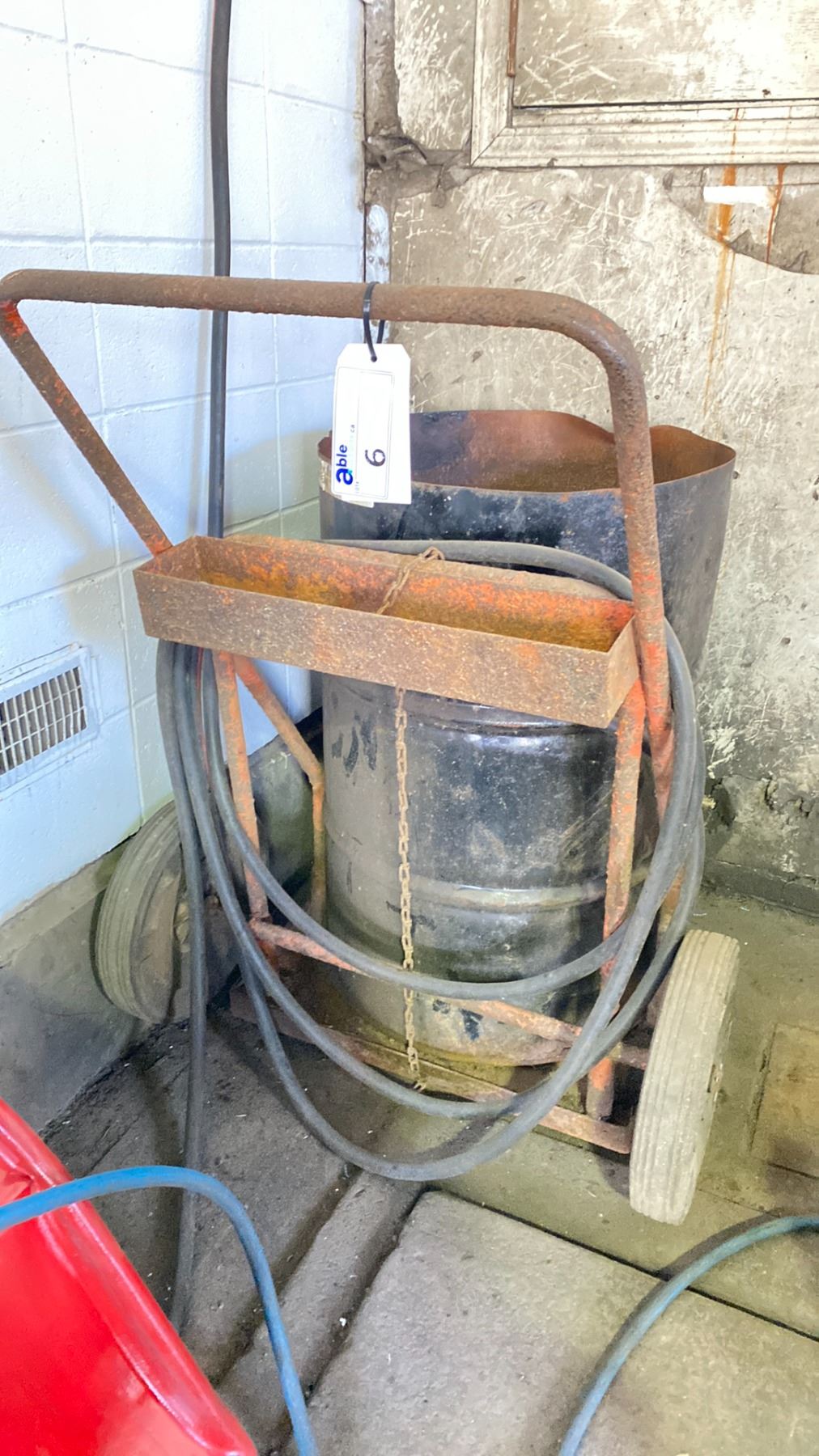 2 WHEEL CART WITH 45 GALLON DRUM AND WATER HOSE