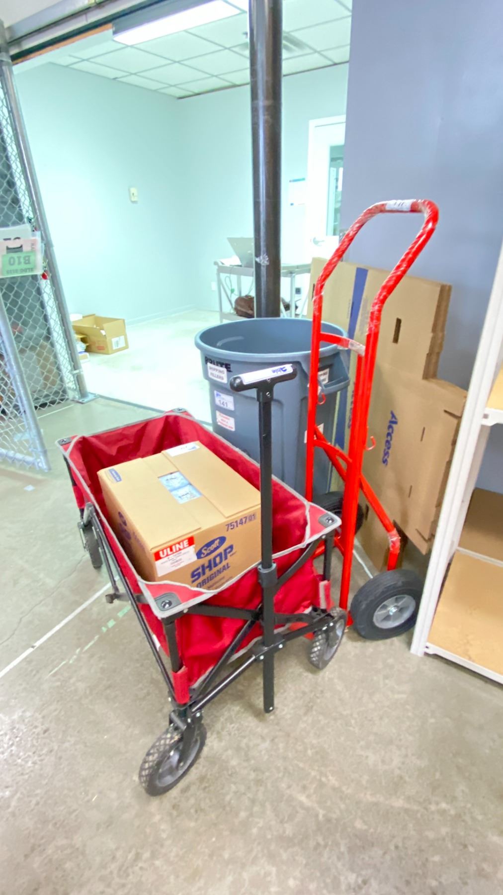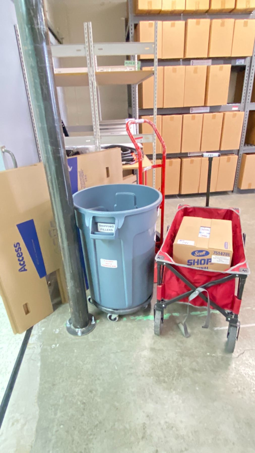 2 WHEEL DOLLY BRUTE ROLLING GARBAGE BIN, CASE OF SCOTT ORIGINAL SHOP TOWELS AND COLLAPSIBLE WAGON